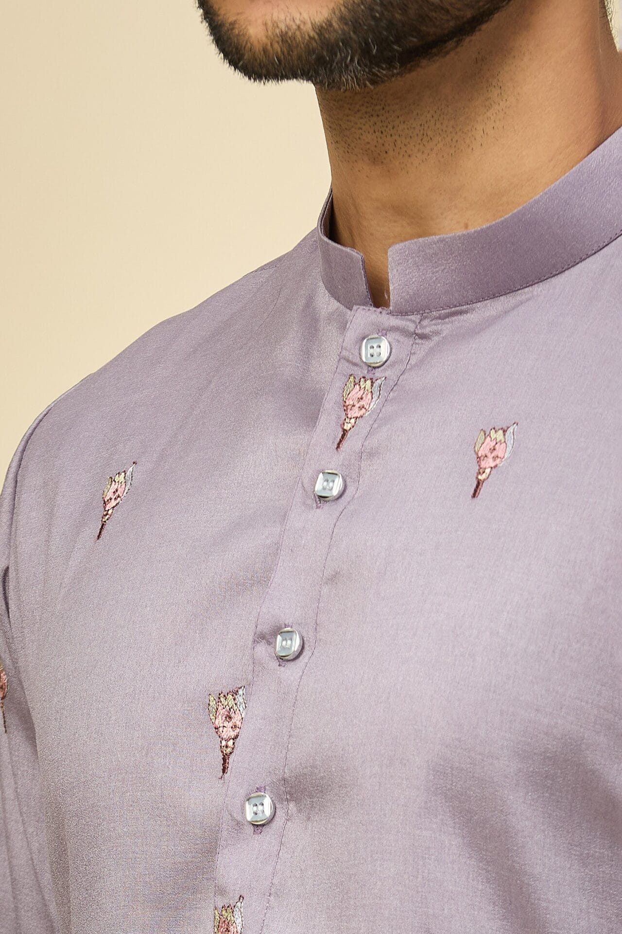 Purple crepe silk based kurta enhanced with resham embroidery, paired with an off white dupion silk based mexican pants.