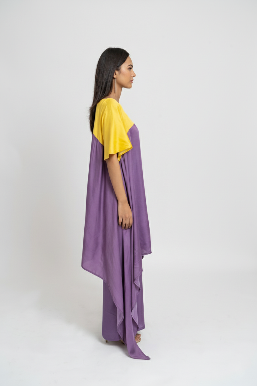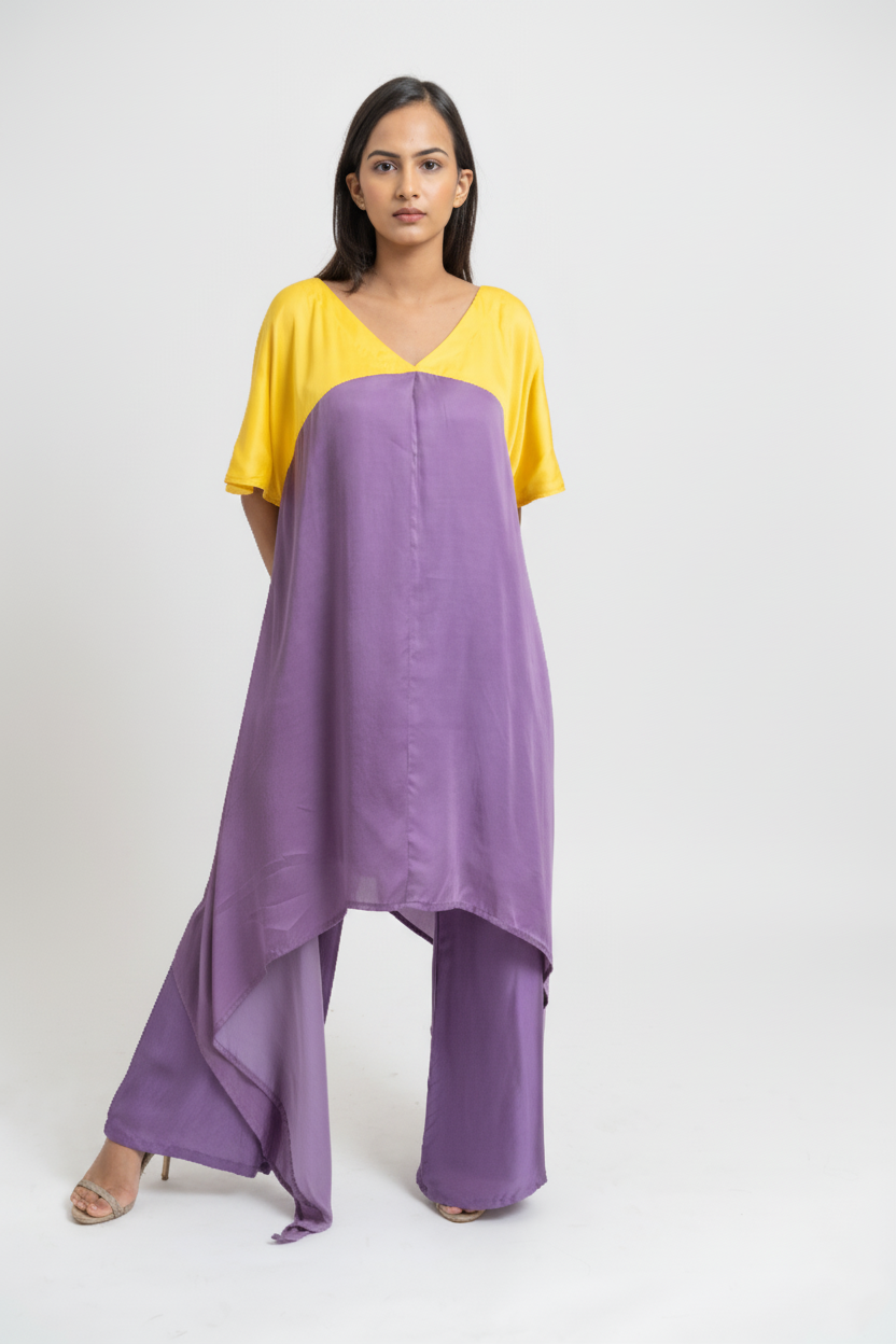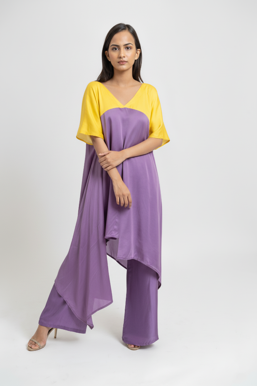 The Purple and Yellow Colorblocked Asymmetrical Tunic pairs boldly contrasting colors with a modern asymmetrical design. Complemented by wide-legged Purple Pants, this ensemble exudes contemporary flair and effortless style. Ideal for both casual outings and special occasions, it combines vibrant sophistication with comfortable elegance.