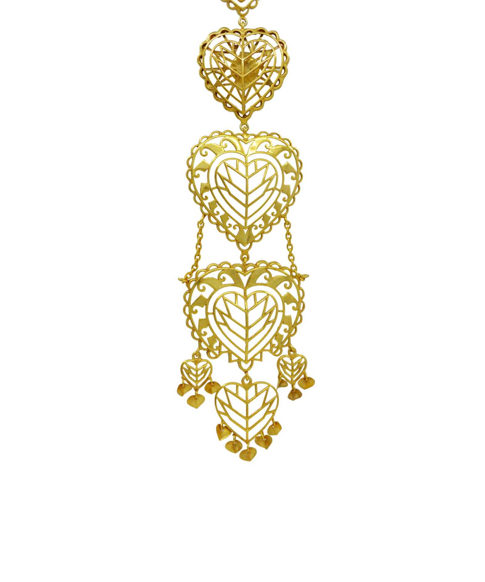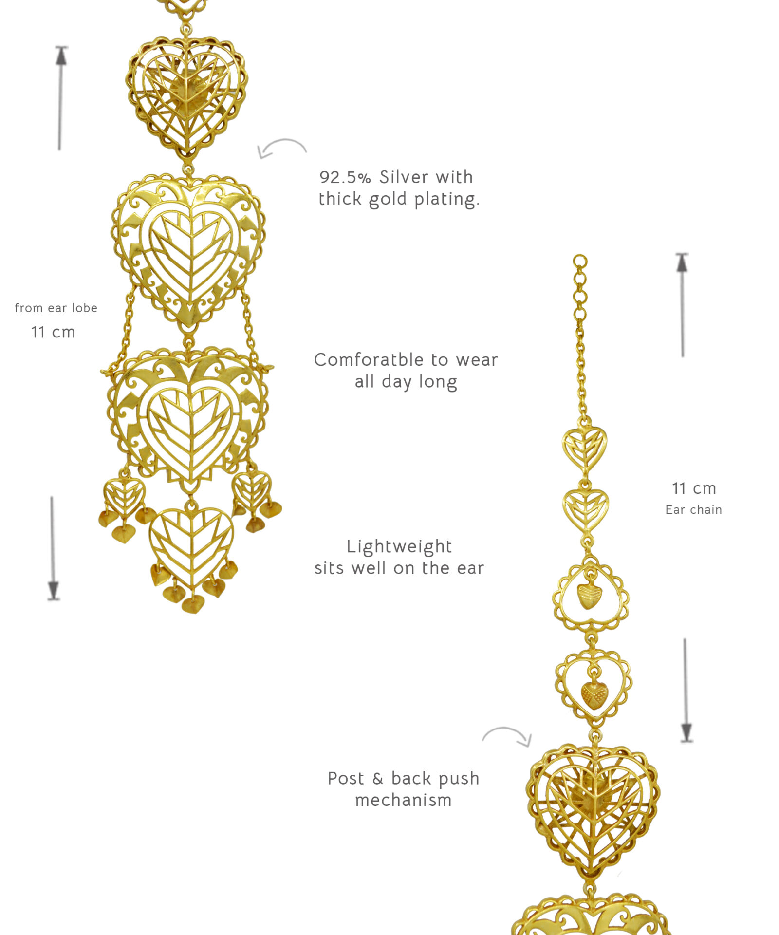 Golden Heart Long Earrings Crafted in 925 sterling silver with a luxurious thick gold plating, these long earrings feature a cascading series of intricately detailed hearts, each adorned with fine artistry and scalloped edges. The graceful drop design creates movement and drama, making them the perfect statement piece for festive occasions or evening wear. Lightweight yet striking, they bring together tradition and modern elegance in every detail., Plating: Gold Plated, Metal Type: 92.5% Sterling Silver, Enamel / plating / gemstone: N/A, Lock Mechanism: Post and push back, Measurement cm : Total Length: 22 cm, Measurement inches: Total Length: 8.66 inches, Care Instruction: Keep away from water, perfume and other liquids. Do not use any cleaning agents. Clean when storing in the provided pouches. Store them in moisture free areas and keep them away from water and liquid fragrances.