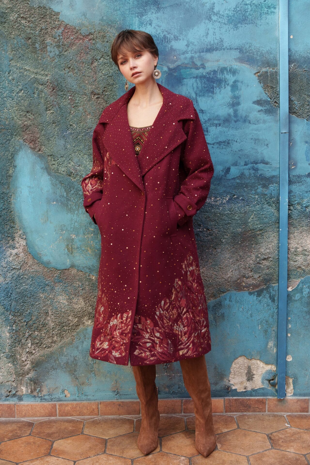 Red twill woven trench with printed satin applique with all over galaxy beaded and sequence embroidered