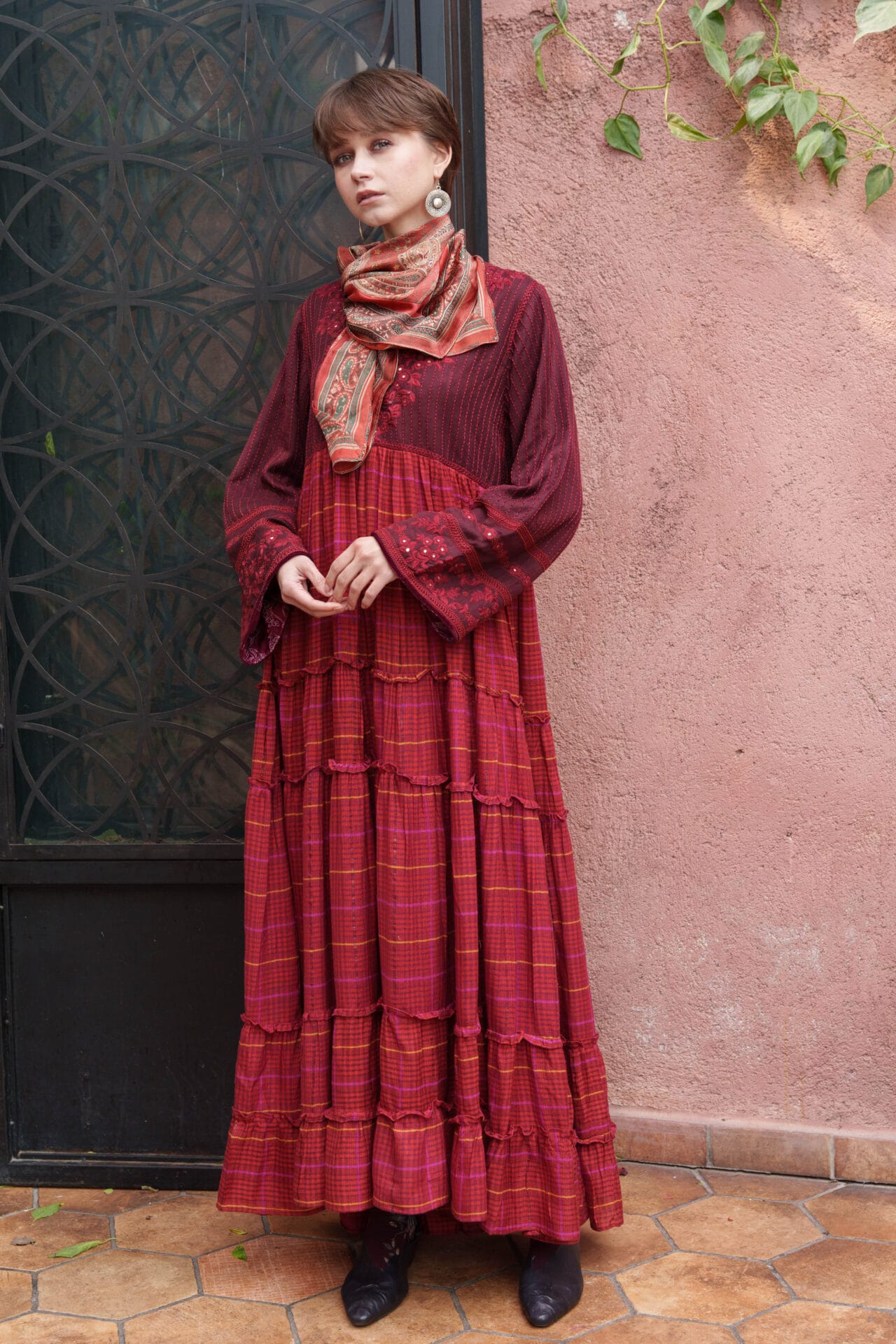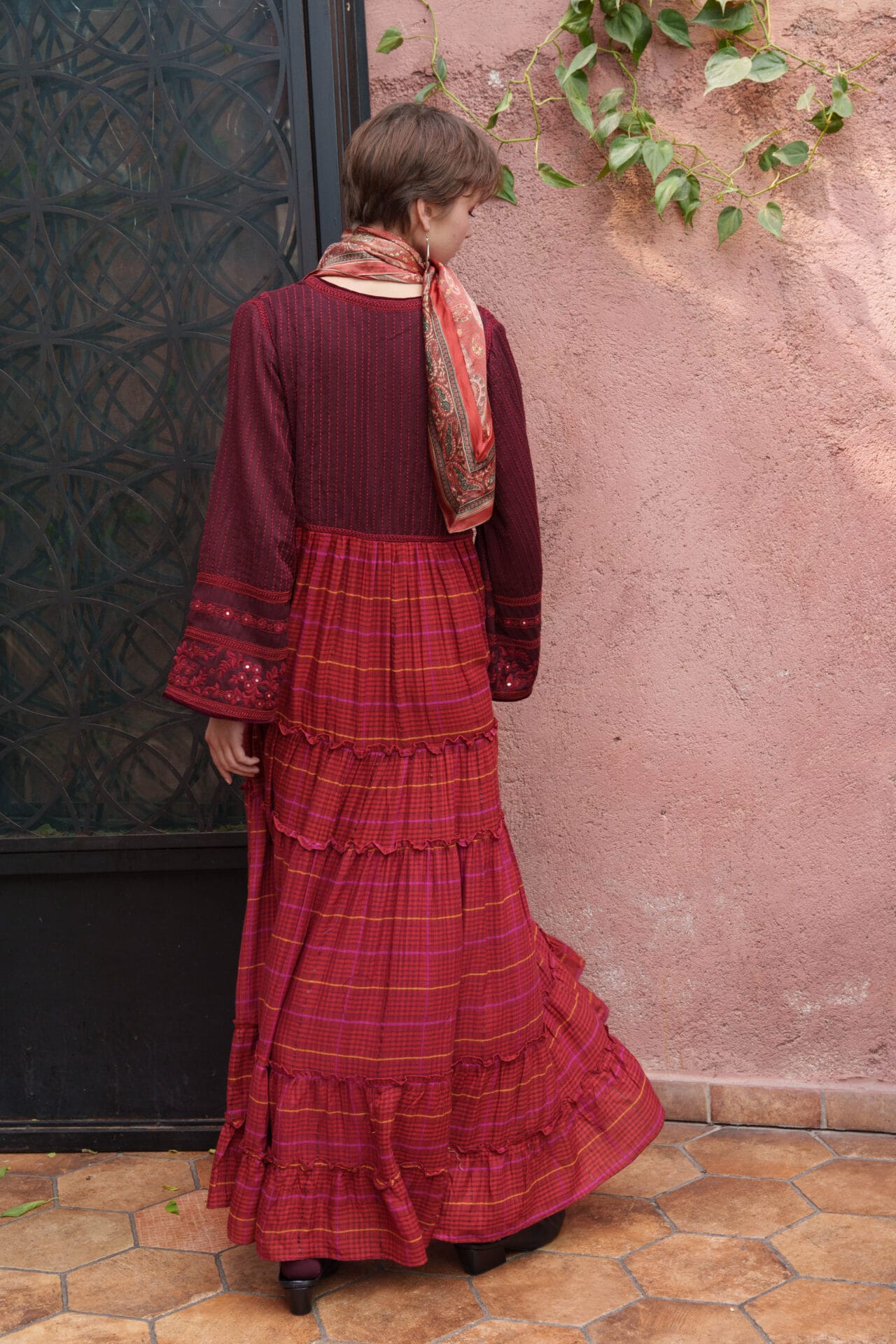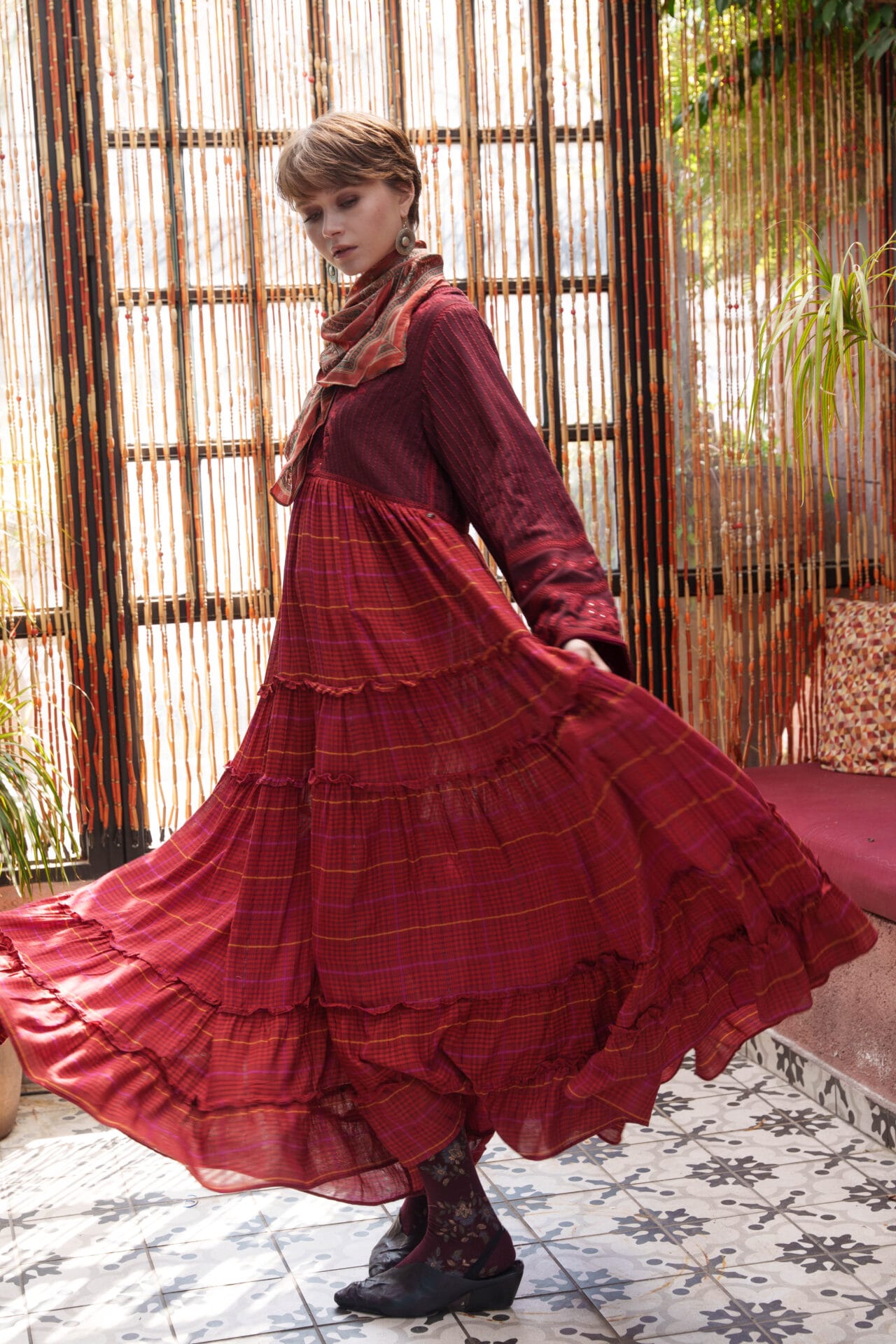 Red cotton woven checks maxi with tiered maxi with mirror embroidered bodice and cross stitch embroidered sleeves