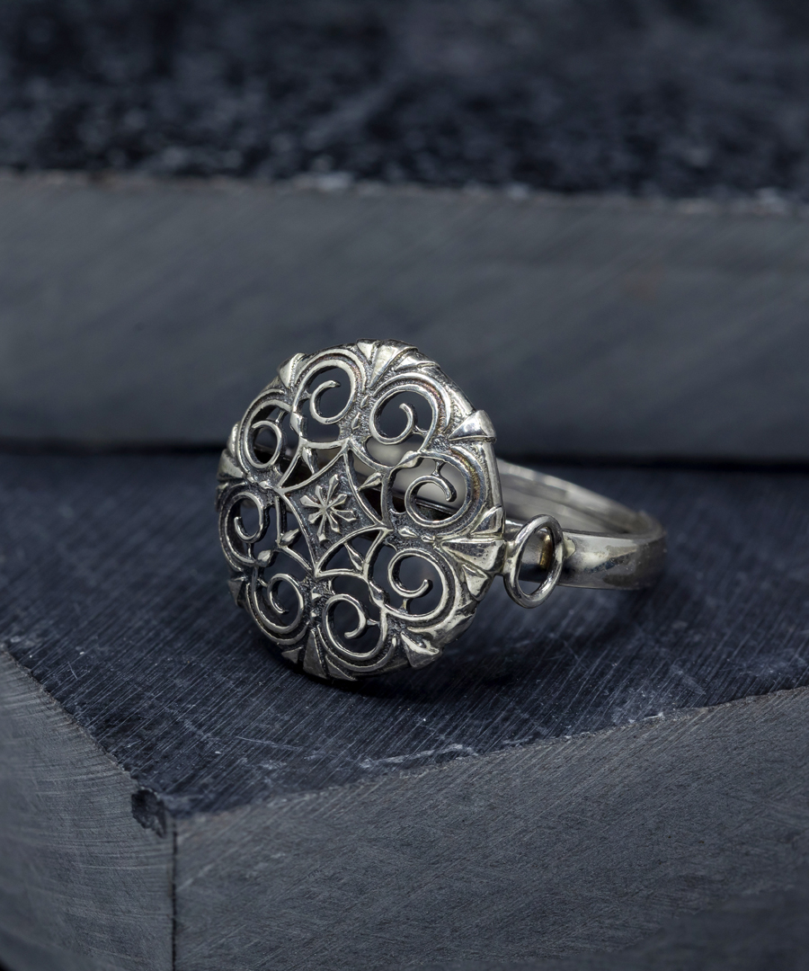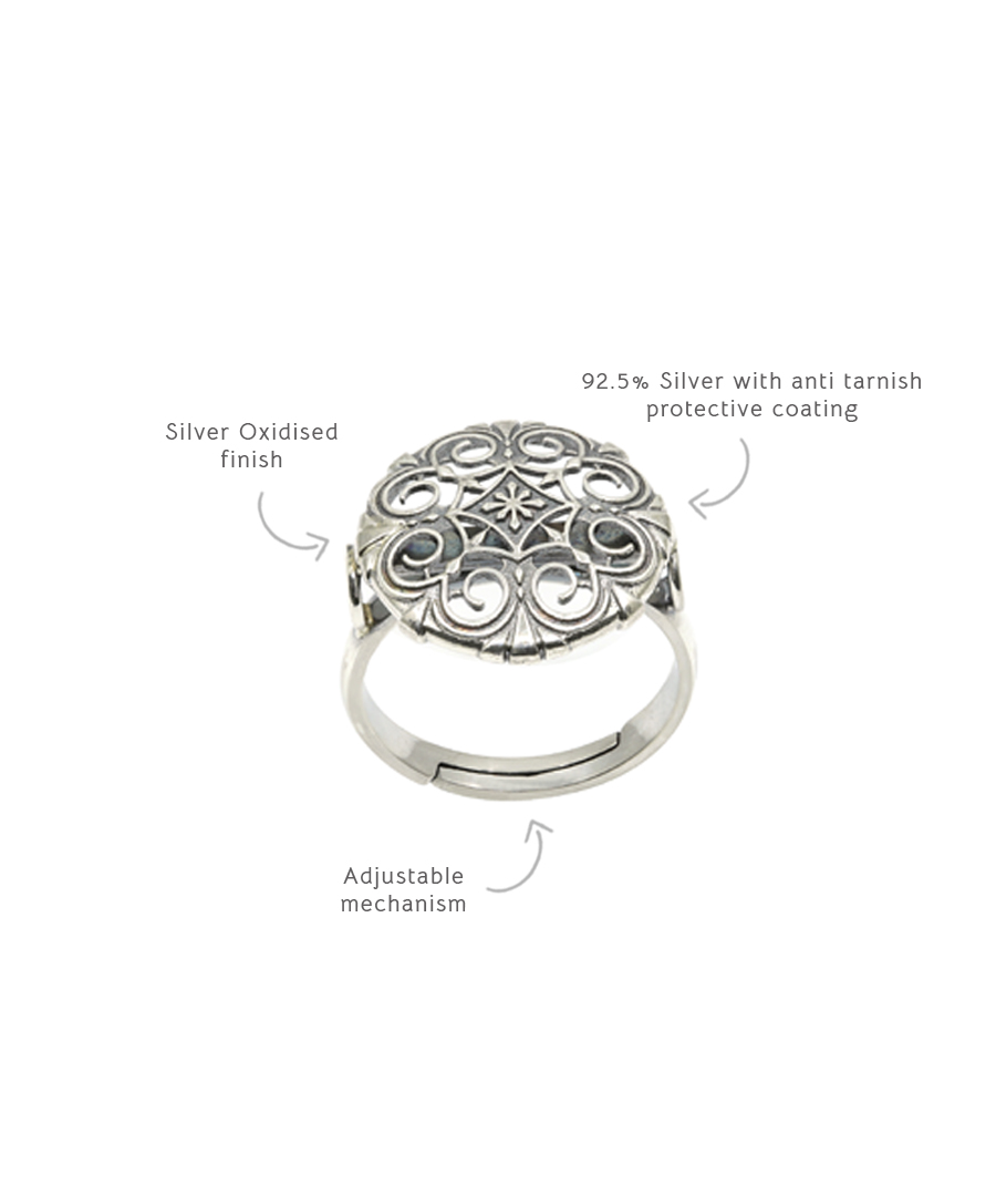 Raitt binti is a statement ring, its top measures 2.2 cm and is adjustable ring size. The ring is handcrafted in 92.5% silver,with anti tarnish coating & has delicate lattice details with a silver oxidized finish., Plating: Silver Ani-tarnish with oxide finish, Metal Type: 92.5% Sterling Silver, Enamel / plating / gemstone: Silver oxidised, Lock Mechanism: Adjustable Ring, Measurement cm : Top diameter – 1.77cm, Measurement inches: Top diameter – 0.69 inch, Care Instruction: Keep away from water, perfume and other liquids. Do not use any cleaning agents. Clean when storing in the provided pouches. Store them in moisture free areas and keep them away from water and liquid fragrances.