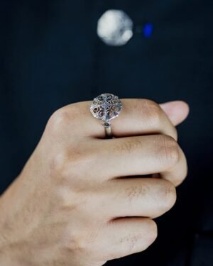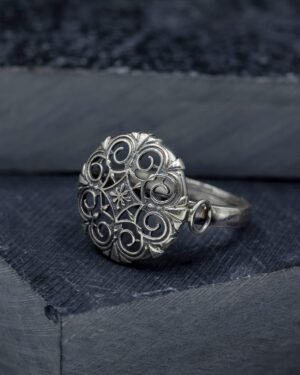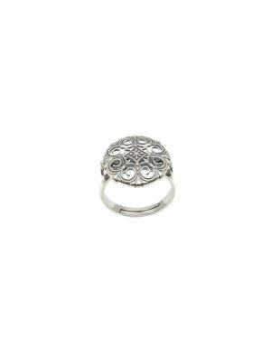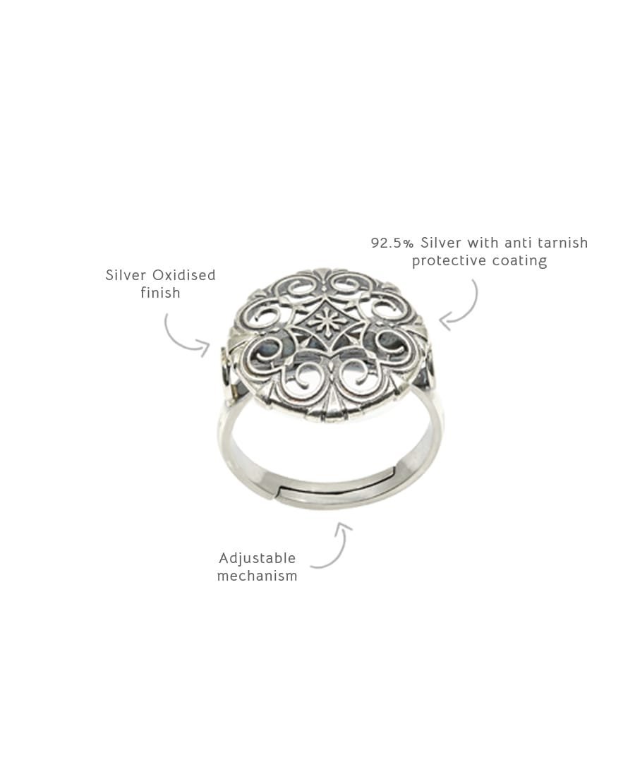 Raitt binti is a statement ring, its top measures 2.2 cm and is adjustable ring size. The ring is handcrafted in 92.5% silver,with anti tarnish coating & has delicate lattice details with a silver oxidized finish., Plating: Silver Ani-tarnish with oxide finish, Metal Type: 92.5% Sterling Silver, Enamel / plating / gemstone: Silver oxidised, Lock Mechanism: Adjustable Ring, Measurement cm : Top diameter - 1.77cm, Measurement inches: Top diameter - 0.69 inch, Care Instruction: Keep away from water, perfume and other liquids. Do not use any cleaning agents. Clean when storing in the provided pouches. Store them in moisture free areas and keep them away from water and liquid fragrances.