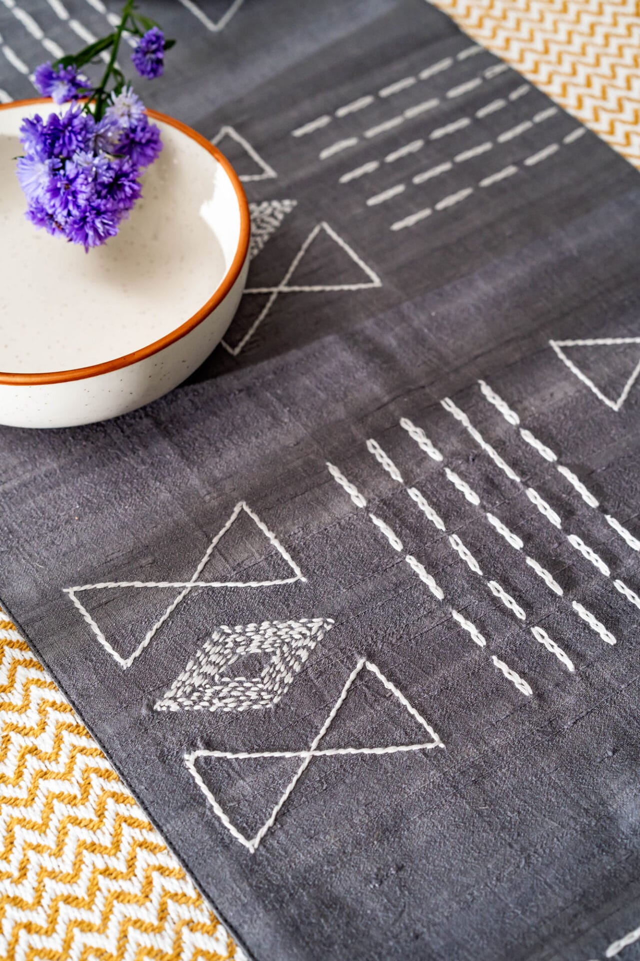Reverberancela celebrates the joy of victory. It is a handwoven silk runner with strips, ties and hand embroidery. Mapuche art is the theme with tribal naga star stitches and represents the beautiful tune of the Naga log drum.