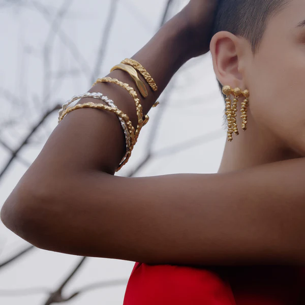 Its rocky, textured design gives it a contemporary, artistic look that complements both casual and formal outfits. The bangle’s versatile design makes it perfect for layering with other bracelets or wearing solo as a statement piece.