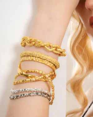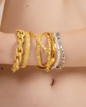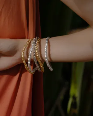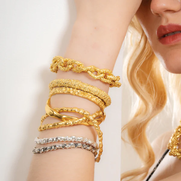 Add a touch of elegance and sophistication to your accessory collection with the Rocky Outmodeled Bangle. Expertly handmade from premium brass alloy and available in Silver, 22KT Gold plating, or Oxidised, this bangle is designed for durability, comfort, and style.Its rocky, textured design gives it a contemporary, artistic look that complements both casual and formal outfits. The bangle’s versatile design makes it perfect for layering with other bracelets or wearing solo as a statement piece.Whether you prefer the classic shine of silver, the luxurious warmth of 22KT gold, or the vintage hue of Oxidised, this bangle provides a high-end look at an accessible price point. Its lightweight structure ensures comfort throughout the day while maintaining long-lasting shine.This bangle is an ideal gift for birthdays, anniversaries, or personal milestones, appealing to women who love modern, handcrafted, statement jewelry. Make a bold impression with a bangle that blends artistry, elegance, and premium quality materials.Key