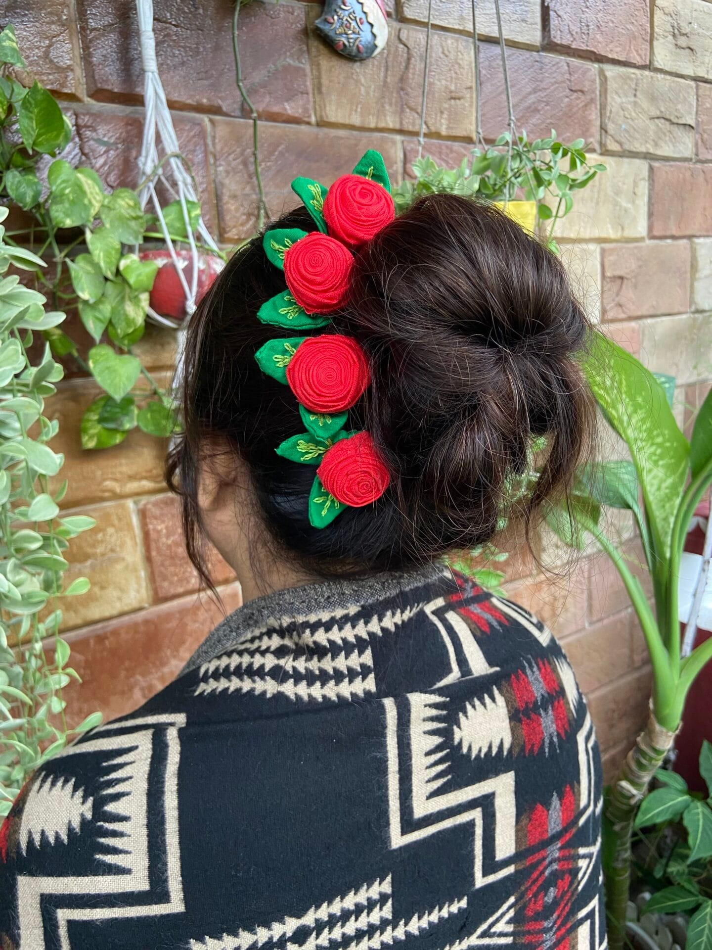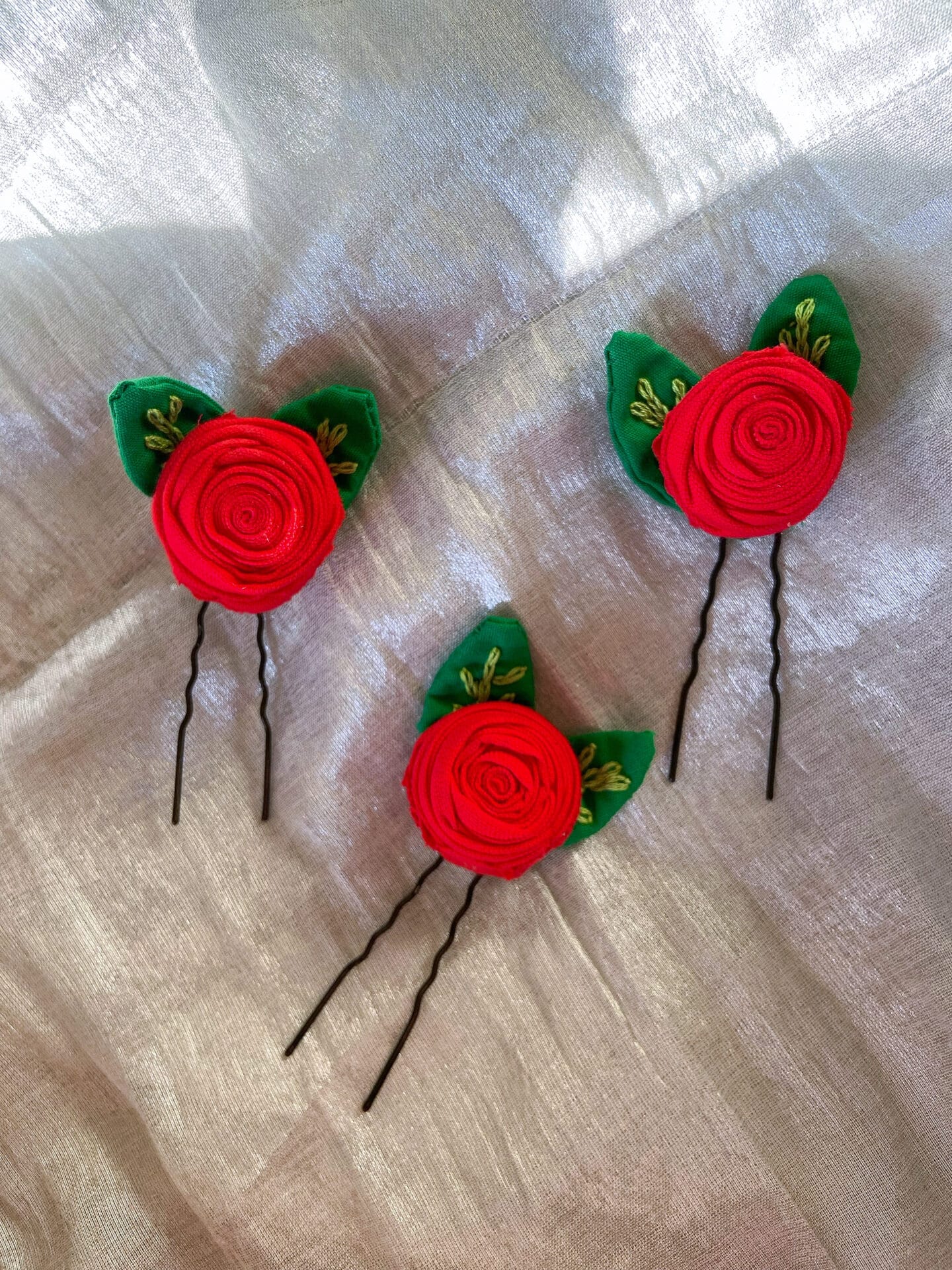 Our Rose hairpin, crafted by skilled women artisans of Hutke, showcases the intricate artistry of textile design. Each hairpin features a vibrant red rose, symbolizing beauty and passion, and is elegantly finished with a pair of delicate leaves that enhance its overall charm. This exquisite accessory is perfect for elevating any hairstyle, adding a touch of elegance and sophistication to your look. Embrace the craftsmanship and creativity behind this unique piece, making it a must-have for accessory enthusiasts.