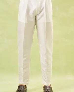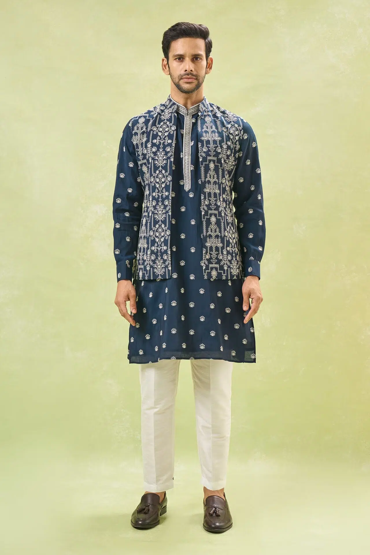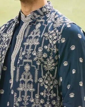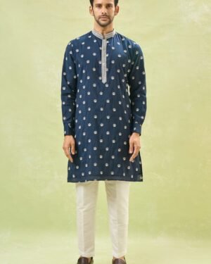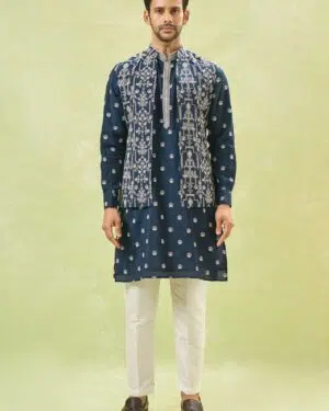 Royal blue cotton silk based jacket enhanced with white dori embroidery, paired with a matching cotton silk based kurta enhanced with dori embroidery and an off white dupion silk based pants.