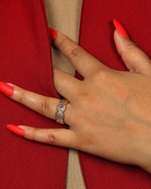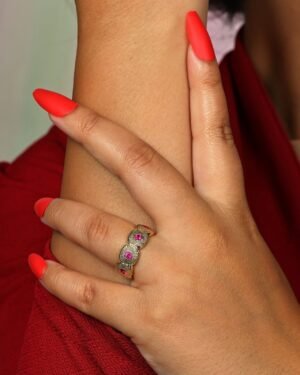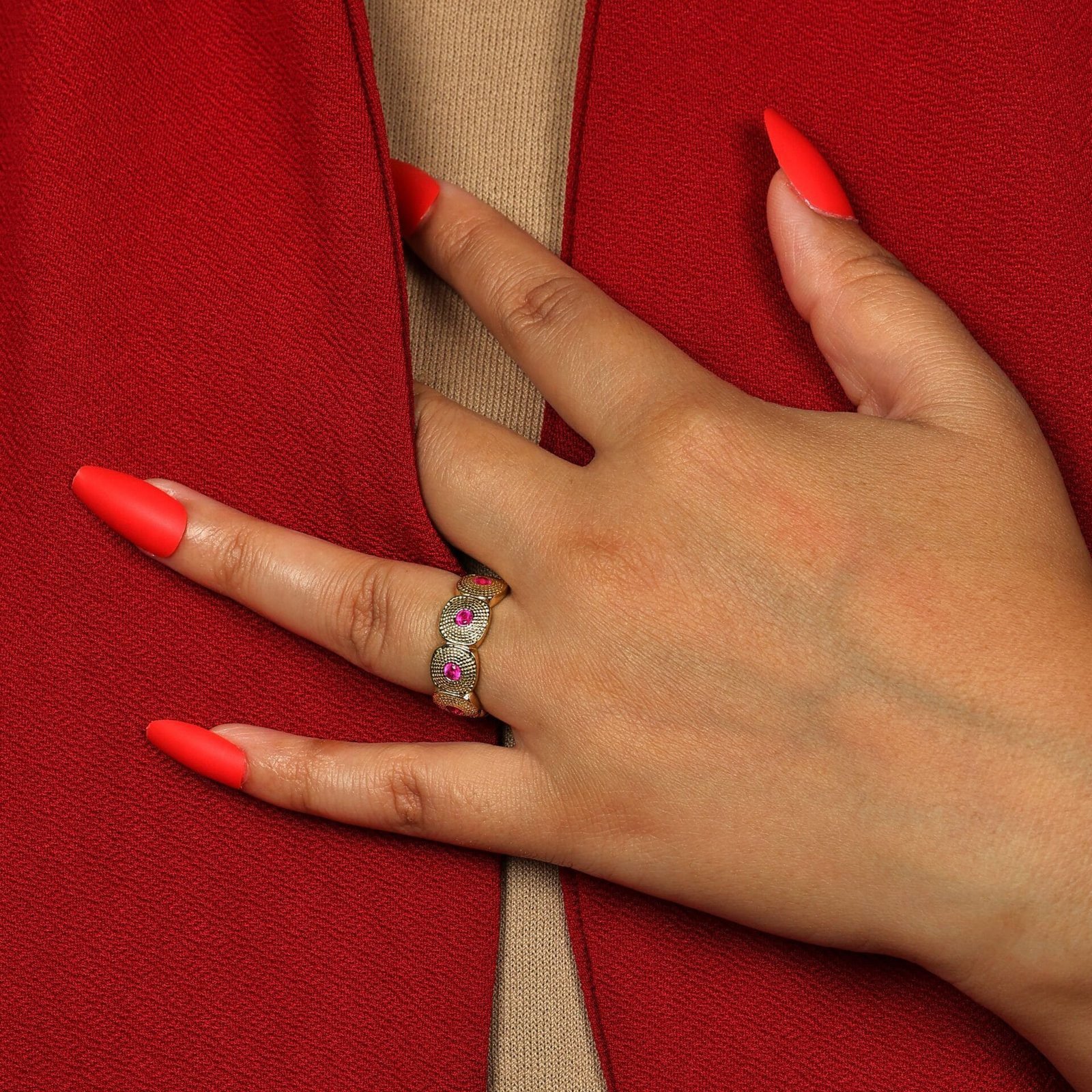 Indulge in timeless sophistication with the Ruby Row Eternity Band Ring. Showcasing a seamless line of radiant ruby-toned stones, this elegant band symbolizes passion, strength, and enduring beauty.Crafted with a durable premium brass alloy base and enhanced with 22KT real gold plating, the ring offers a luxurious golden finish while remaining lightweight and comfortable for all-day wear. The eternity band design ensures continuous sparkle, making it a refined statement piece from every angle.Key features:Classic ruby row eternity band with rich red stone detailing22KT real gold plating for a premium, long-lasting shineHigh-quality brass alloy construction for durabilityNickel-free, skin-friendly, and lightweight designIdeal for daily wear, formal occasions, gifting, and celebrationsPerfect worn alone or stacked with other rings, this ruby eternity band adds depth and elegance to any jewelry look. A thoughtful gift choice for anniversaries, birthdays, festive occasions, or as a timeless addition to your own collection.