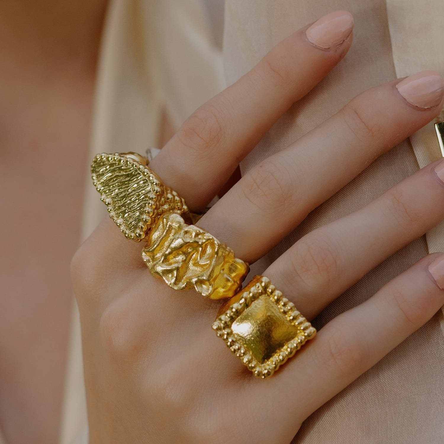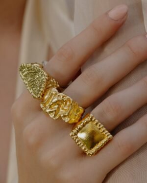 The Rugged Plateau Ring is a perfect blend of raw texture and refined luxury. Designed with a rugged plateau-inspired surface, this ring symbolizes strength, individuality, and confidence.Crafted using premium brass alloy and finished with 22KT real gold plating, it delivers the look of fine gold jewelry while remaining lightweight and durable. Its unisex design makes it ideal for both men and women, whether styled casually or with ethnic and formal outfits.This ring is skin-friendly, nickel-free, and lead-free, making it safe for long-hour wear. Whether you’re buying for yourself or gifting someone special, this piece stands out as a timeless accessory. Ideal for:Daily wearCouple ringsMinimal statement jewelry loversFestive & casual stylingThoughtful gifting