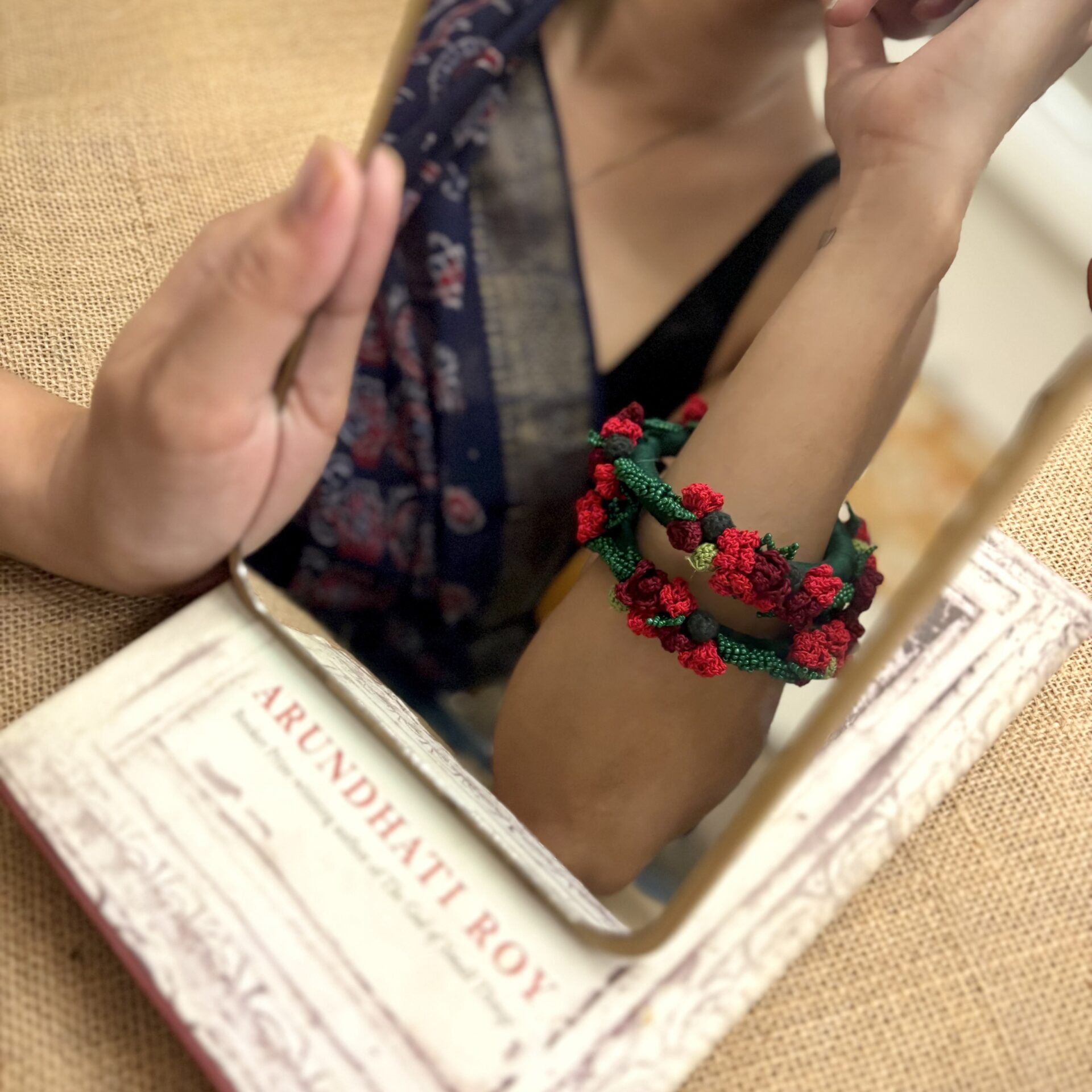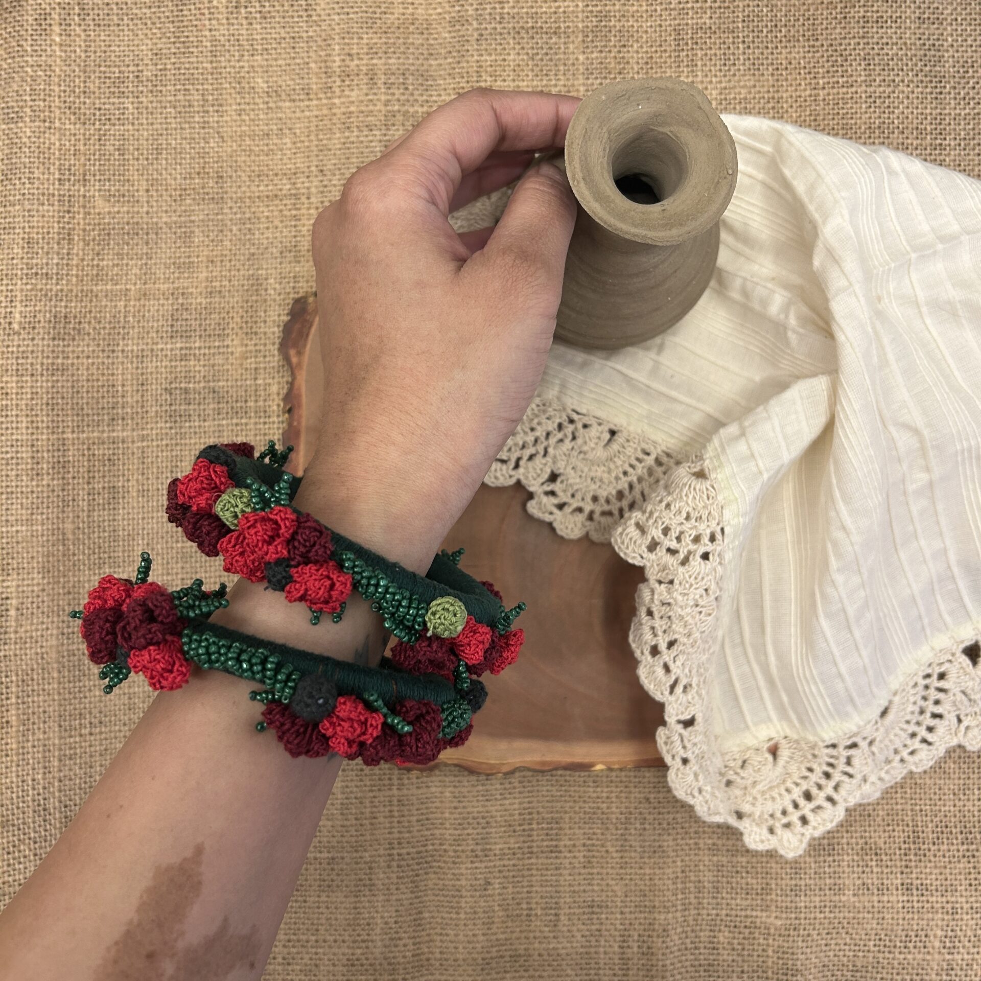 Soft petals meet woven charm ? our Rose Bangles are hand-crocheted with delicate blooms that rest gently on your wrists. Inspired by the quiet grace of garden mornings, each bangle carries the warmth of handmade craft and the joy of everyday adornment.