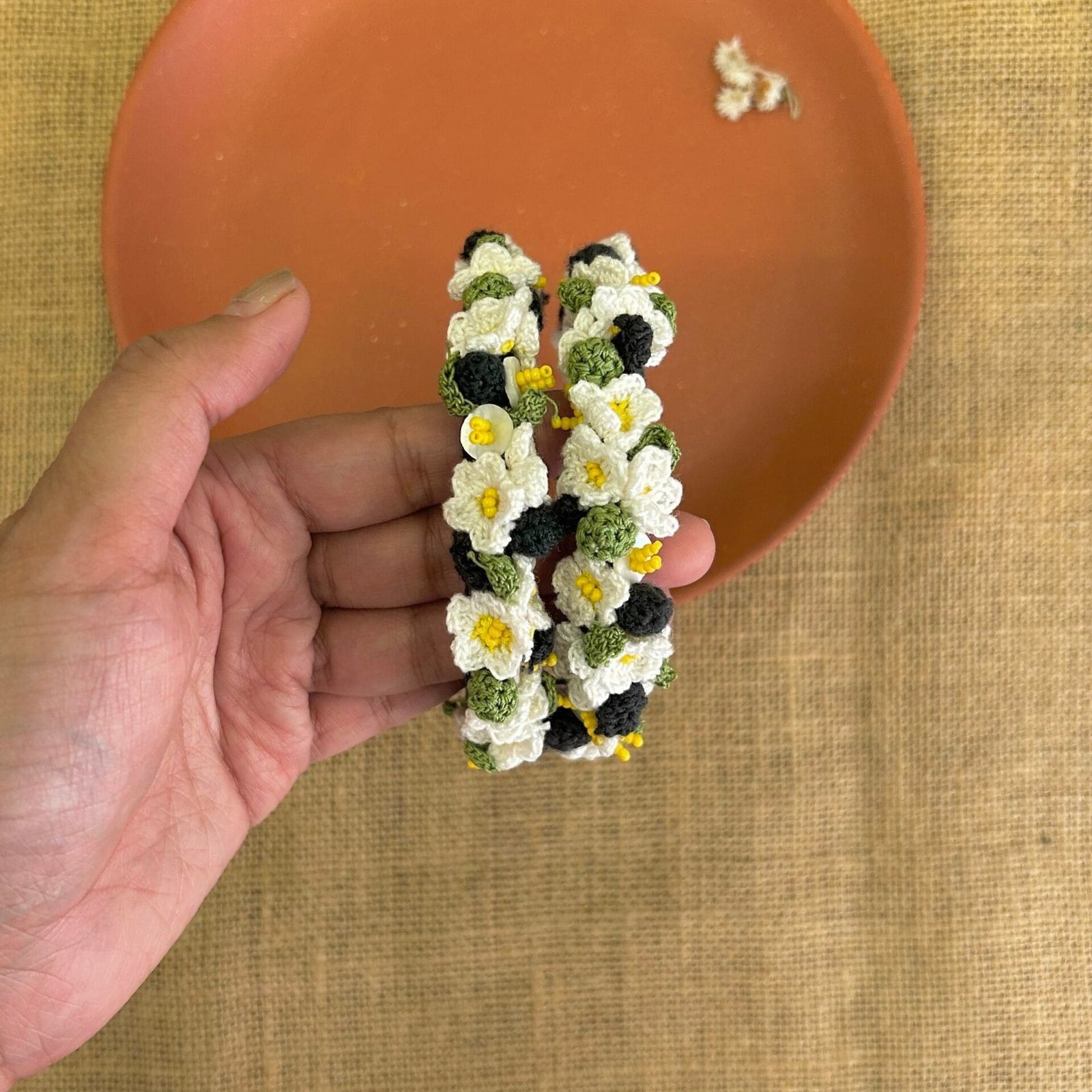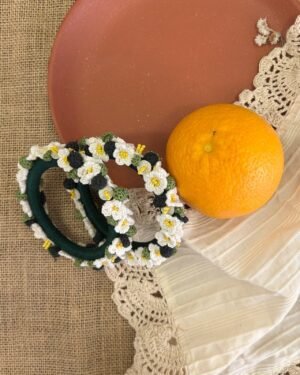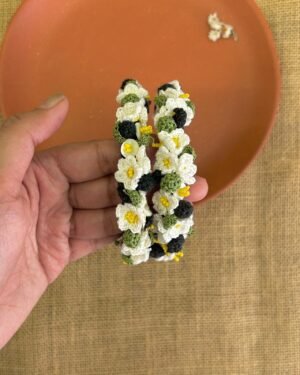 Fresh, delicate, and full of handcrafted charm ? these white daisy bangles bring a soft bloom to any look. Made on smooth rosewood bases, each bangle is adorned with hand-crocheted daisies, tiny crochet leaves, and bead details that add gentle texture. Yellow seed beads bring a sunny hint of colour, perfectly balancing the calm of the white petals.