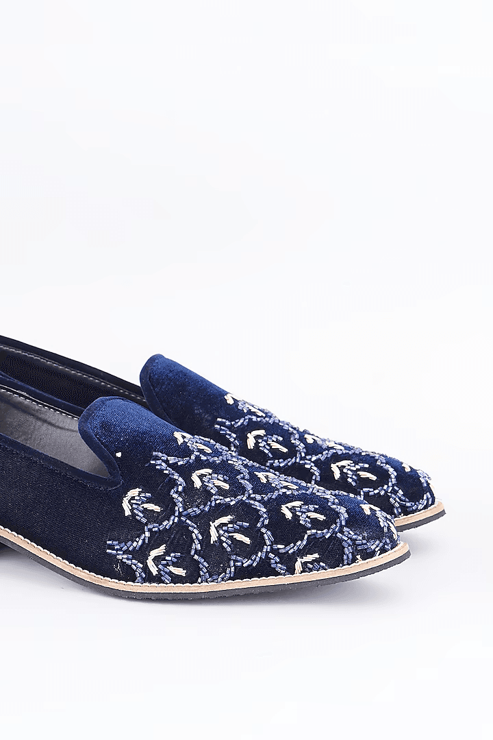 A pair of royal blue suede based slip on loafers enhanced with cut dana hand embroidery. It has a padded leather lining and a hard sheeted rubber sole.