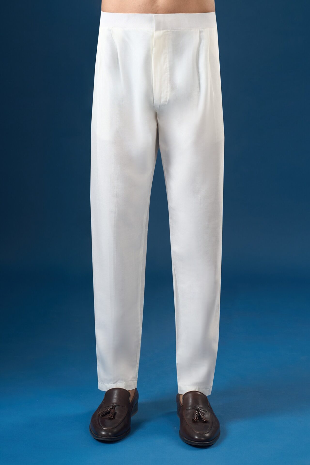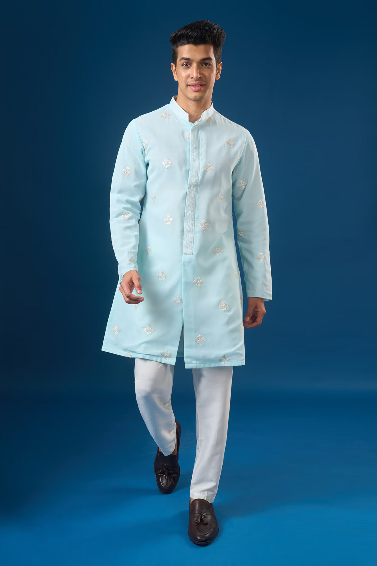 Sea blue georgette based kurta enhanced with thread and sequins embroidery paired with an off white dupion silk based mexican pants.