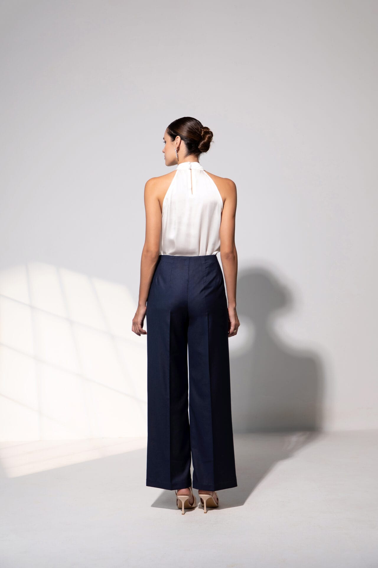 Modern, sleek, and effortlessly refined, this three-piece set blends structure with fluid movement. The round-neck top with a surplice back cutout, paired with tailored trousers, creates a polished silhouette, while the halter-neck blouse in satin adds an ethereal, feminine touch. Perfect for chic office moments, elevated luncheons, or evening gatherings, it embodies quiet confidence and contemporary elegance.