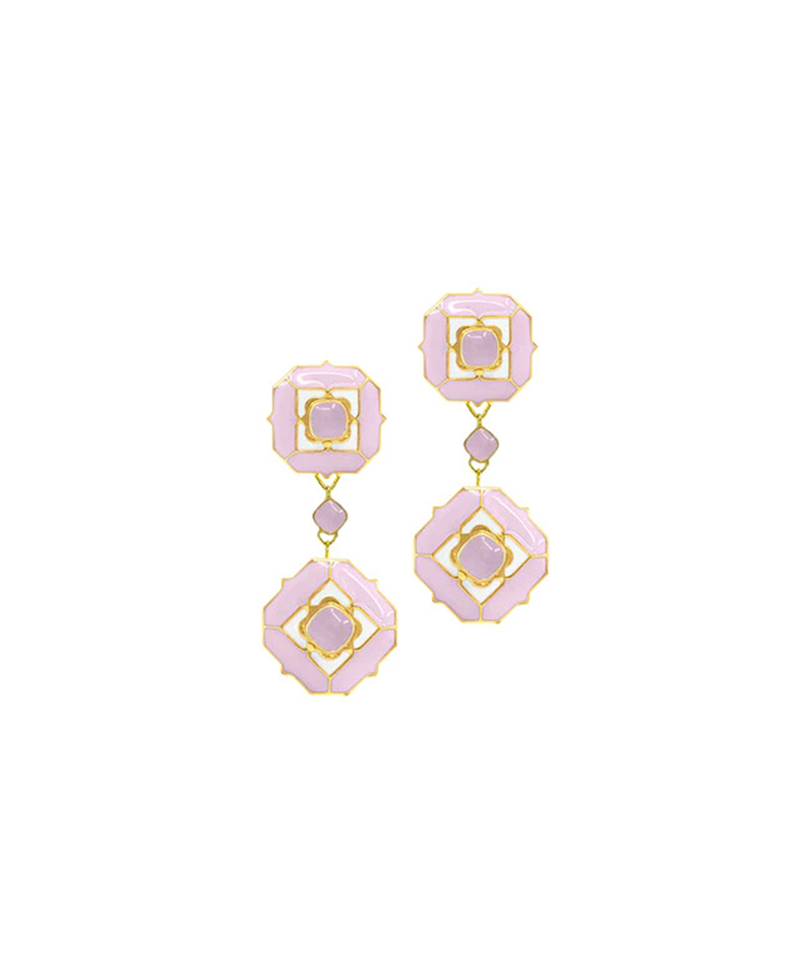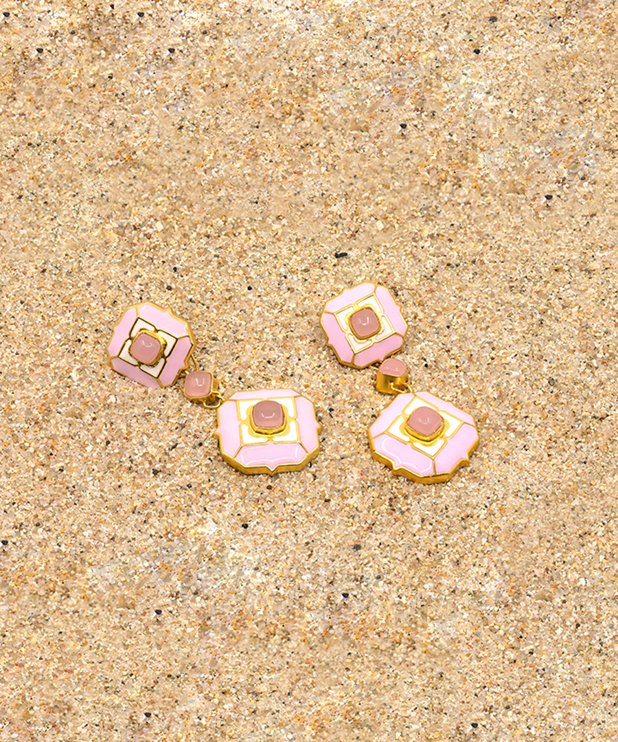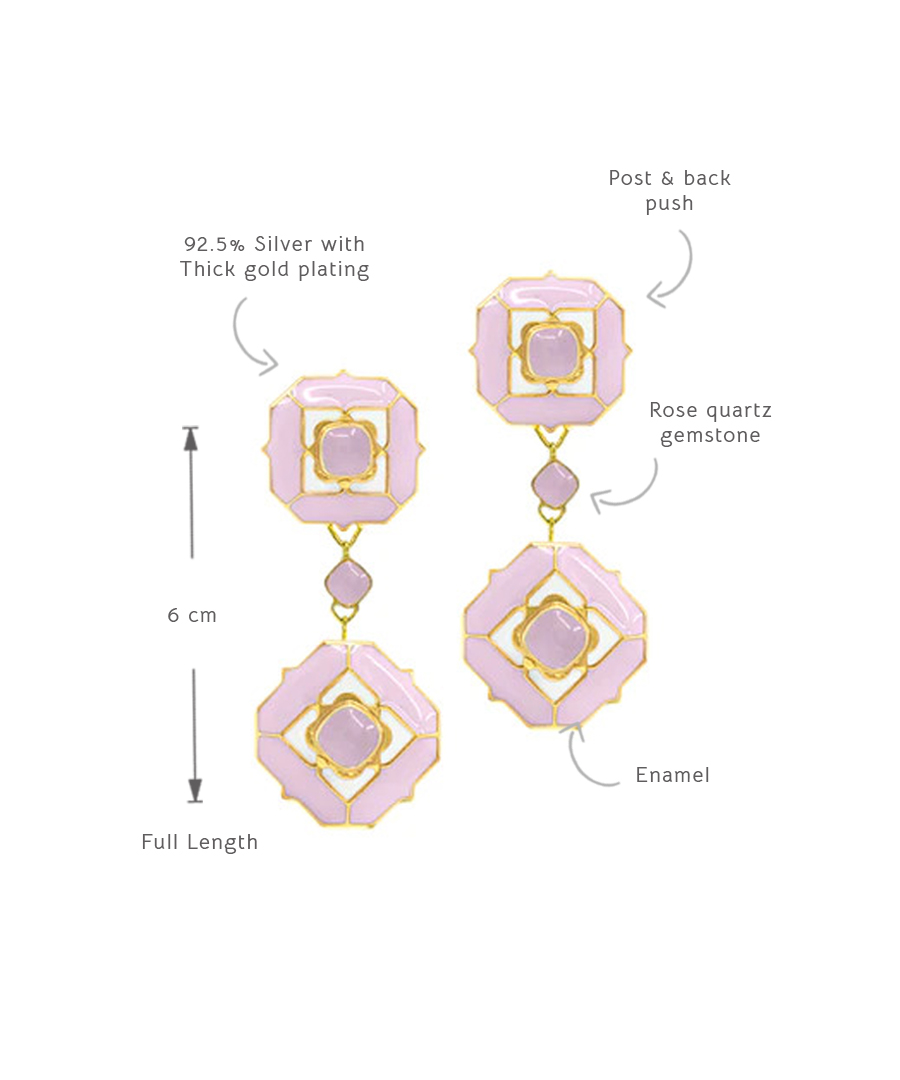 The swaying dangle earring has a post with push back, is handcrafted in 92.5% silver, and impeccable enamelling, It has thick gold plating. , Plating: Gold Plated, Metal Type: 92.5% Sterling Silver, Enamel / plating / gemstone: Natural gemstone Rose Quartz, Lock Mechanism: Post and push back, Measurement cm : 6cm , Measurement inches: 2.3 inch, Care Instruction: Keep away from water, perfume and other liquids. Do not use any cleaning agents. Clean when storing in the provided pouches. Store them in moisture free areas and keep them away from water and liquid fragrances.