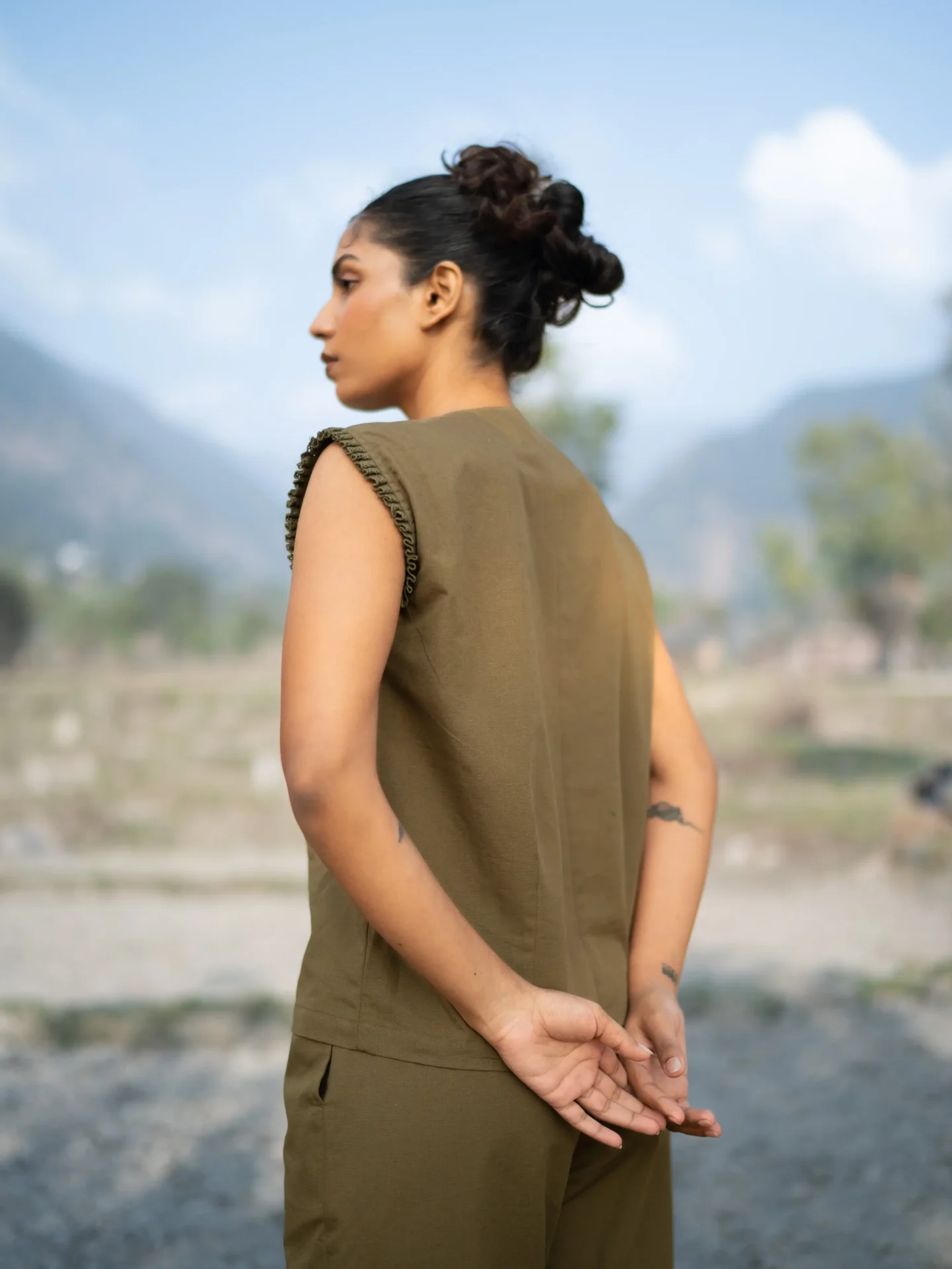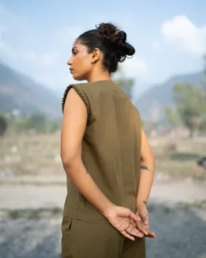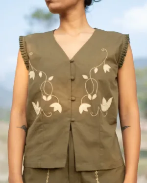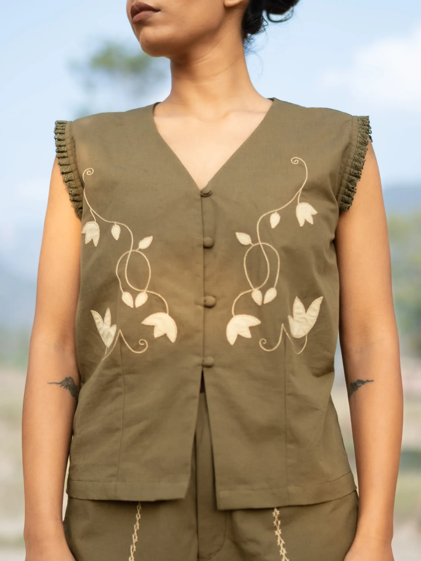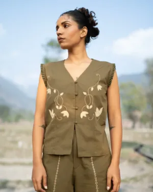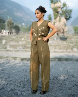 This V-neck hand embroidered vest top features artisanal handwork across the front, adding texture and charm. Style it with the coordinated piece to create a signature co-ord look that’s both modern and handcrafted.