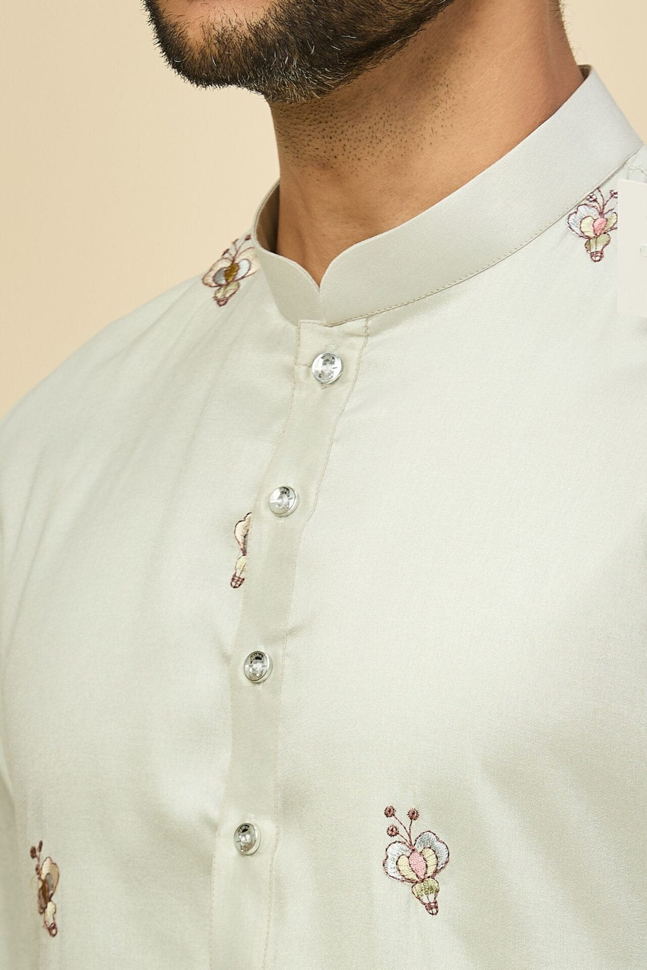 Sky Blue crepe silk based kurta enhanced with resham embroidery, paired with an off white dupion silk based mexican pants.