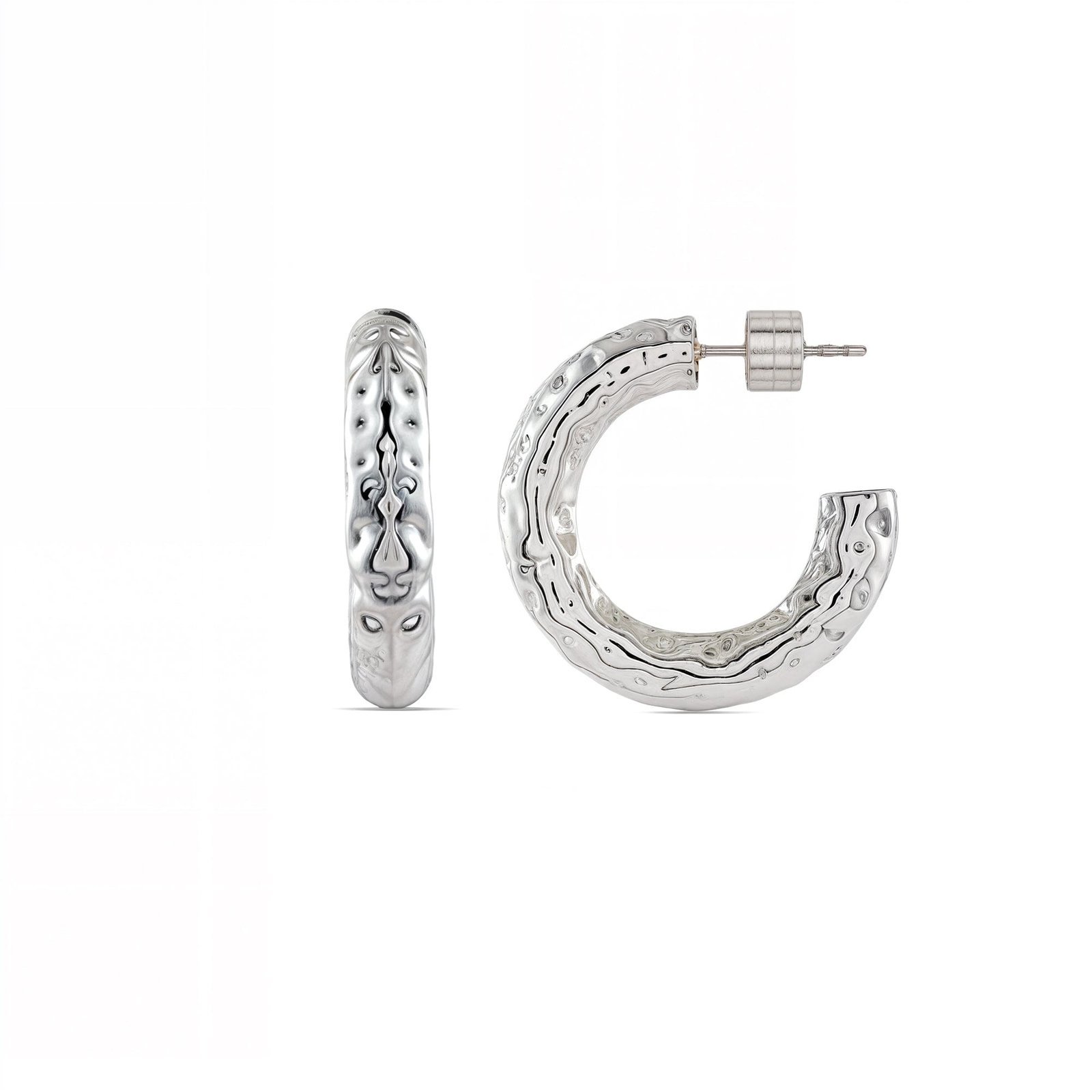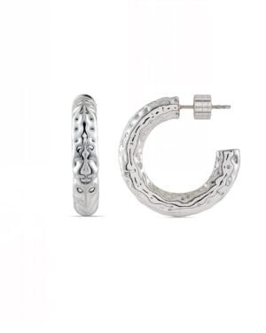 Inspired by the rugged textures of ancient fortresses, these hoops feature raw, unfinished surface with intricate etchin
