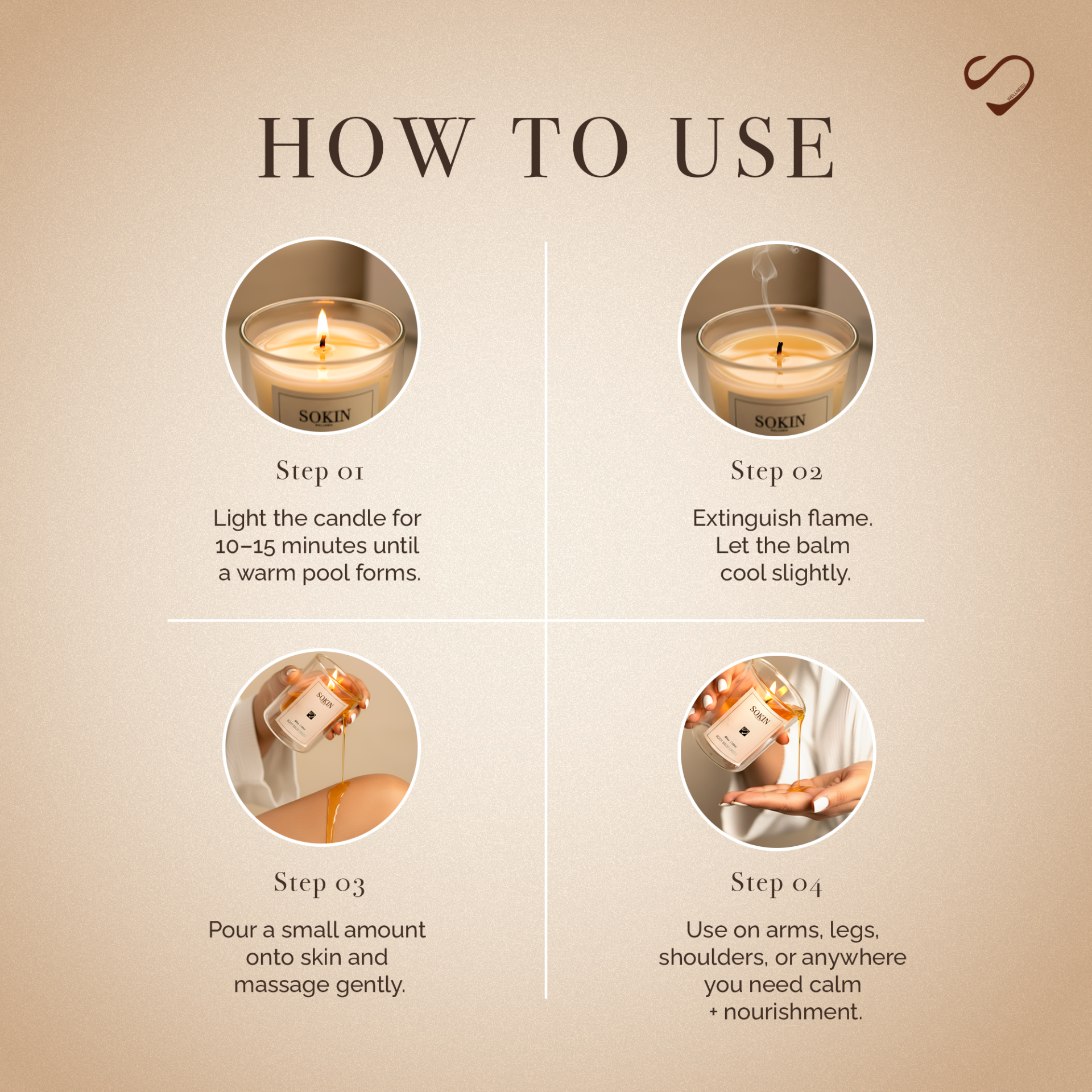 - Pour warm oil onto skin (check temperature first)
