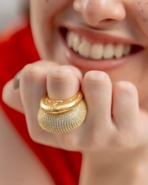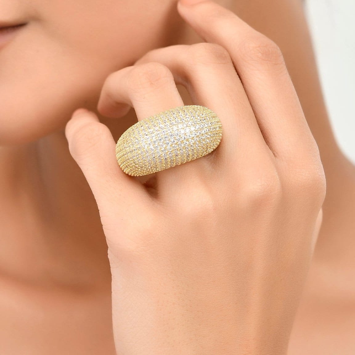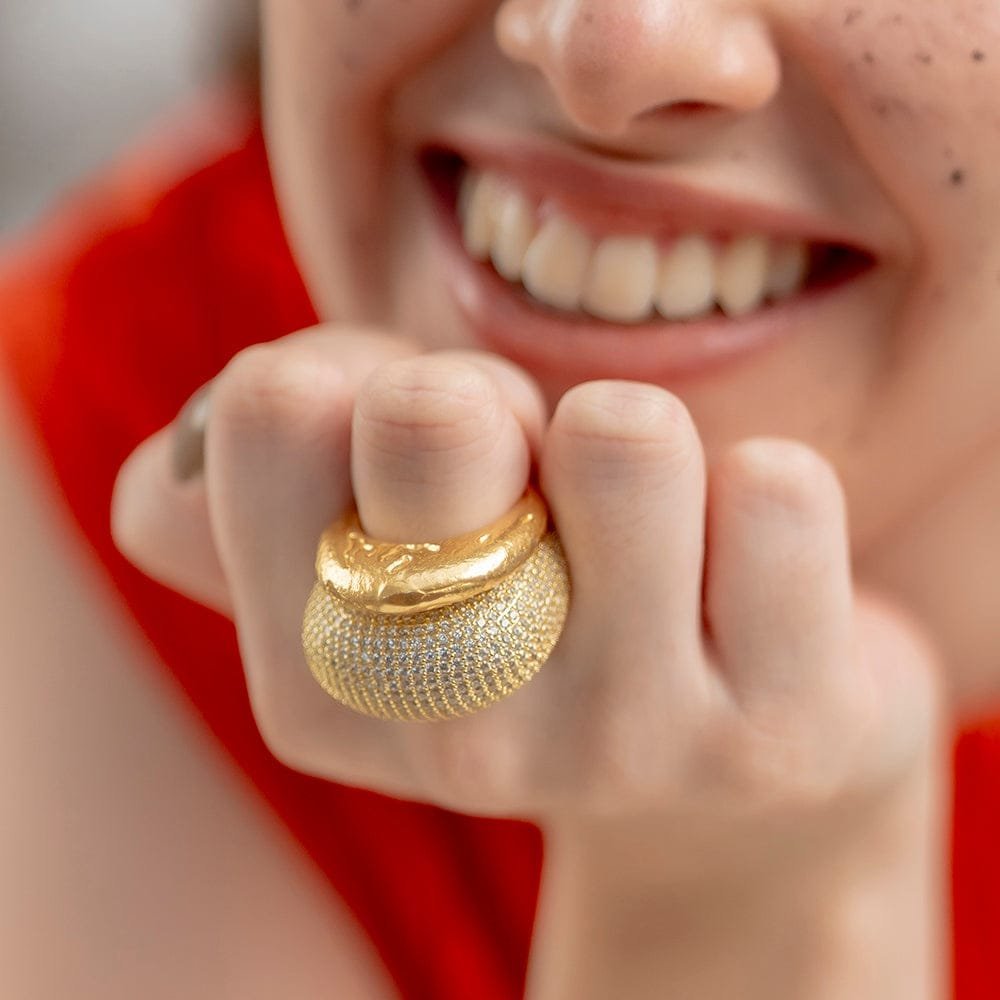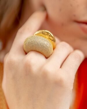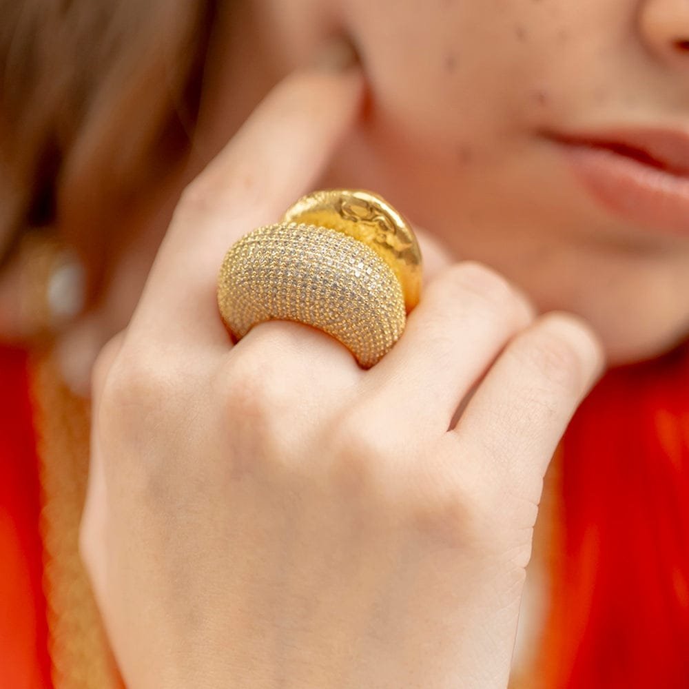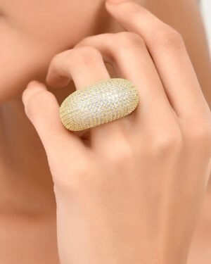 Illuminate Your Style with Celestial RadianceThe Starlit Pave Dome Ring is where bold modern architecture meets timeless glamour. Designed for the woman who isn't afraid to shine, this chunky dome ring provides a luxurious weight and a brilliant sparkle that captures the light from every angle.Exquisite Materials & FinishPremium Base: High-grade Brass Alloy for a substantial, high-end feel and durability.Luxury Plating: Thick 22KT Real Gold Plating ensures a deep, authentic golden glow that lasts.The Starlit Effect: Hand-set, precision-cut AAAAA Cubic Zirconia stones in a seamless pave setting.Why You'll Love ItBold Yet Comfort Fit: Despite its "chunky" aesthetic, the inner band is polished to a mirror finish, ensuring it glides on smoothly and stays comfortable all day.Versatile Statement: Transition effortlessly from a power meeting at the office to a moonlit dinner. It?s the ultimate accessory for the modern trendsetter.Hypoallergenic: Lead and nickel-free, making it safe for sensitive skin without compromising on