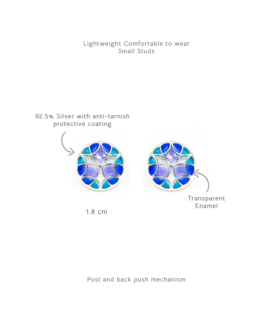 The radiance of enamel in these small stud earrings describes colors of life, these studs are handcrafted in 92.5% silver, has an anti tarnish protective coating. These small studs has a ear wire lock which is super easy to wear., Plating: Silver Ani-tarnish, Metal Type: 92.5% Sterling Silver, Enamel / plating / gemstone: Transparent Enamel, Lock Mechanism: Post and push back, Measurement cm : 1.8 cm, Measurement inches: 0.70 inch, Care Instruction: Keep away from water, perfume and other liquids. Do not use any cleaning agents. Clean when storing in the provided pouches. Store them in moisture free areas and keep them away from water and liquid fragrances.