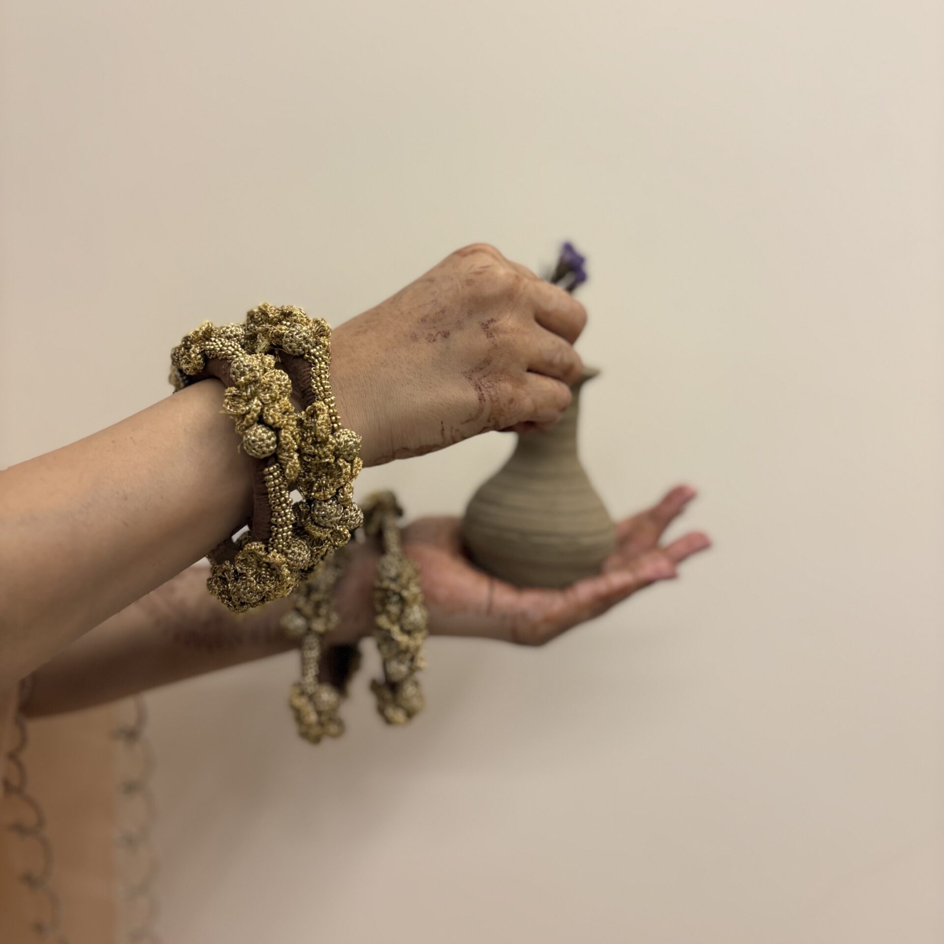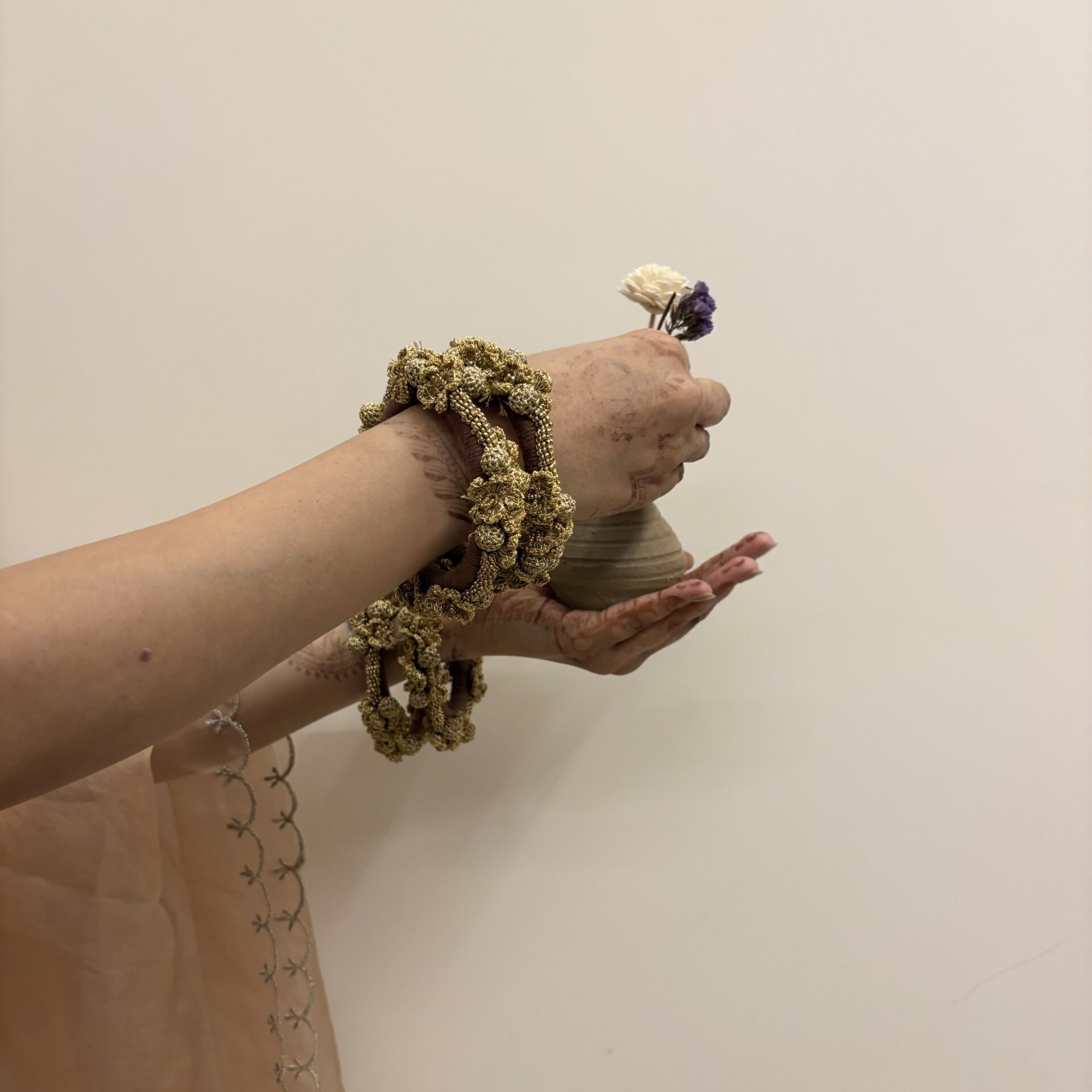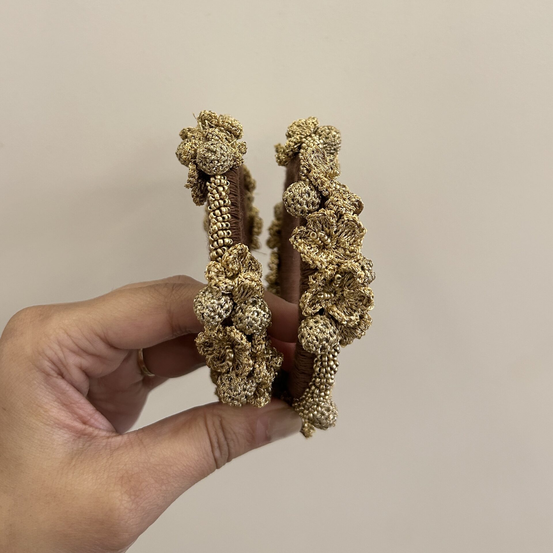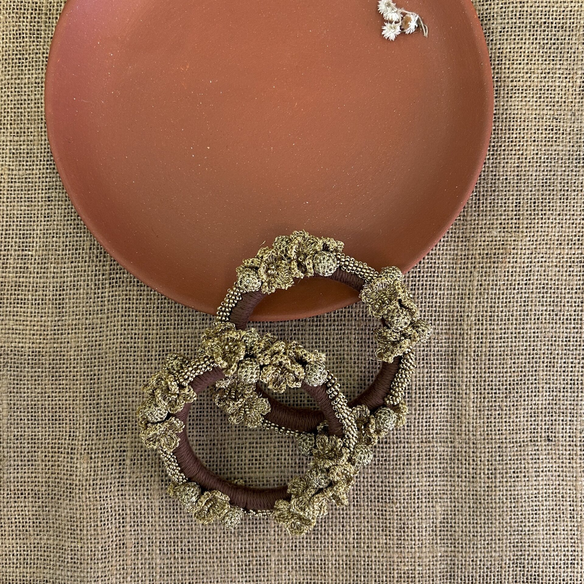 Lightweight and delicately crafted, these golden bangles are made over smooth rosewood bases, giving them a warm, earthy foundation. Each piece is adorned with fine crochet flowers, crochet beads, and golden seed beads ? tiny details shaped with patient hands, adding shimmer without the weight.