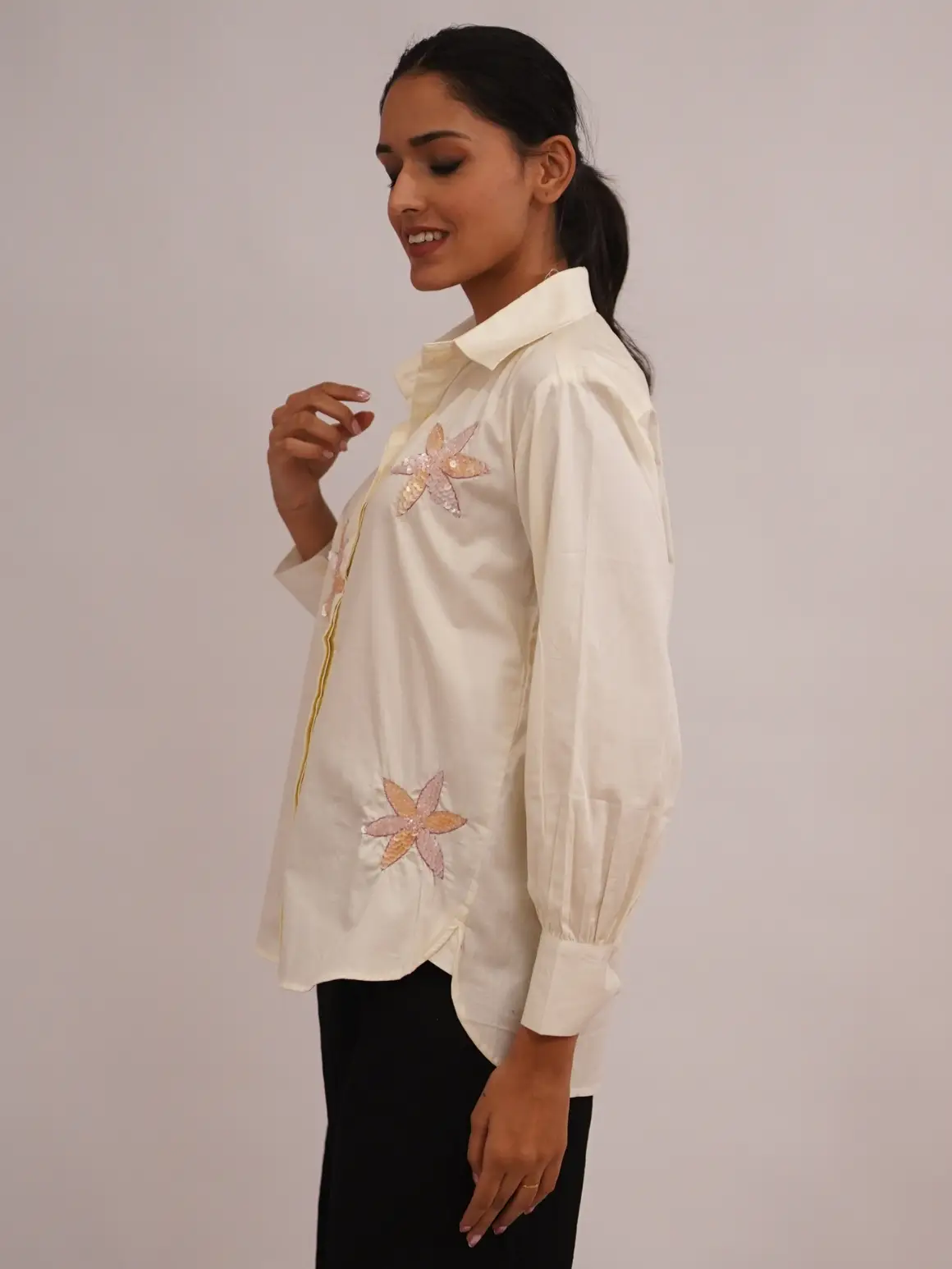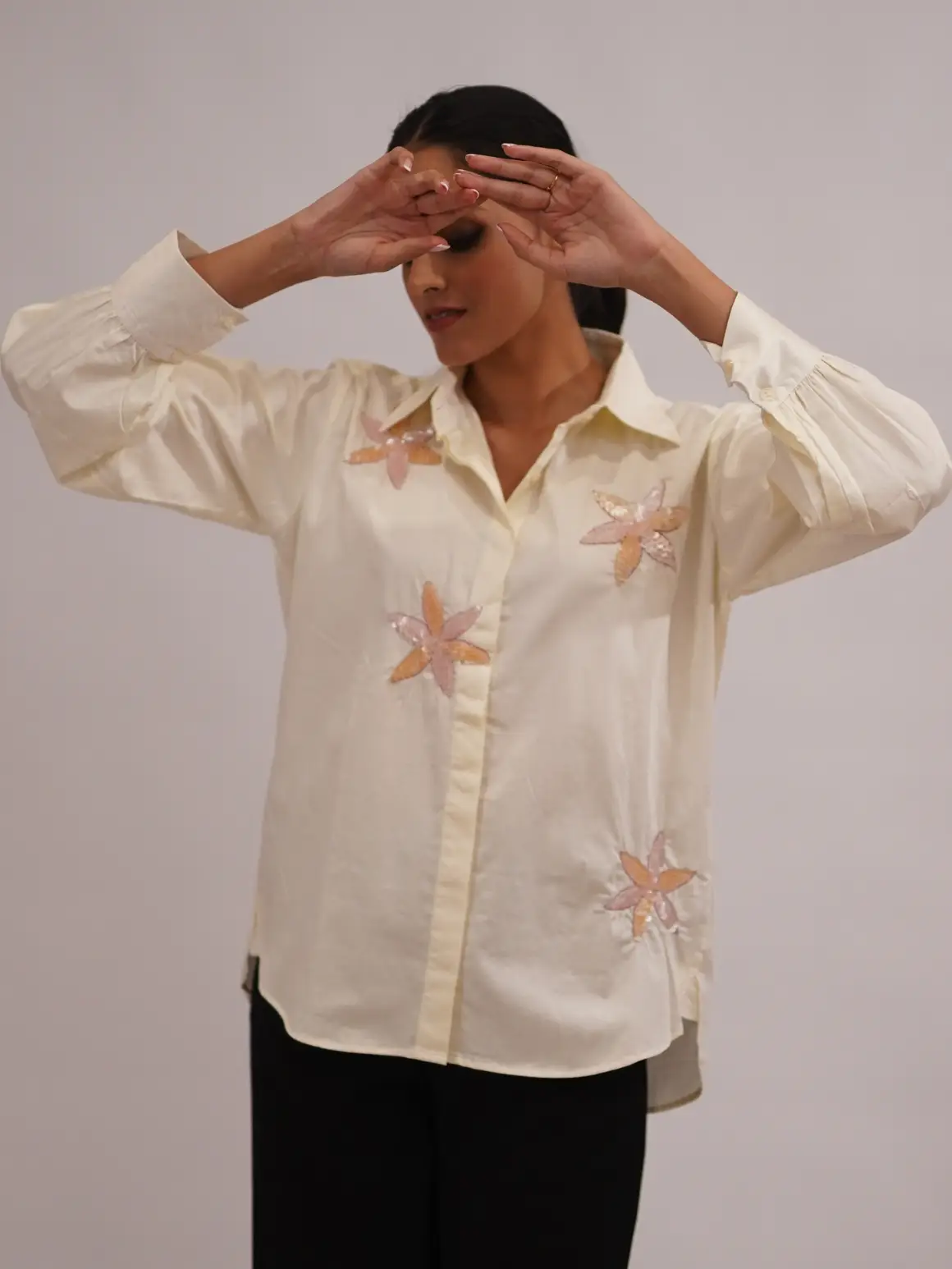 An ode to gentle radiance and refined femininity.This lemon-hued shirt captures the freshness of spring mornings with delicate hand-embroidered floral appliqués in soft blush and gold. Crafted in a smooth satin-cotton blend, it strikes the perfect balance between structure and fluidity — making it a versatile statement piece for both casual elegance and polished charm.
