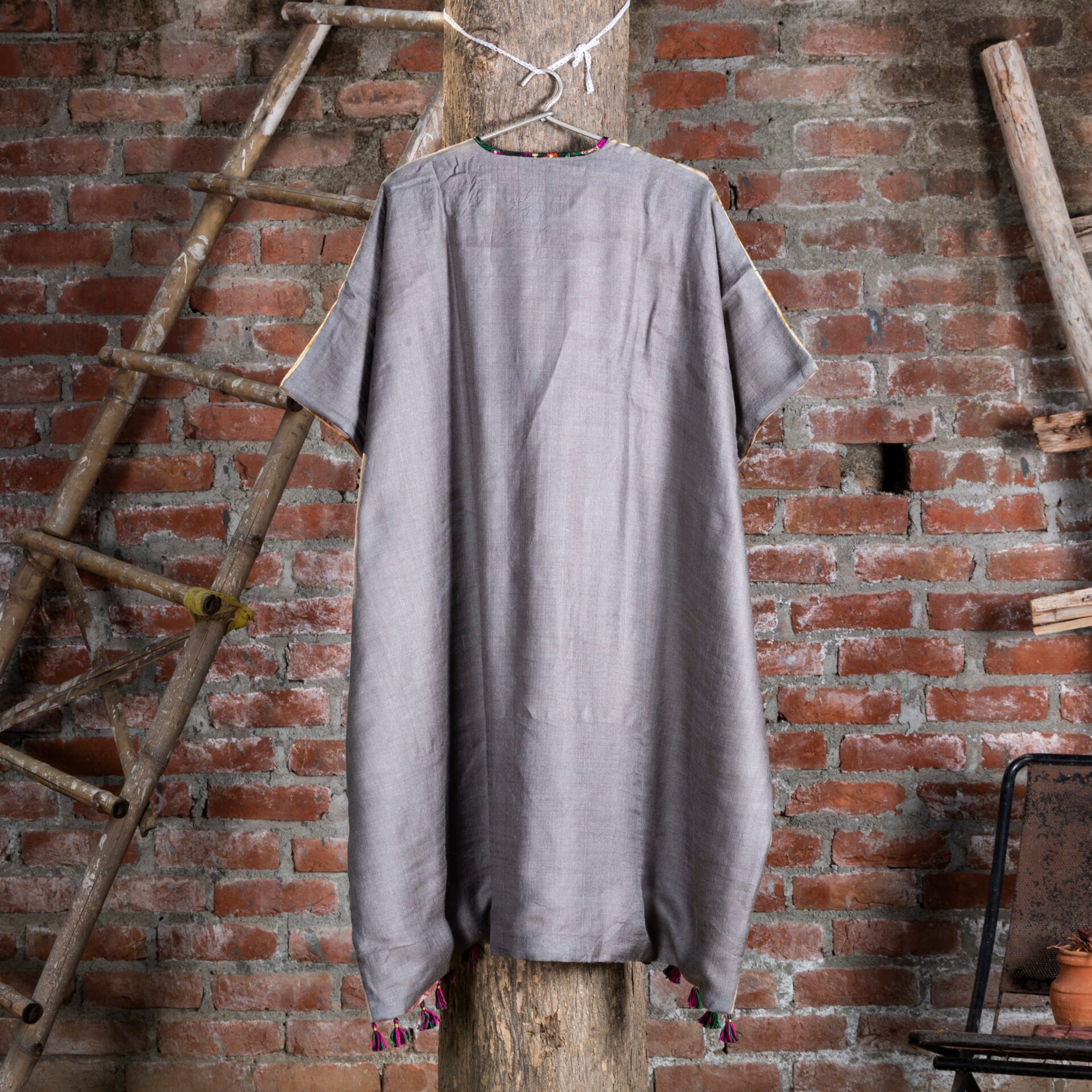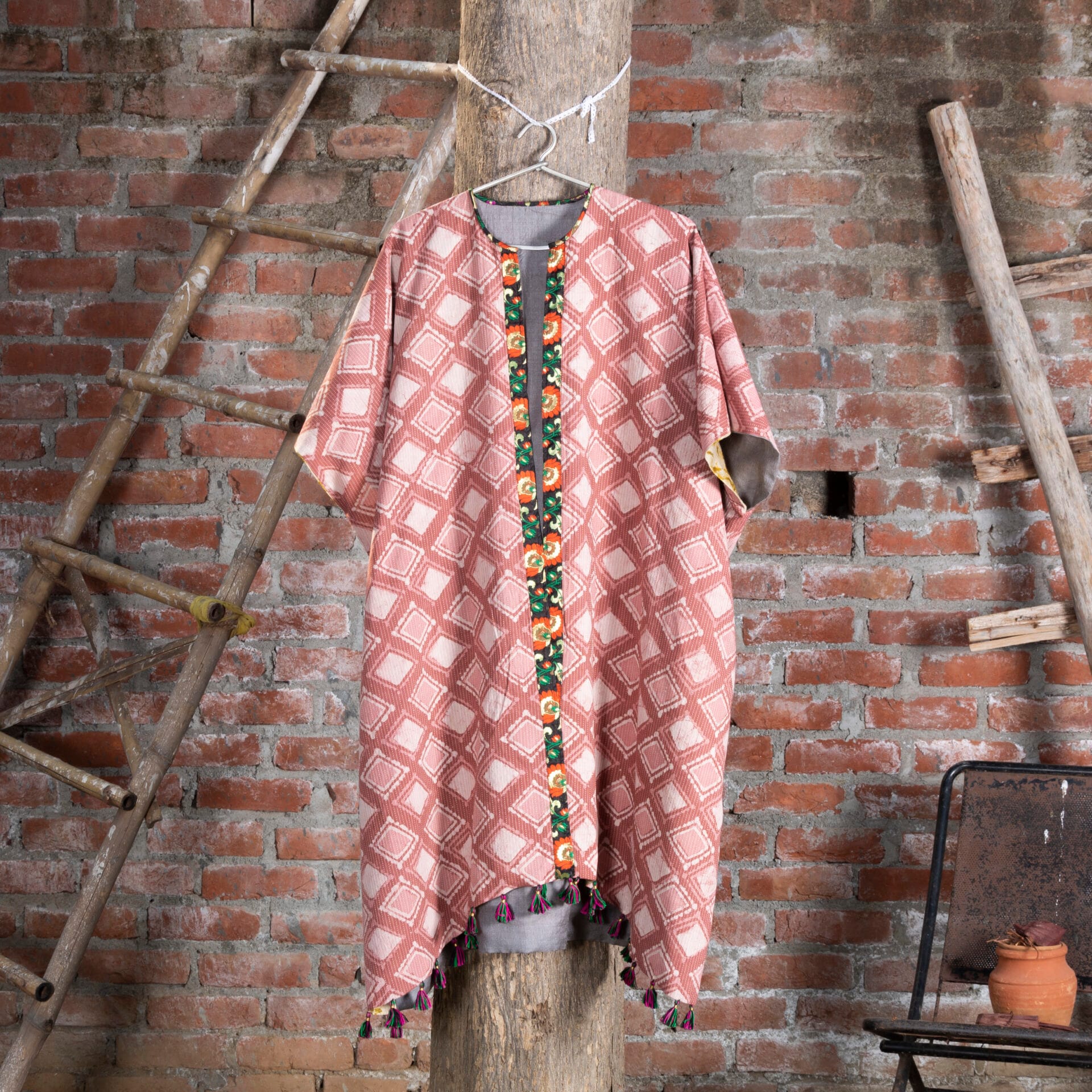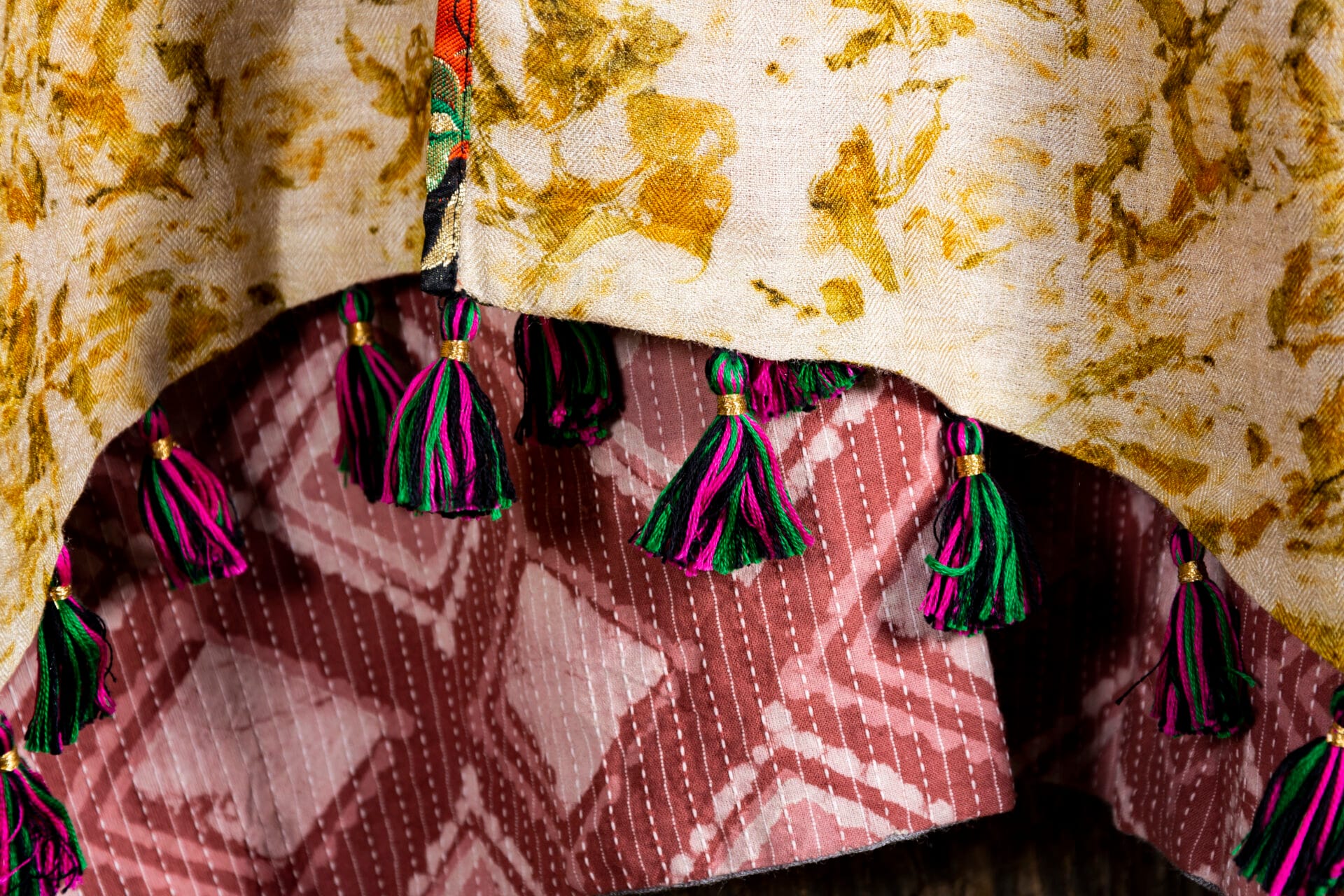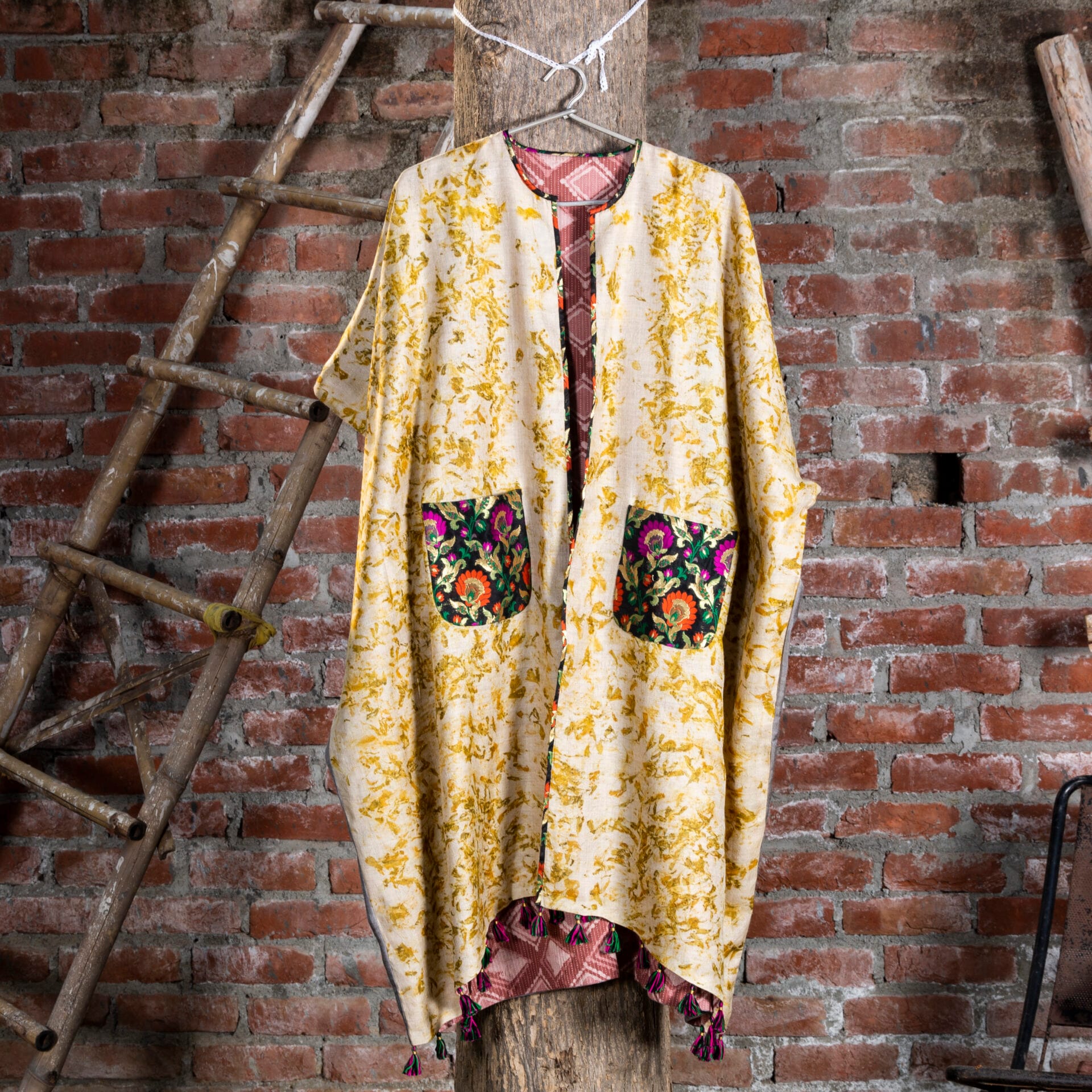 Bageeya’s “Sursli sundari ” Reversible pasban Jackets elevates your style?a harmonious blend of tradition and trend. Crafted from Khadi Tussar cotton by local artisans in Nagpur, one side boasts Ecoprinting with a patch pocket, while the other showcases block-printed fabric. This long, flowy jacket is adorned with playful tassels, creating a versatile and chic wardrobe essential. Immerse yourself in the rich heritage of Nagpur, with our Reversible Pasban Jackets. The ecoprinted method using Marigolds on one side is a meticulous craft, ensuring a unique and organic touch to each piece. The organic tussar cotton sourced locally supports the skilled weavers of the region. Our trained artisans masterfully apply eco printed with Marigolds, creating a sustainable and eco-friendly garment. The reversible side features vibrant block-printed fabric, adding a dynamic contrast. Embrace the essence of Indian craftsmanship and sustainable fashion with every wear. Step into a world of bohemian elegance with our Reversible Pasban Jackets. The Naturally-dyed side, created through the intricate Ecoprinting method, boasts a distinctive pattern and a convenient patch pocket. On the flip side, the jacket transforms with a visually captivating block-printed fabric. The long overlay design exudes an effortlessly chic vibe, offering a versatile layering piece for any occasion. Crafted from locally sourced handwoven tussar cotton from nagpur, this jacket showcases the perfect fusion of traditional techniques and contemporary style. Complete with playful tassels along the bottom, this garment is a celebration of artistry and comfort. Wrap yourself in the artistry of our Reversible Pasban Jacket. Perfect for both casual and dressy looks, drape it over a simple outfit for an instant style upgrade. Pair with jeans and a tee or a dress for a bohemian flair. The reversible feature allows you to effortlessly switch your look, making it a versatile wardrobe staple. So, slip into this versatile Reversible Pasbaan jacket and feel confident knowing you look good and do good