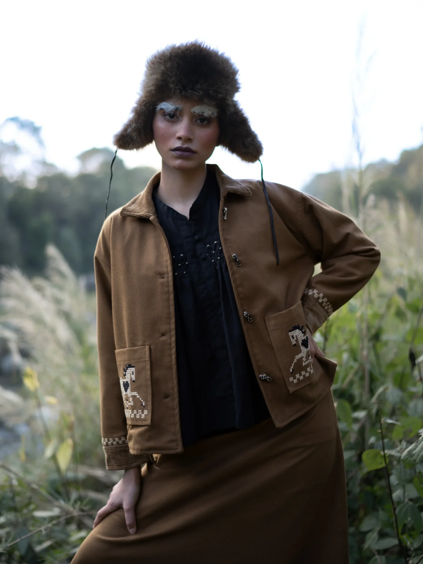 Made in a soft , breathable fabric, this jacket features delicate hand-embroidered detailing at pockets and cuff , it’s perfect for layering through changing seasons while keeping your look refined and effortless.