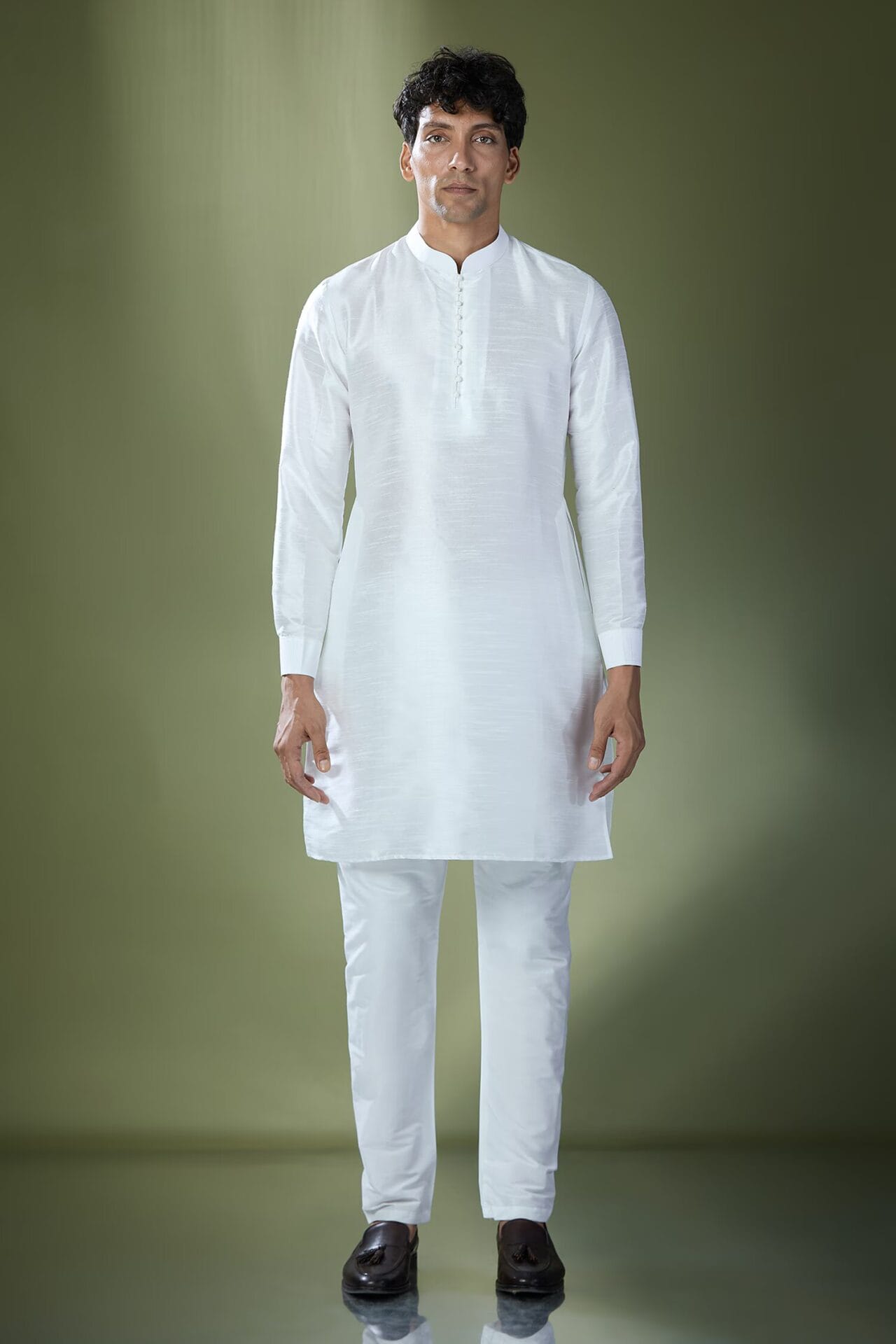 Teal Blue terry silk based jacket enhanced with light quilting, paired with an off white dupion silk based kurta and an off white dupion silk based pants.
