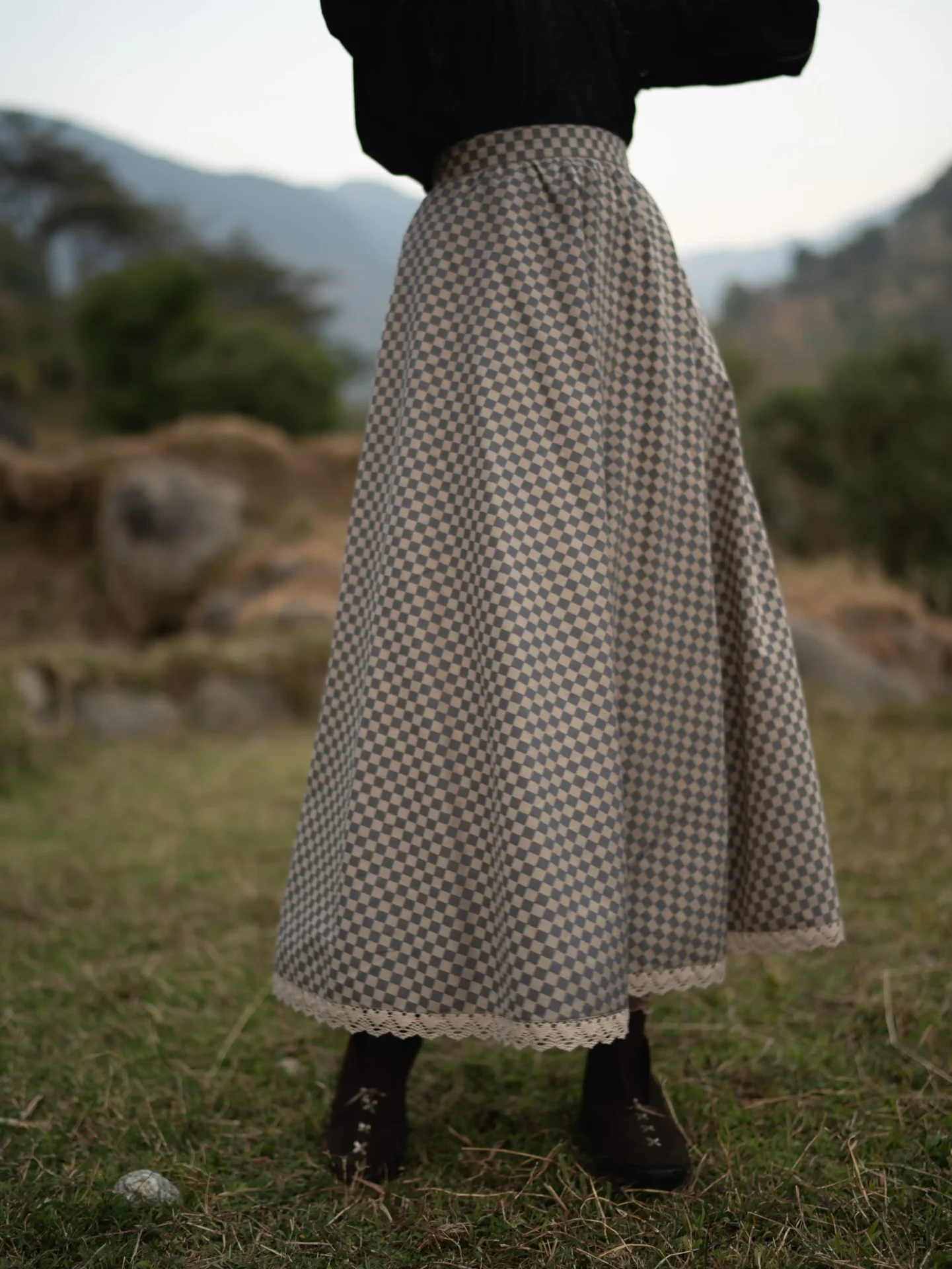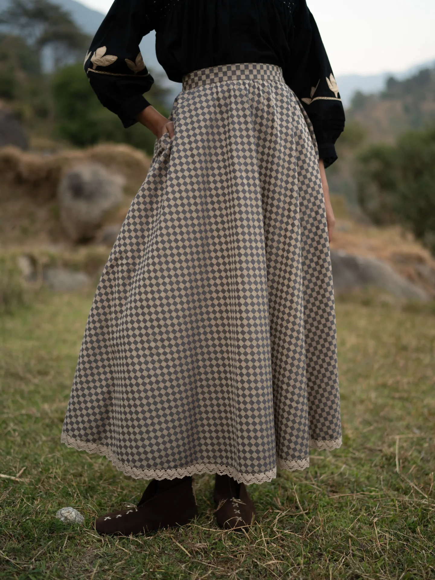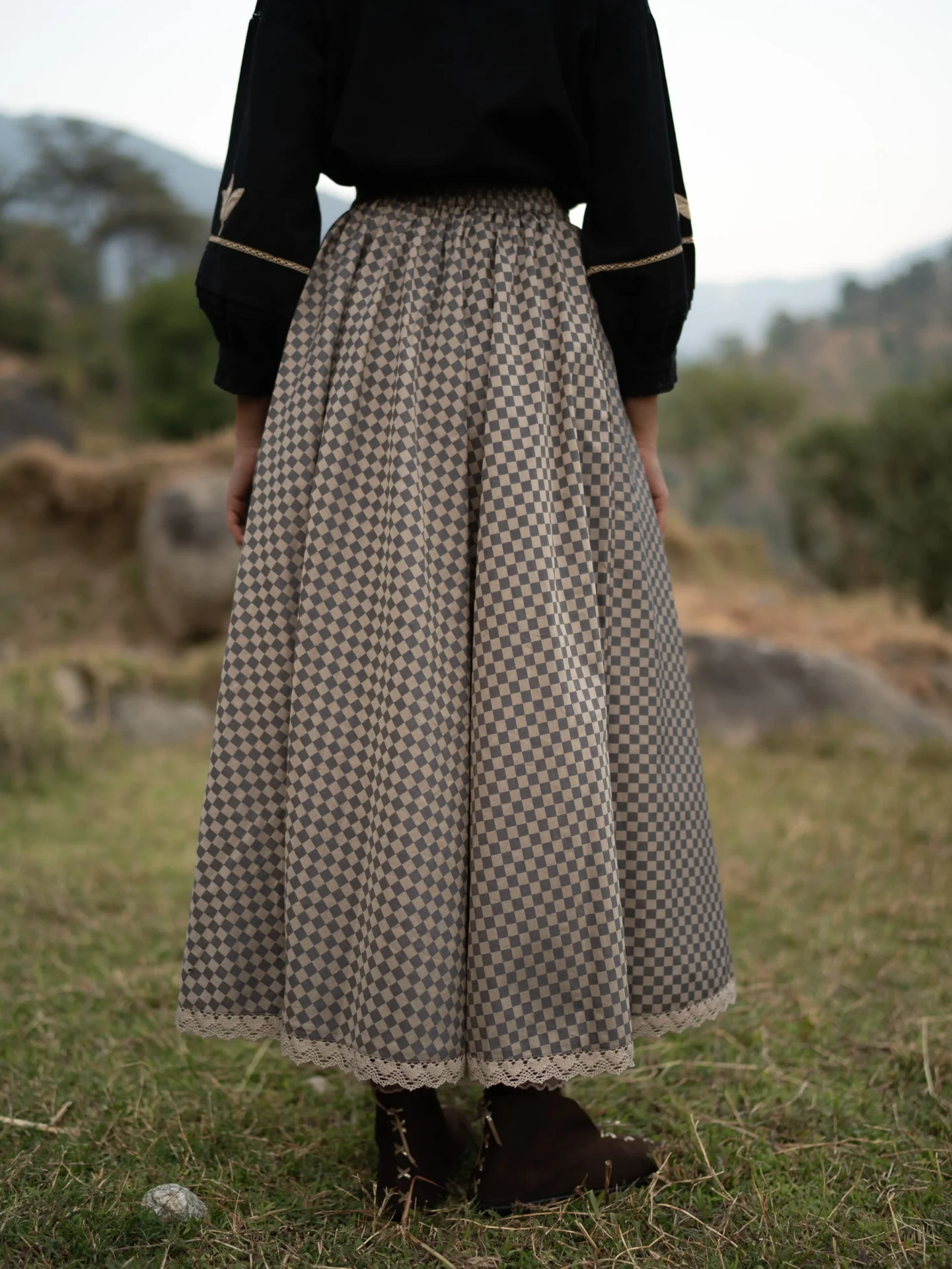 Featuring an all-over chessboard print, this skirt brings a bold graphic charm to a classic silhouette. The clean front waistband keeps the look sleek and structured, while the elasticated back ensures a comfortable, flexible fit that moves effortlessly with you. The gentle flare adds fluidity to every step—making it a perfect choice for both casual and dressed-up edits.