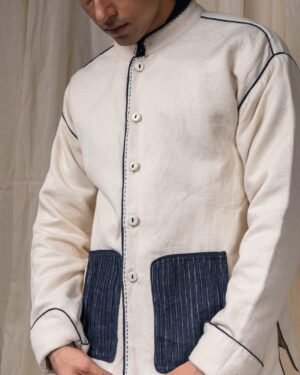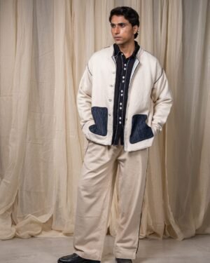 The silhouette features a Mandarin collar, side slits for ease, and broad cuffs finished with handwoven grey stripes and Midnight Black piping. Pockets in handwoven Midnight Black cotton are pintucked for subtle structure and contrast. Ceramic buttons complete the piece — adding a textural detail.