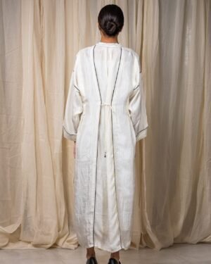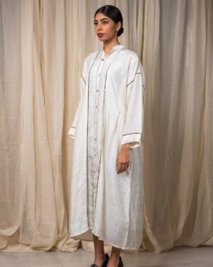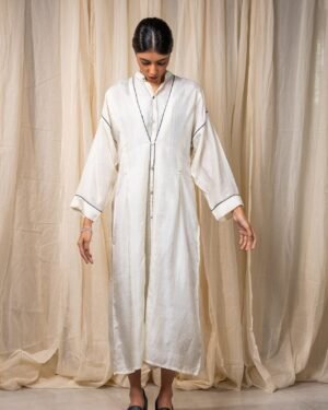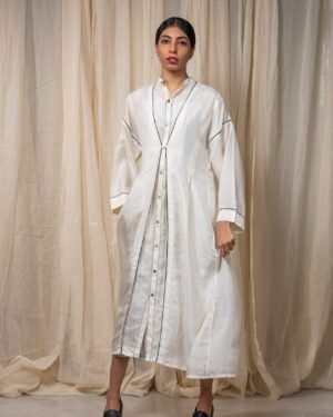 Broad cuffs finish the sleeves, and Midnight Black Chanderi piping traces the seams, adding contrast to the fluid structure.