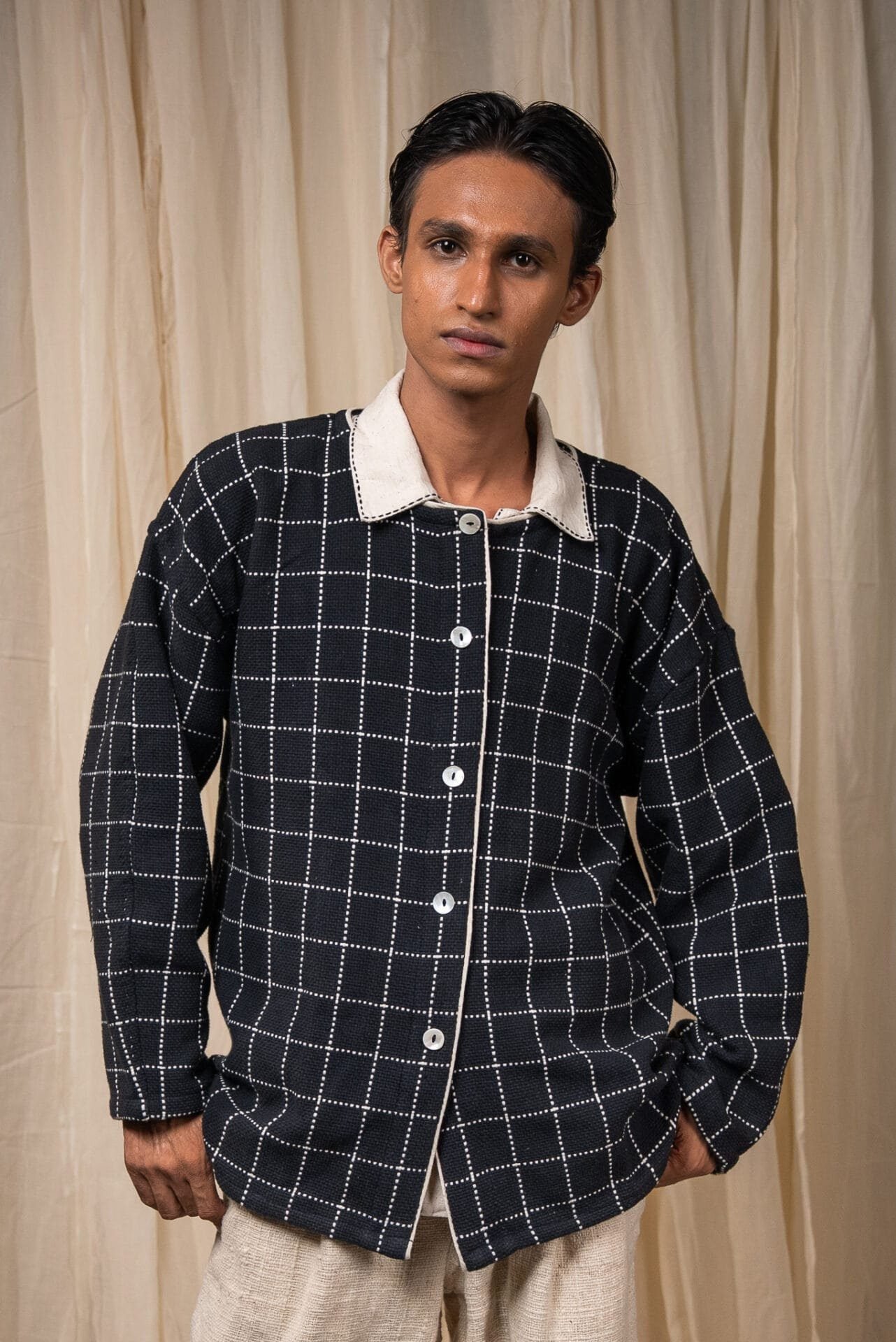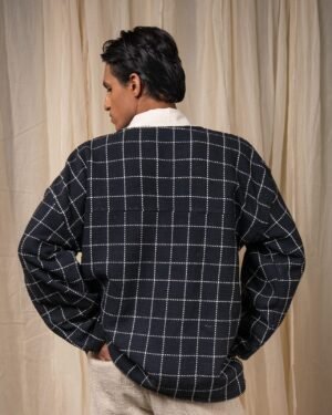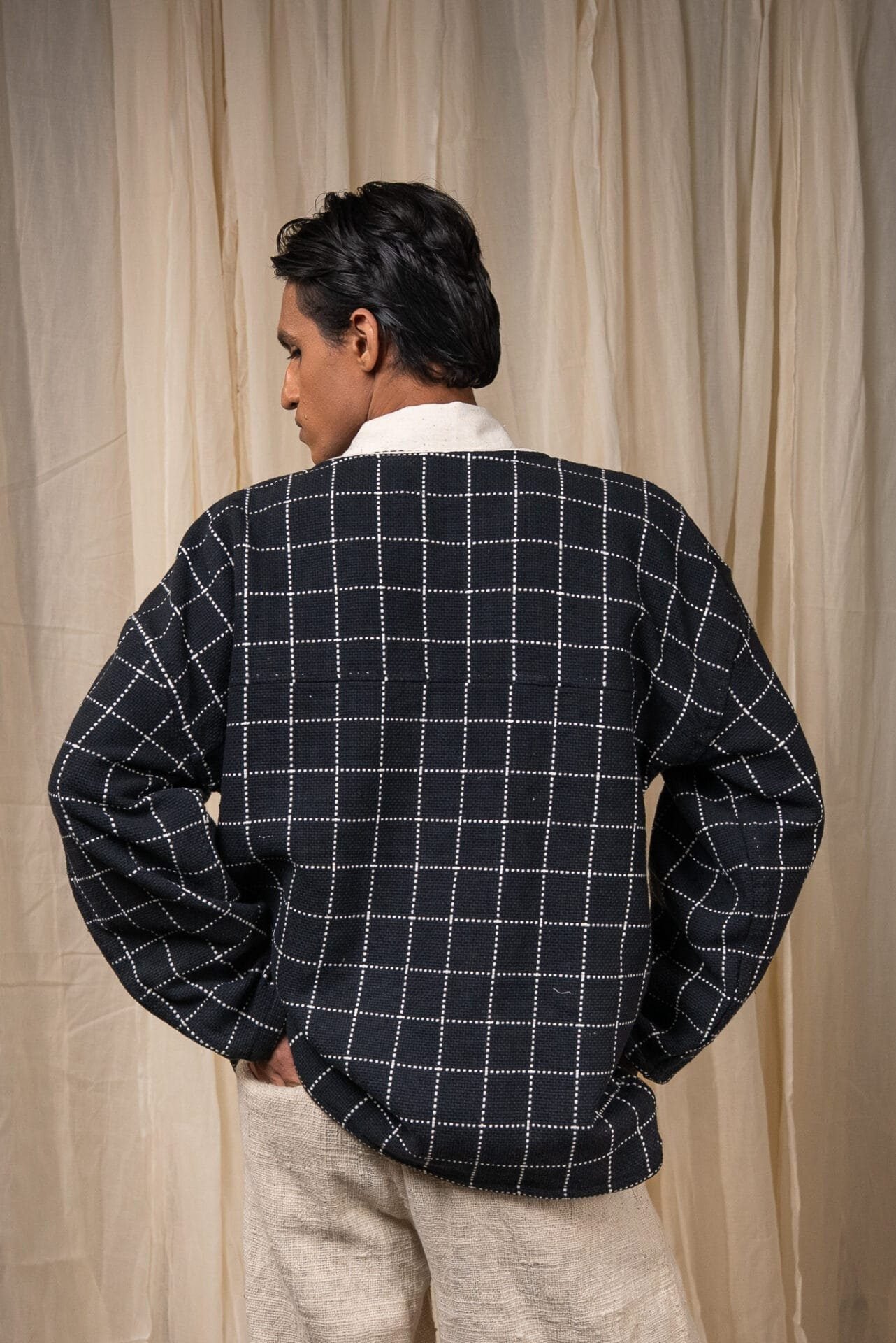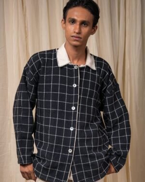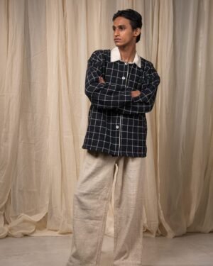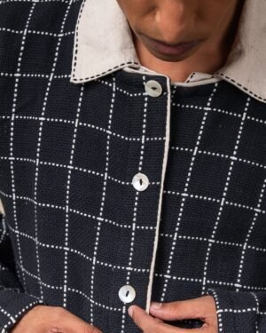 Crafted from 100% cotton fibres and natural materials, this handwoven jacket is made from azo-free dyed cotton in large woven checks. Featuring a round neckline and drop shoulders, it is detailed with Kala Cotton contrast piping. A versatile layer that can be worn open or closed, lending ease and comfort across seasons.