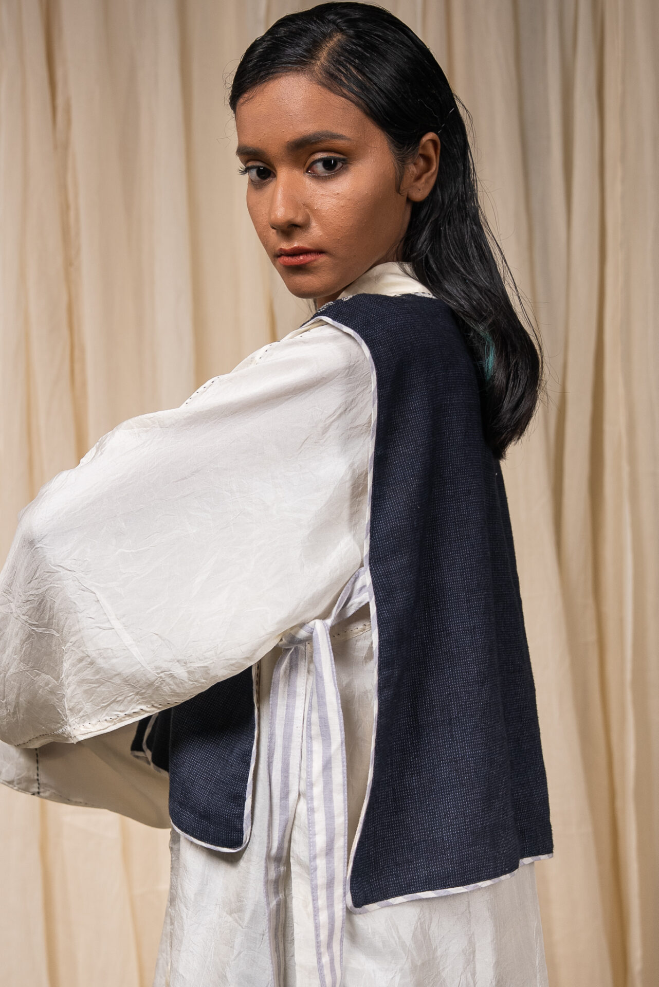 Open at the sides, it fastens with drawstrings. The cropped, free-size fit makes it easy to layer or wear on its own, offering versatility and multifunctionality in everyday styling. Piping in handwoven white and grey stripes runs along the panels, adding thoughtful detail to both sides.