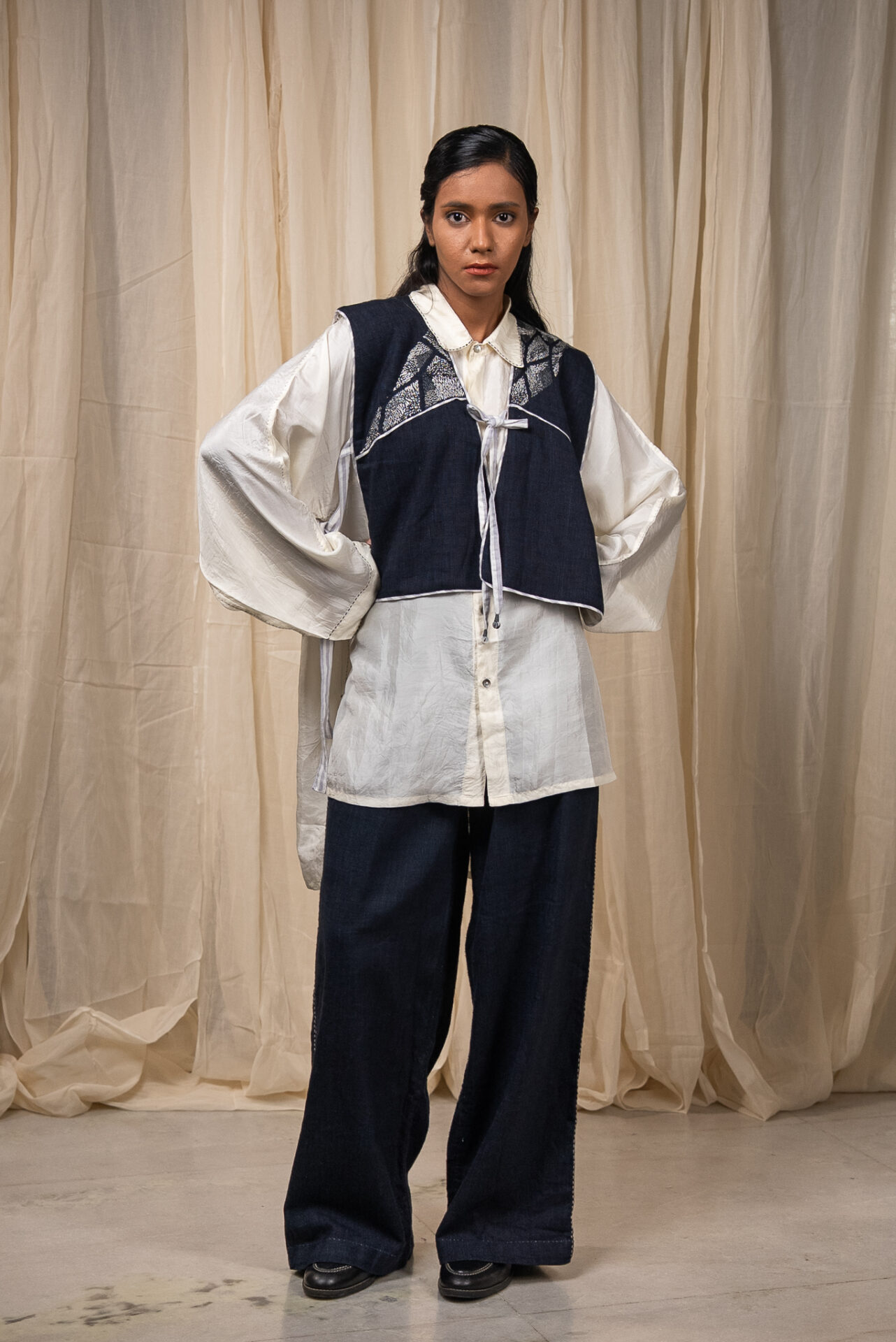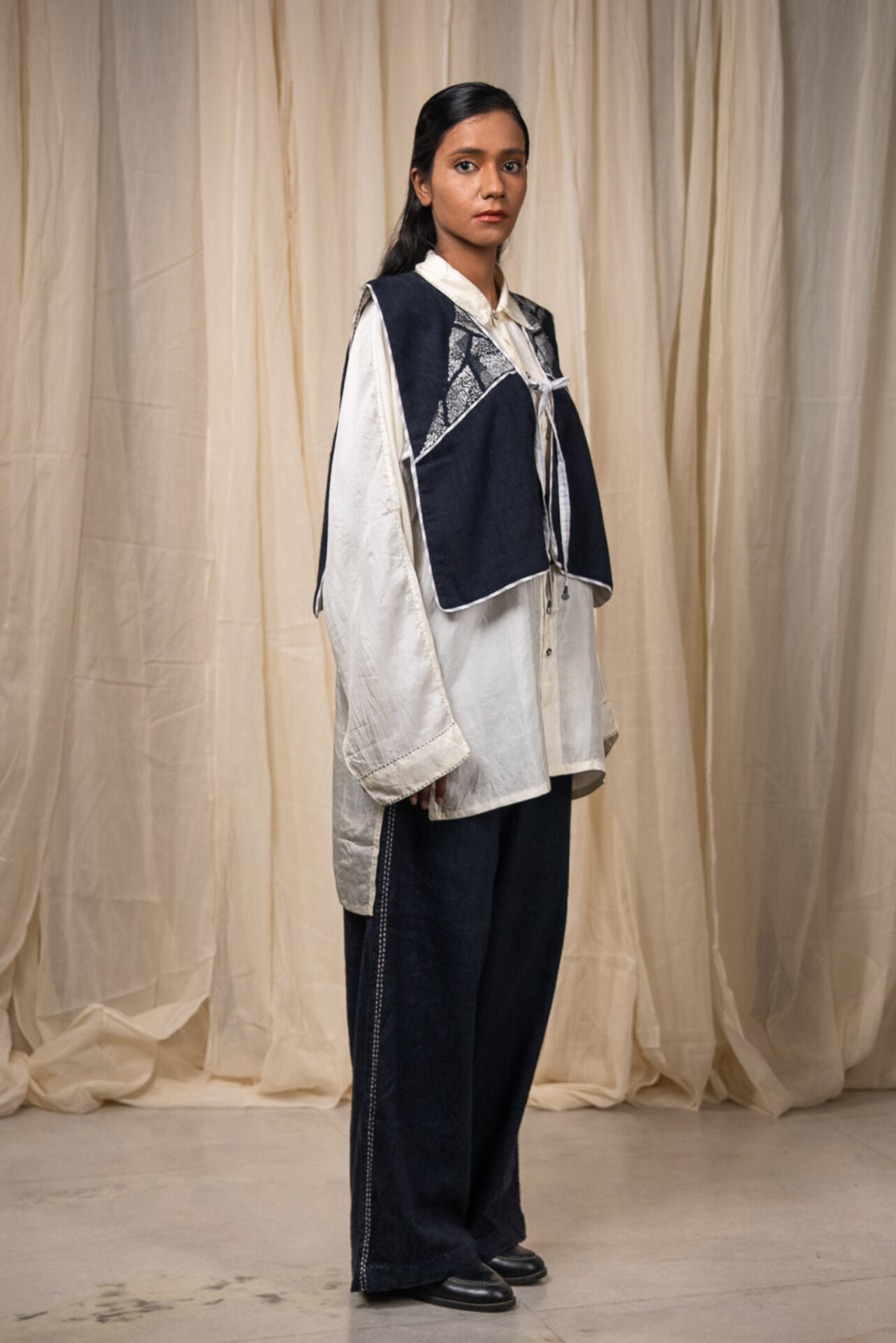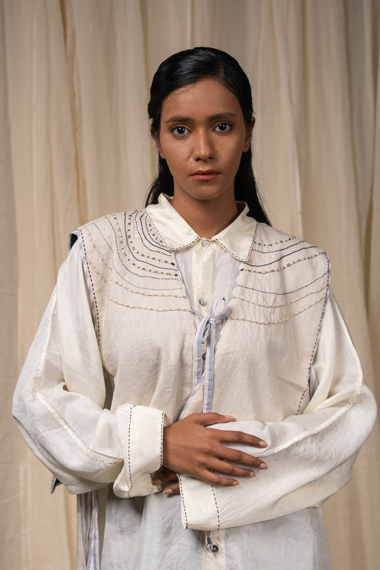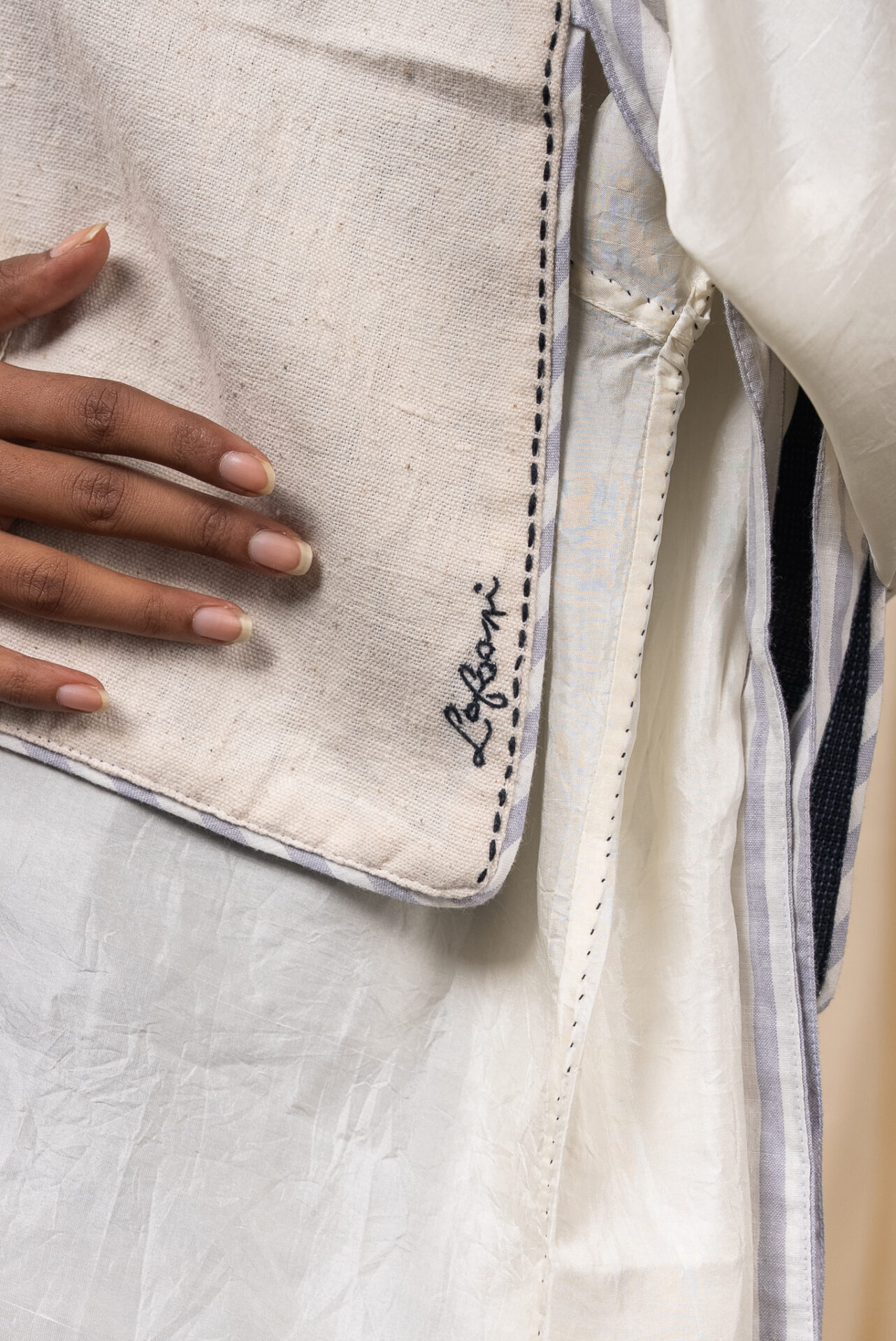 Made from 100% cotton fibres and natural materials, the reversible bib is crafted using two handwoven fabrics- black cotton on one side, and undyed Kora kala cotton on the other. The black surface features a reimagined interpretation of Kantha embroidery, while the Kora side is adorned with our signature logo placement, created using backstitch variations, Kantha, and couching techniques.