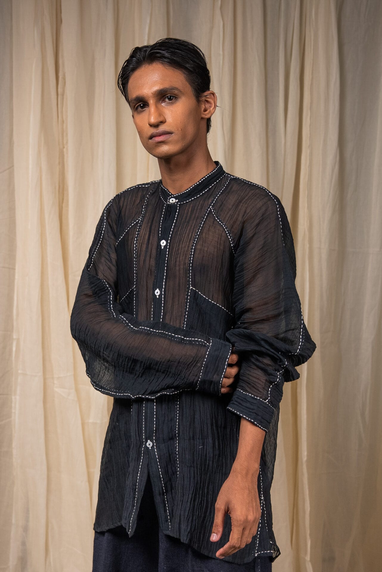 Made from 100% Handwoven Chanderi, the Seam Shirt is Midnight Black azo-free dyed.. The piece features hand-done Kantha embroidery tracing along the seams, adding quiet definition and a tactile rhythm to the silhouette.