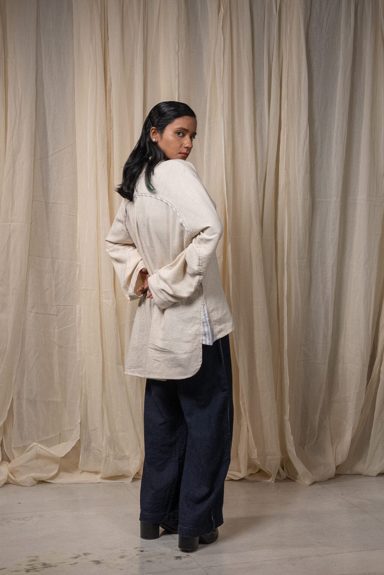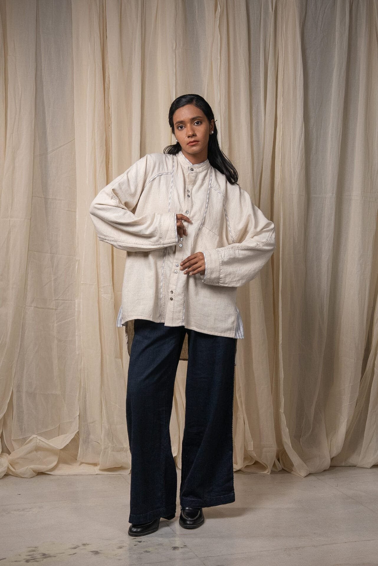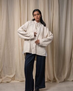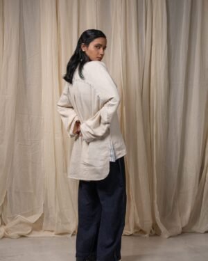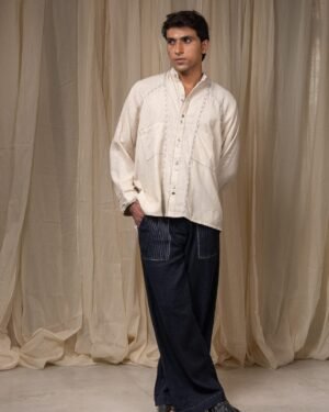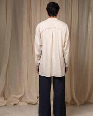 Made from 100% cotton fibres and natural materials, the Seam Shirt is crafted in undyed and unbleached Kora Kala cotton - a soft, textured fabric that holds the natural character of the fibre. Hand-done Kantha embroidery runs along the seams, complemented by piping in grey striped handwoven cotton, subtly framing the garment’s structure.