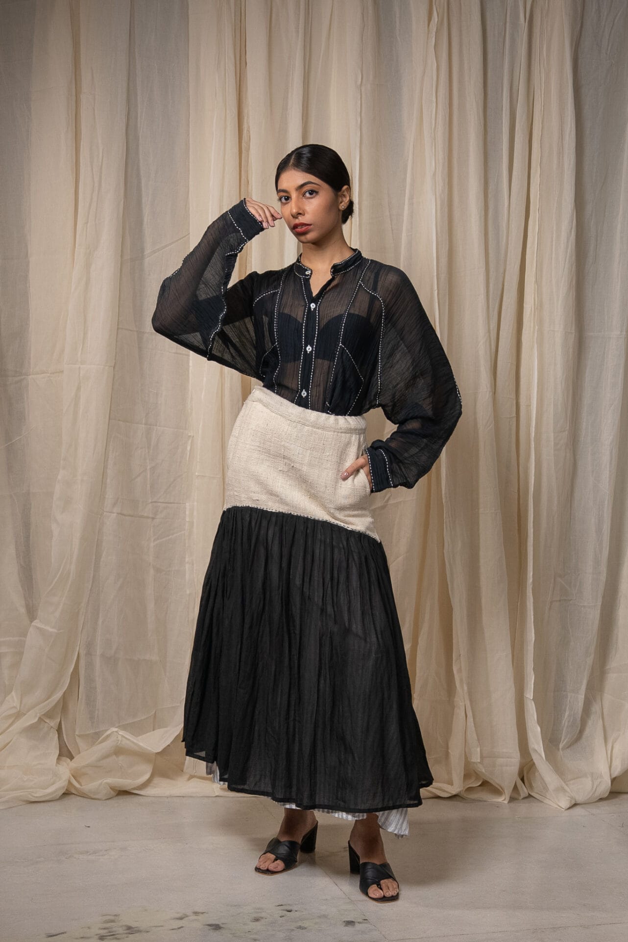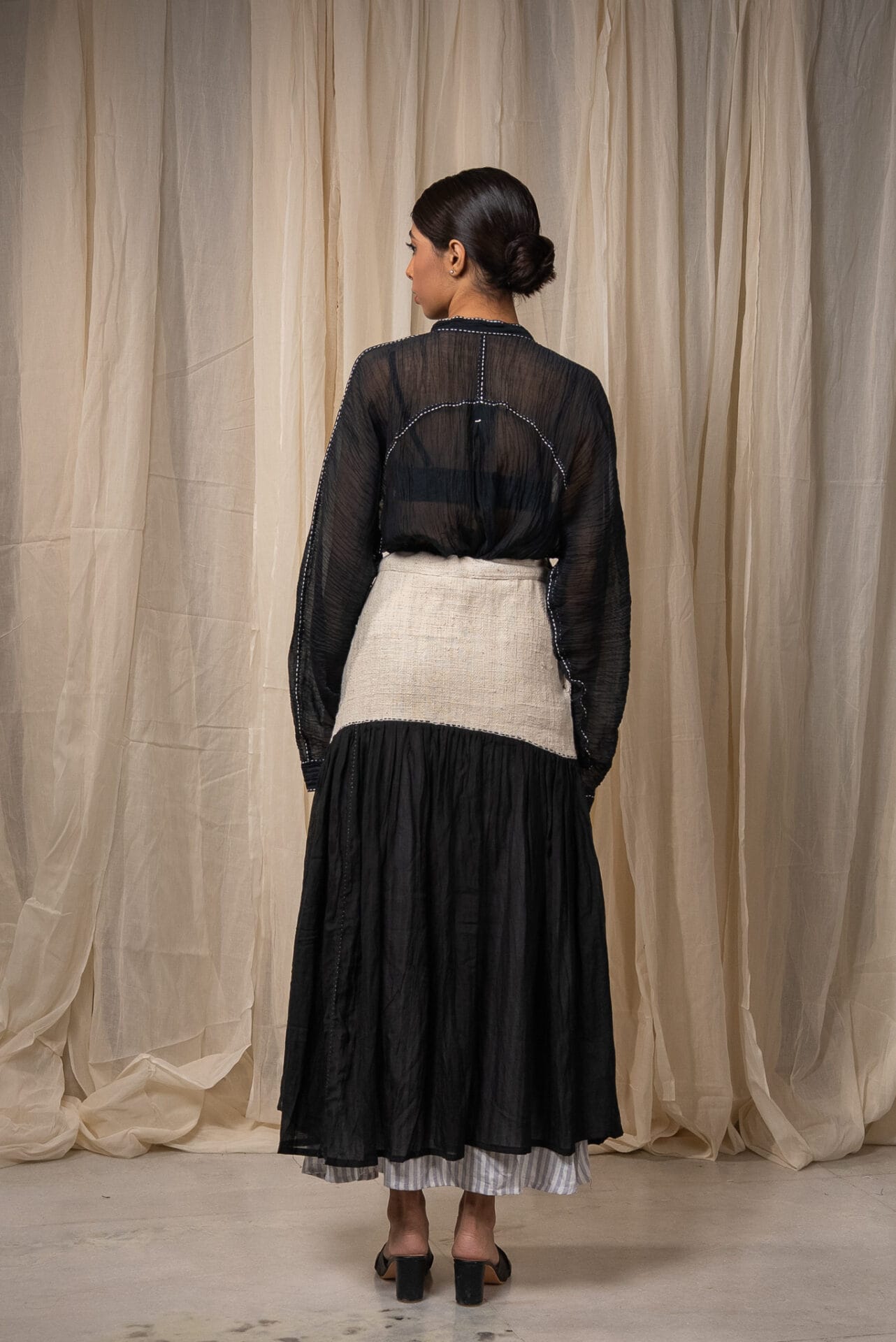 Crafted in two layers- Azo-free dyed black Chanderi outer layer and a handwoven striped cotton lining. The undyed and unbleached zero-count cotton structures the waist and hip, from where the Chanderi gathers cascade into fluid movement. This skirt plays with weight and transparency, creating depth through contrast in fabrics.