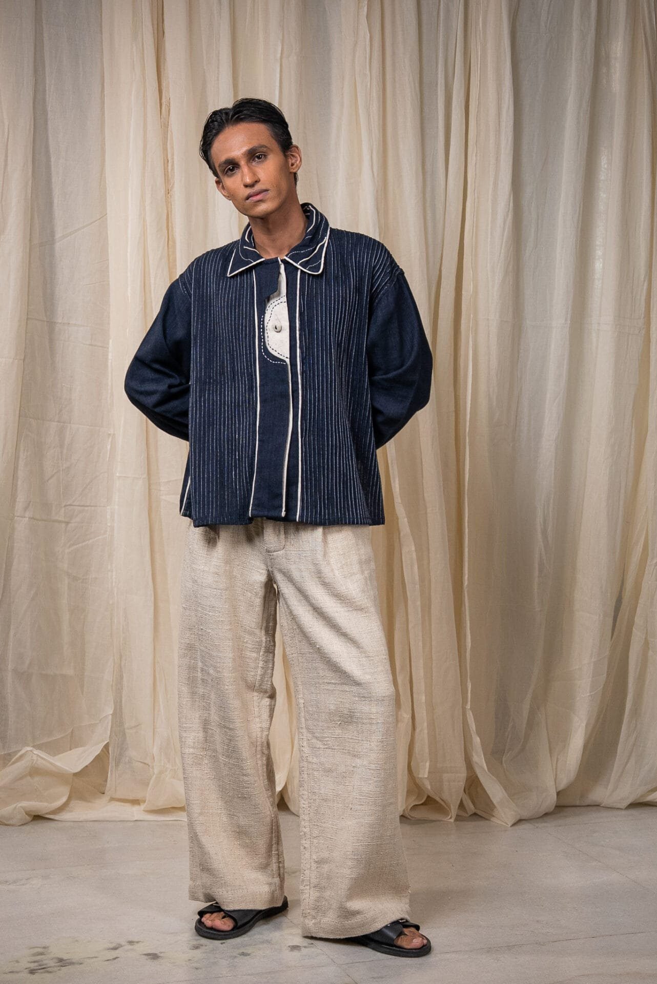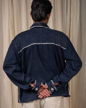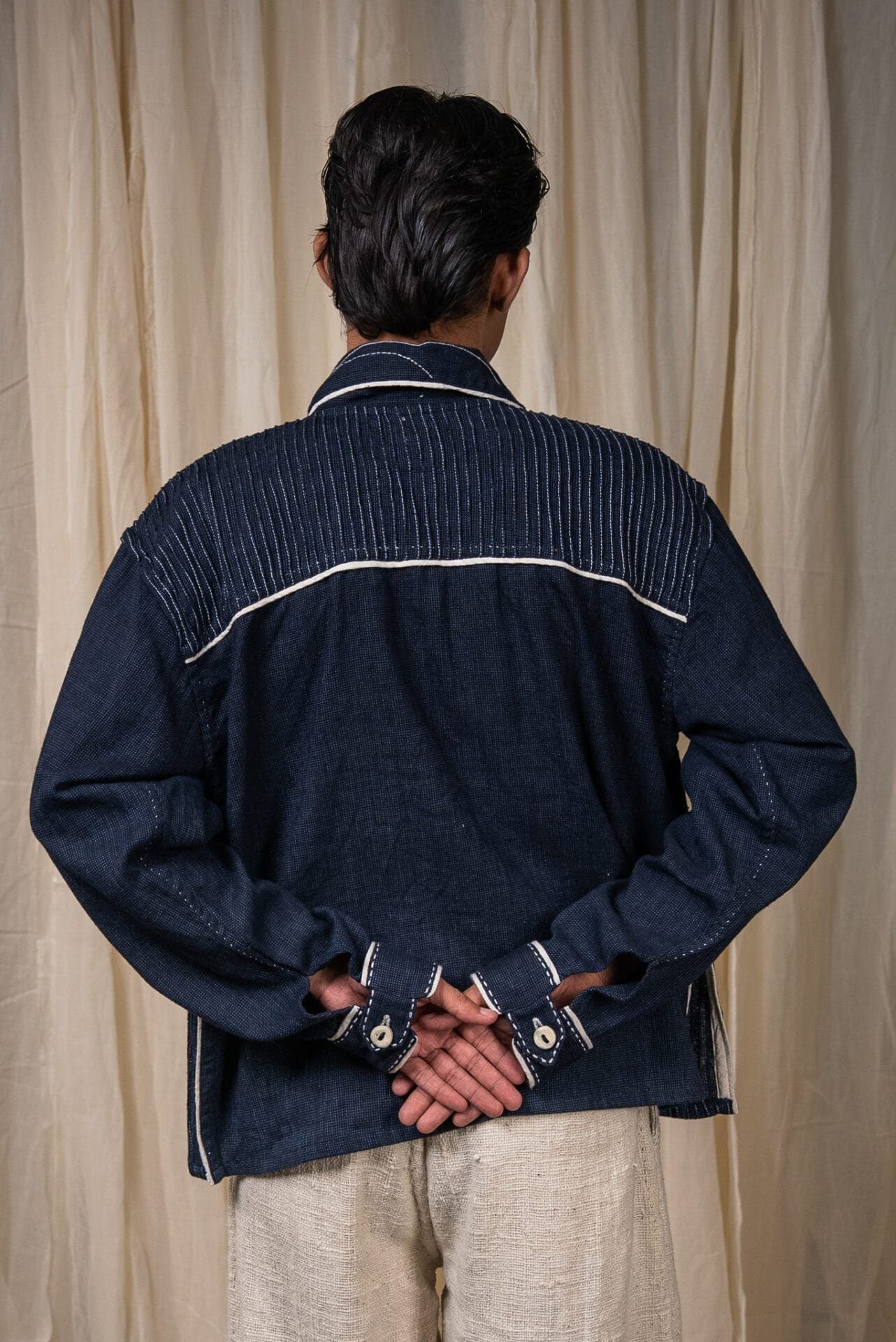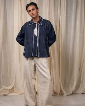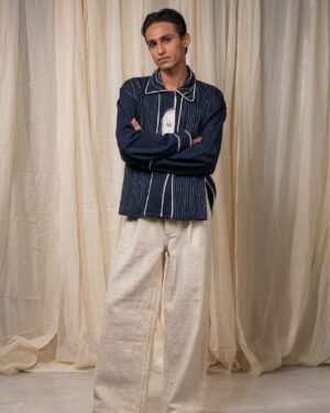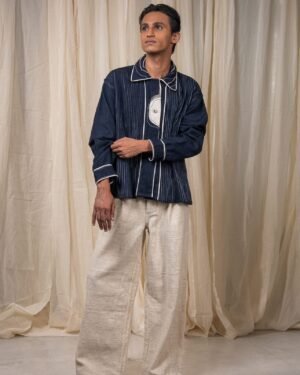 The silhouette is finished with a flap on the sleeve secured with a button, and detailed with Kora Kala cotton piping that traces the edges in soft contrast. Embroidery of the brand logo sits on the collar - rendered through backstitch variations, Kantha, and couching.