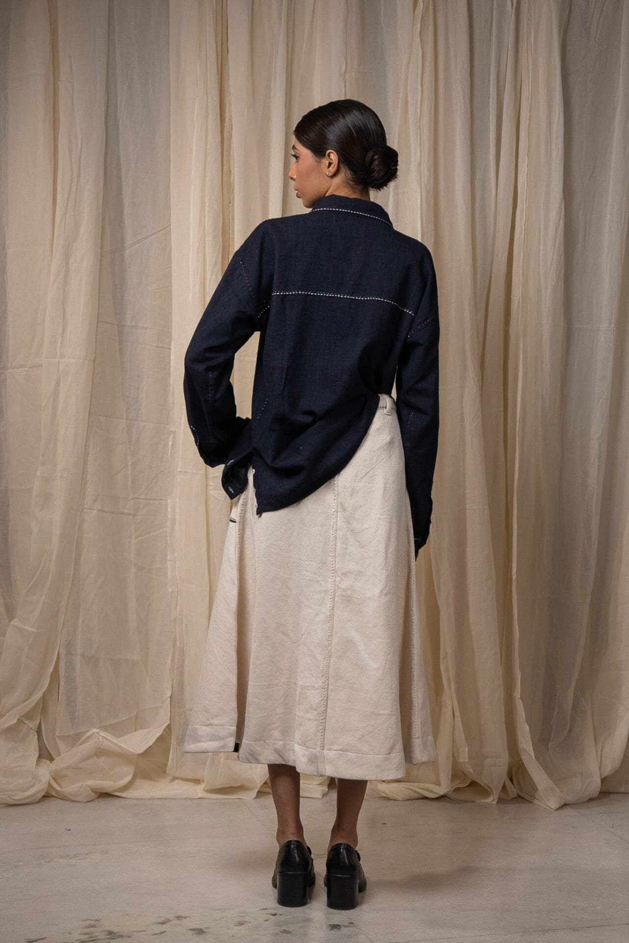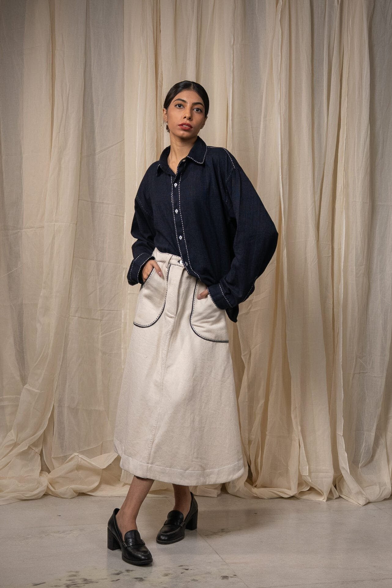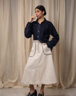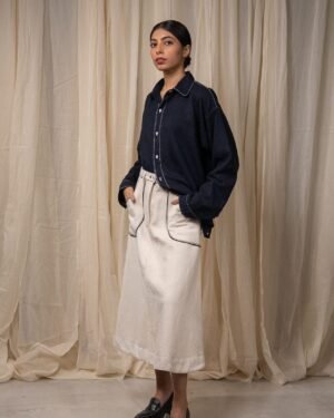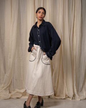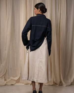Crafted from 100% cotton fibres in handwoven denim, this skirt features an easy A-line silhouette. Patch pockets are highlighted with fine Kantha embroidery and traced with delicate Chanderi piping. Finished with a front placket and drawstrings at the waist for adjustability.
