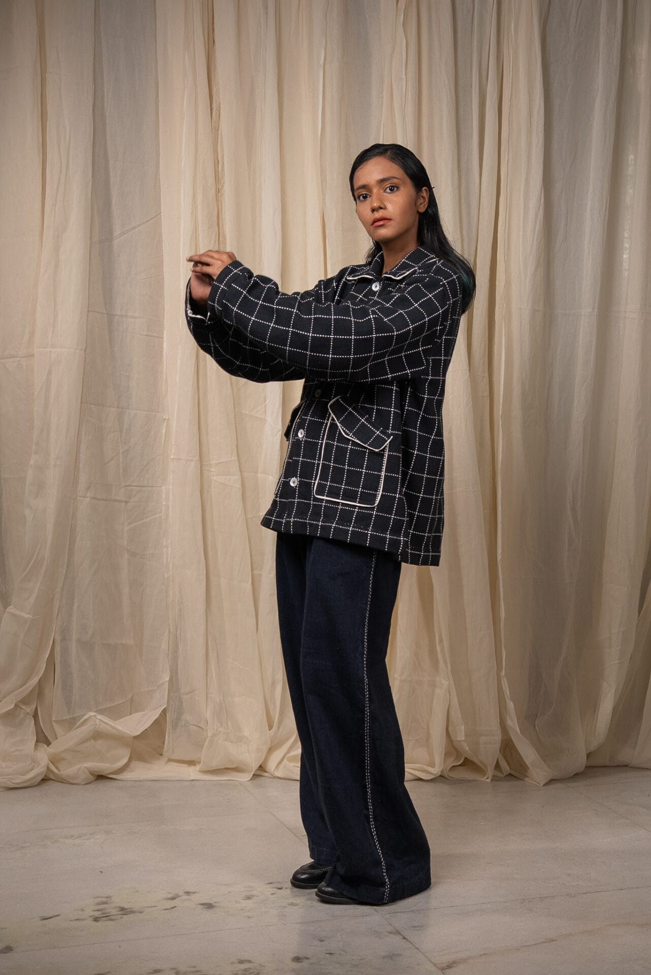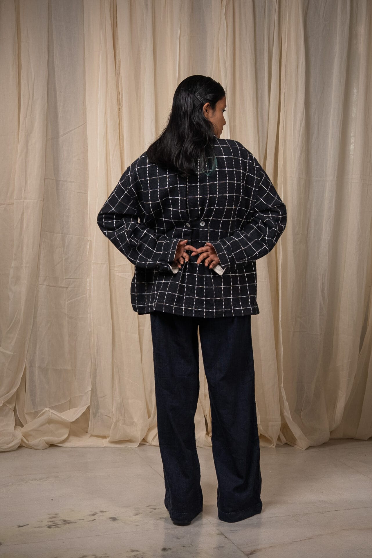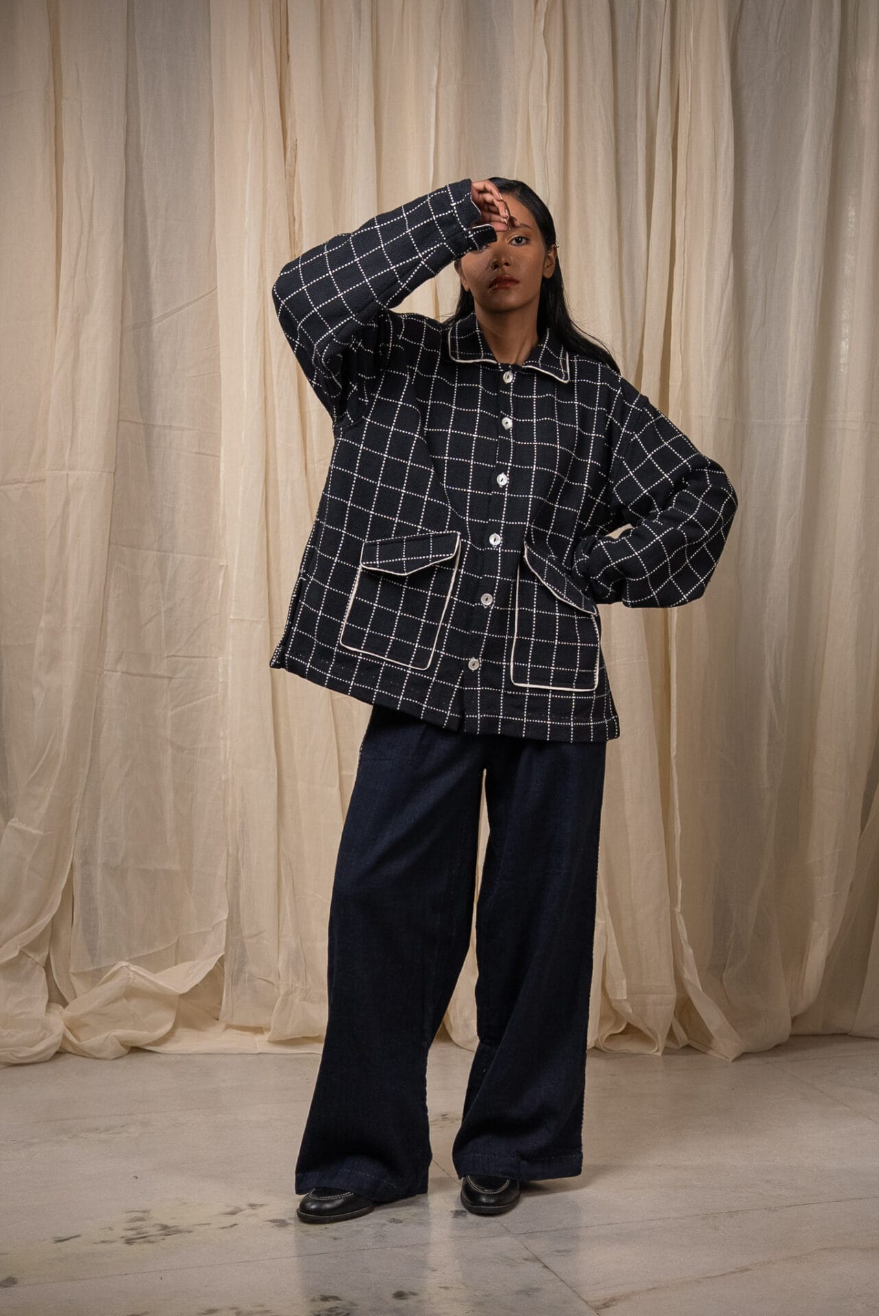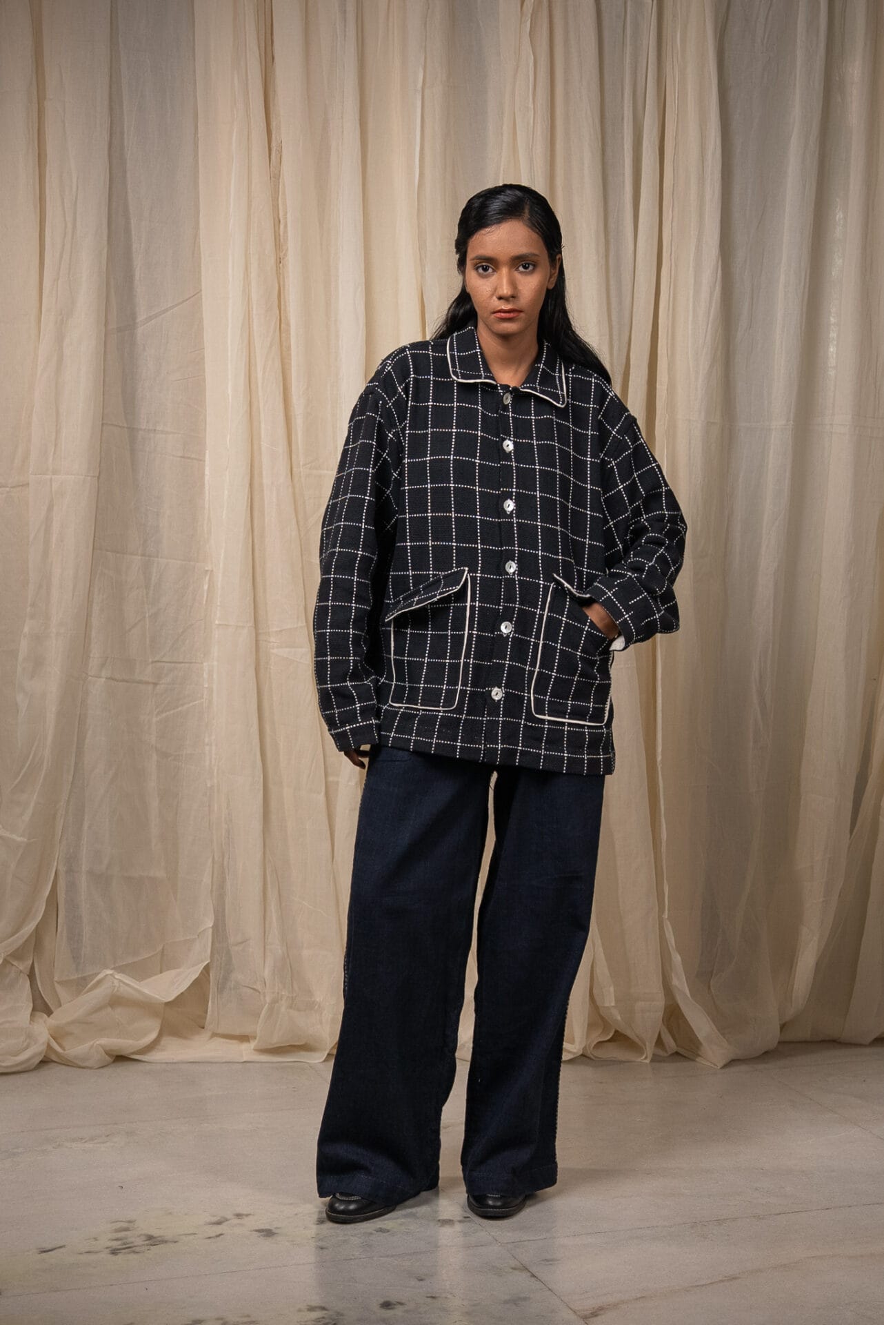 Crafted from 100% cotton fibres and natural materials, this thick handwoven jacket is made from azo-free dyed cotton in large woven checks. Detailed with undyed Kala Cotton piping, it features patch pockets for utility and foldable cuffs for styling versatility. Can be worn on its own or layered, making it a functional, trans-seasonal piece.