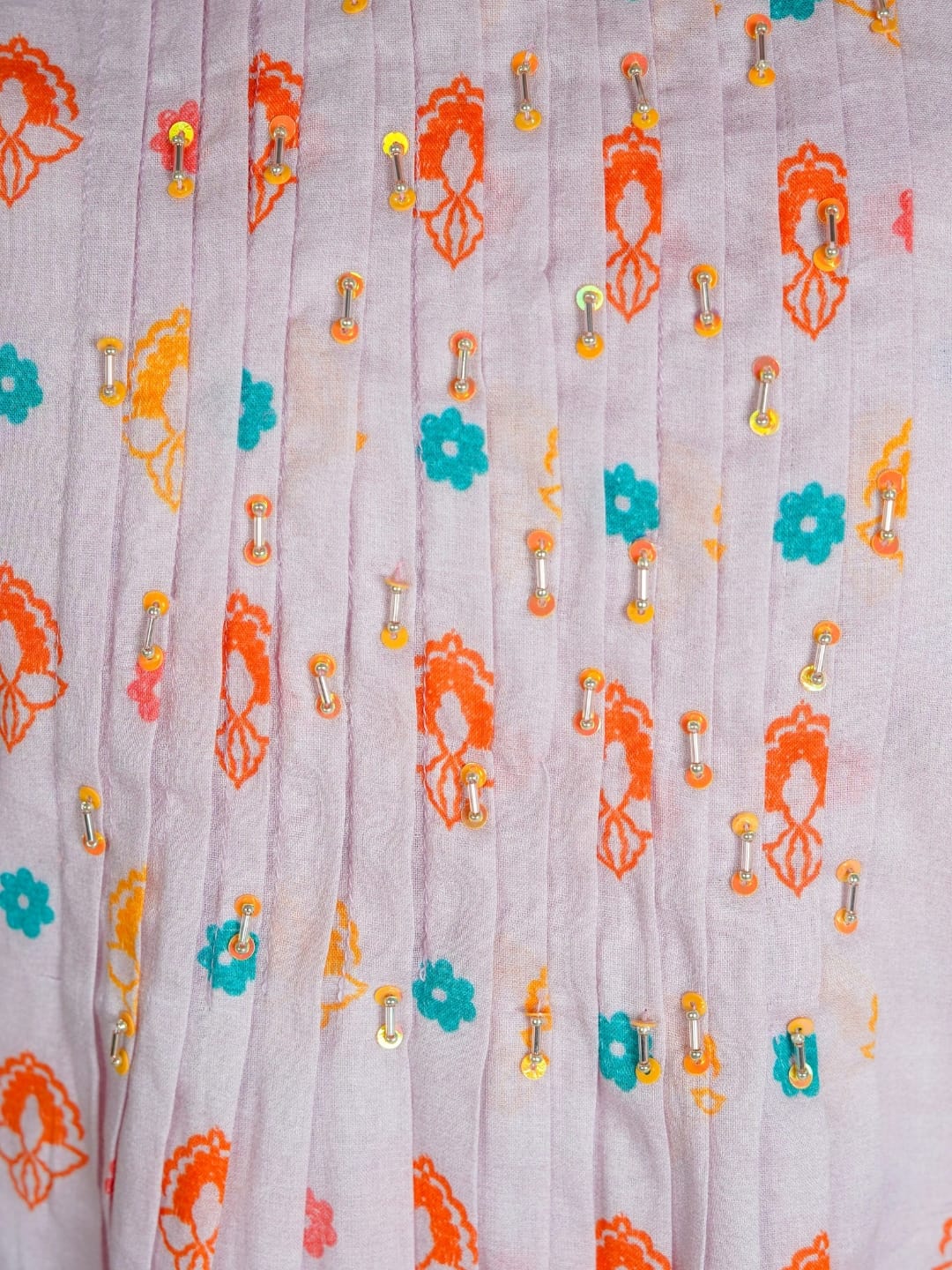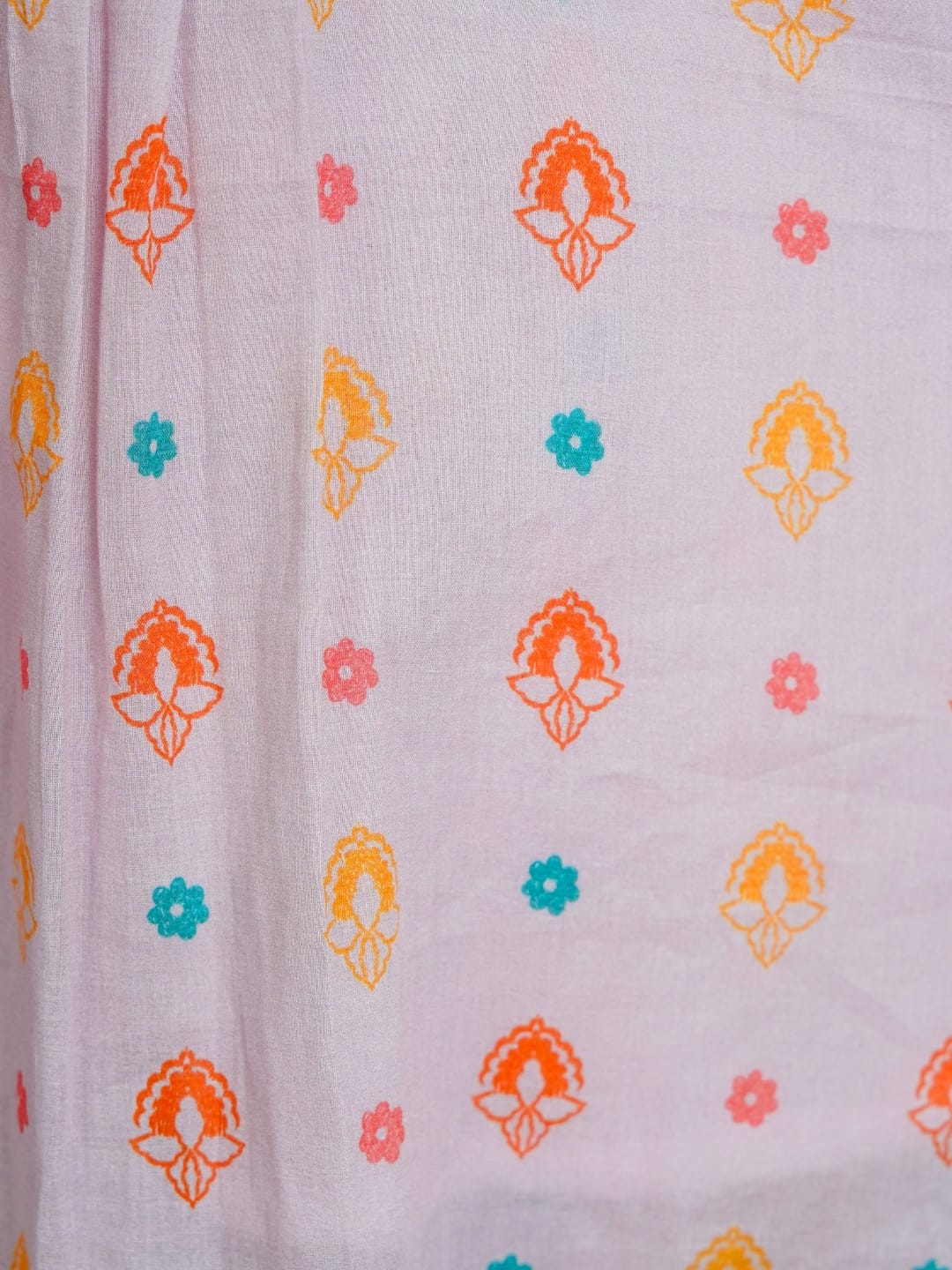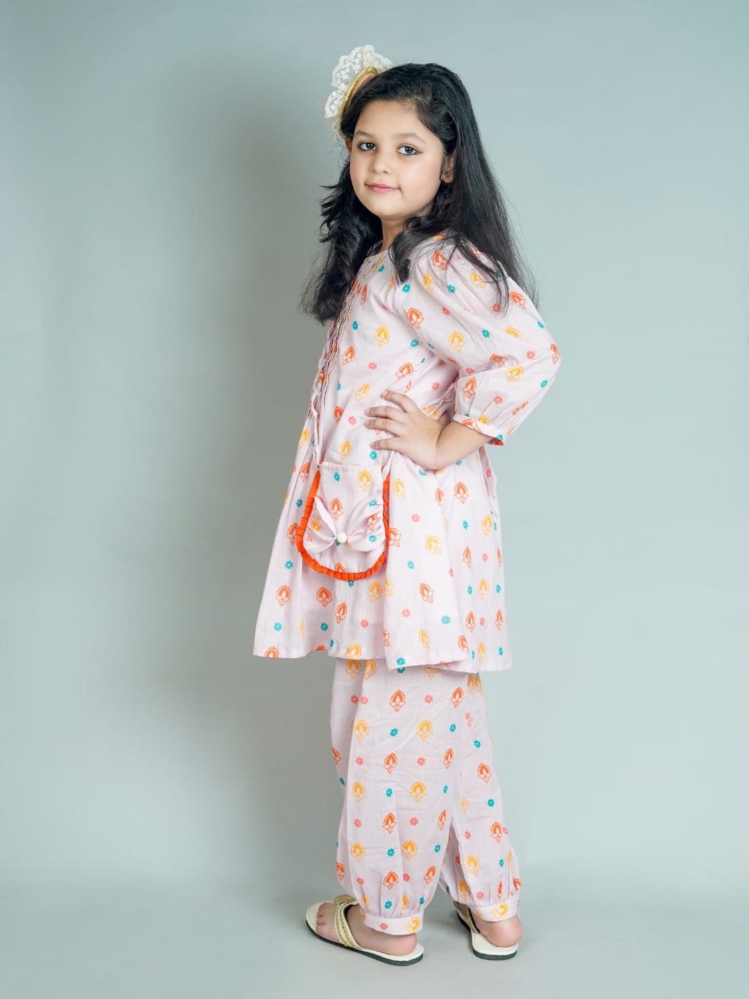 A cute and comfy outfit for your little star! This pastel pink mul cotton kurta set comes with a matching salwar pant and a fun sling bag – perfect for festivals, outings, or twirl-worthy moments.