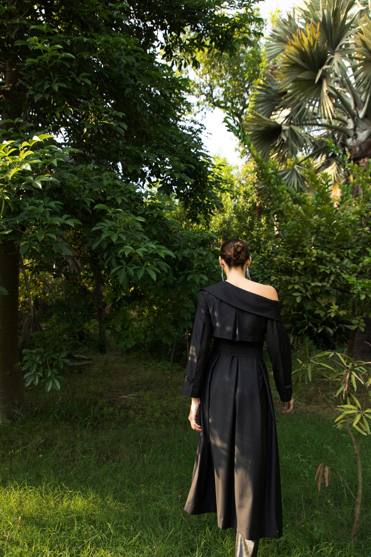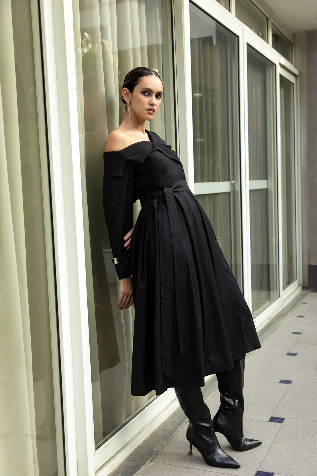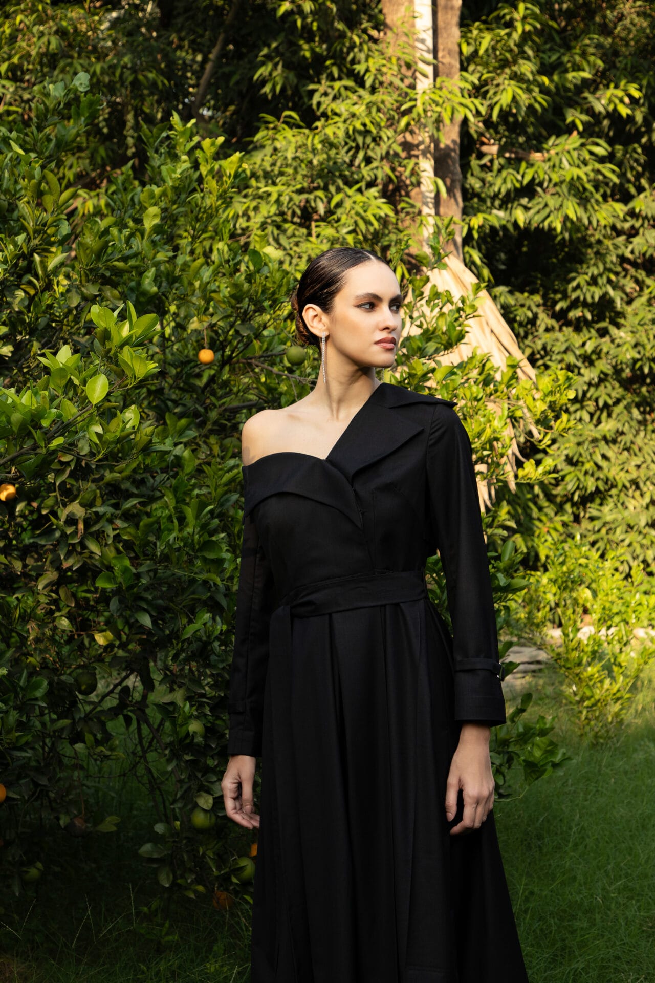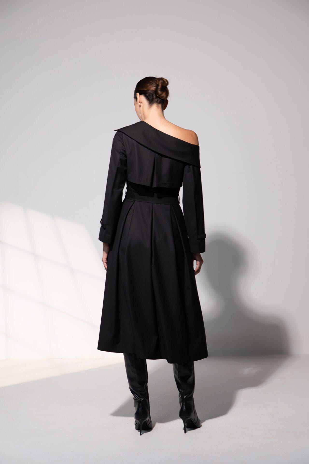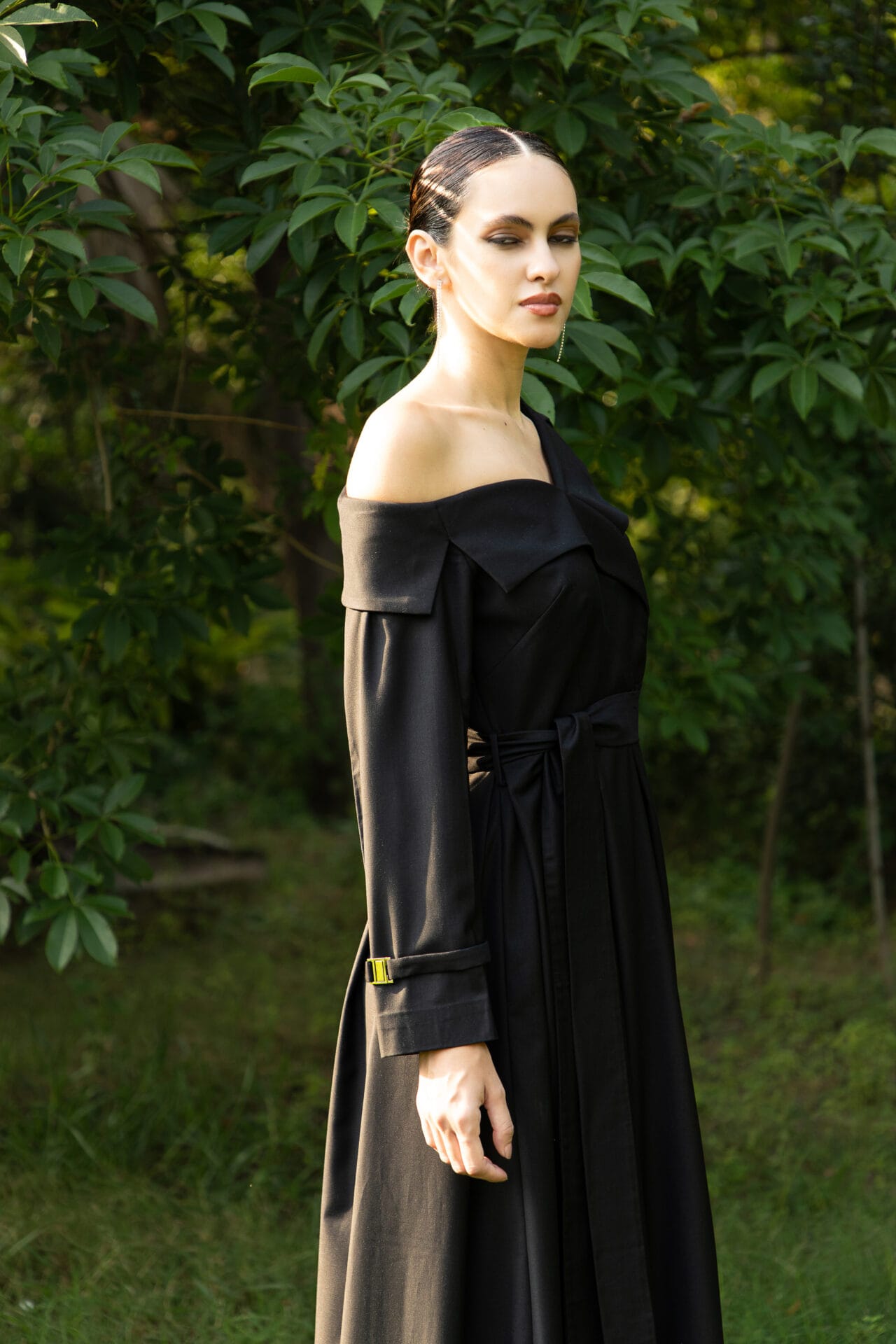 A statement in structured elegance, this off-shoulder trench dress is crafted from supple Terry Rayon, lined with Modal Satin for an indulgent finish. The front overlap fastening and silver metal clasps on the sleeves lend a modern edge, while the box-pleated skirt silhouette creates graceful movement. Functional side pockets add a touch of effortless practicality.