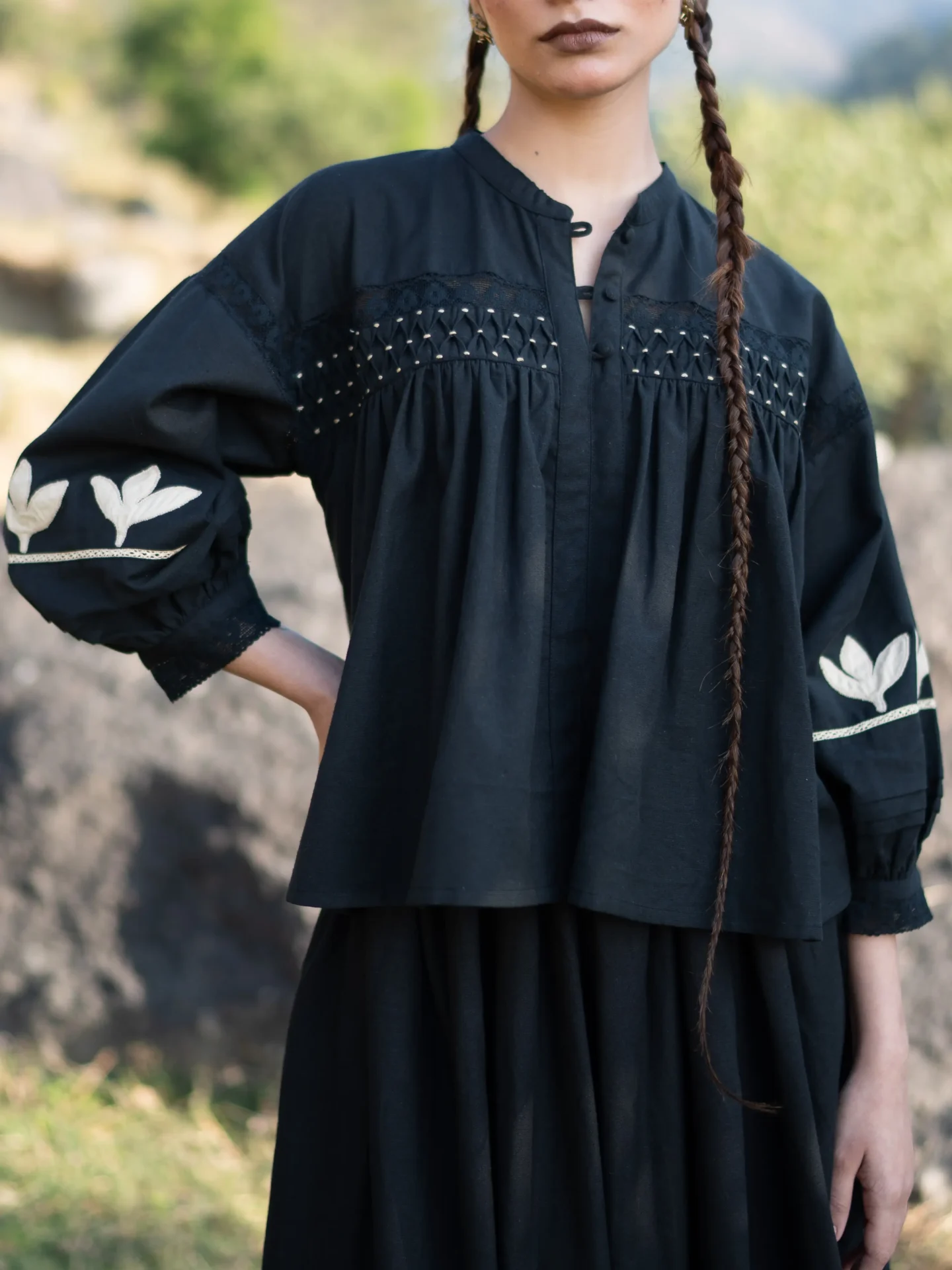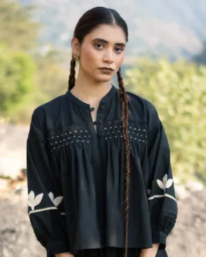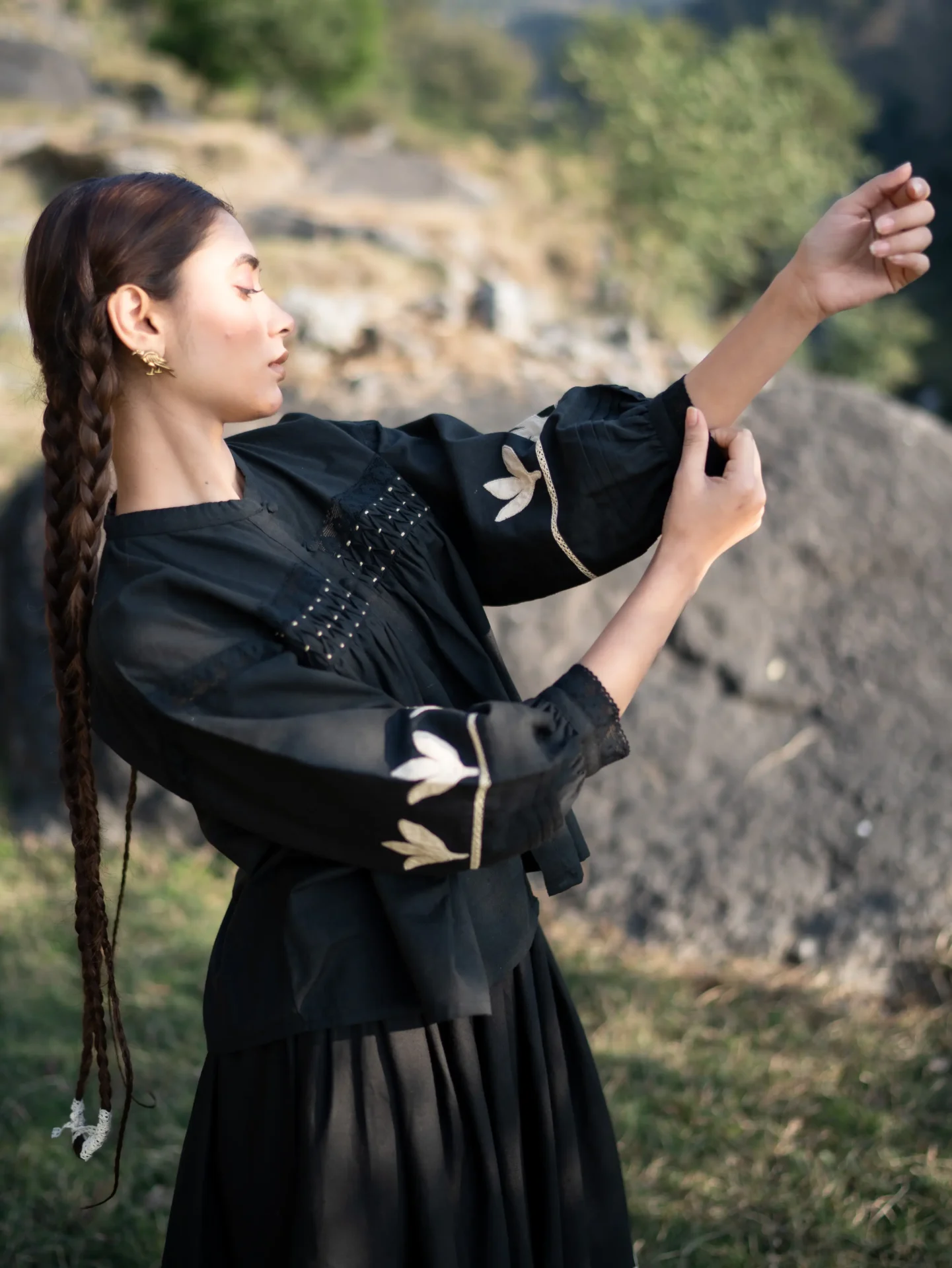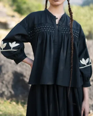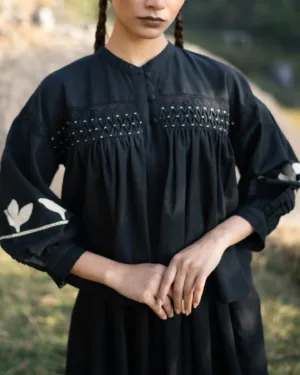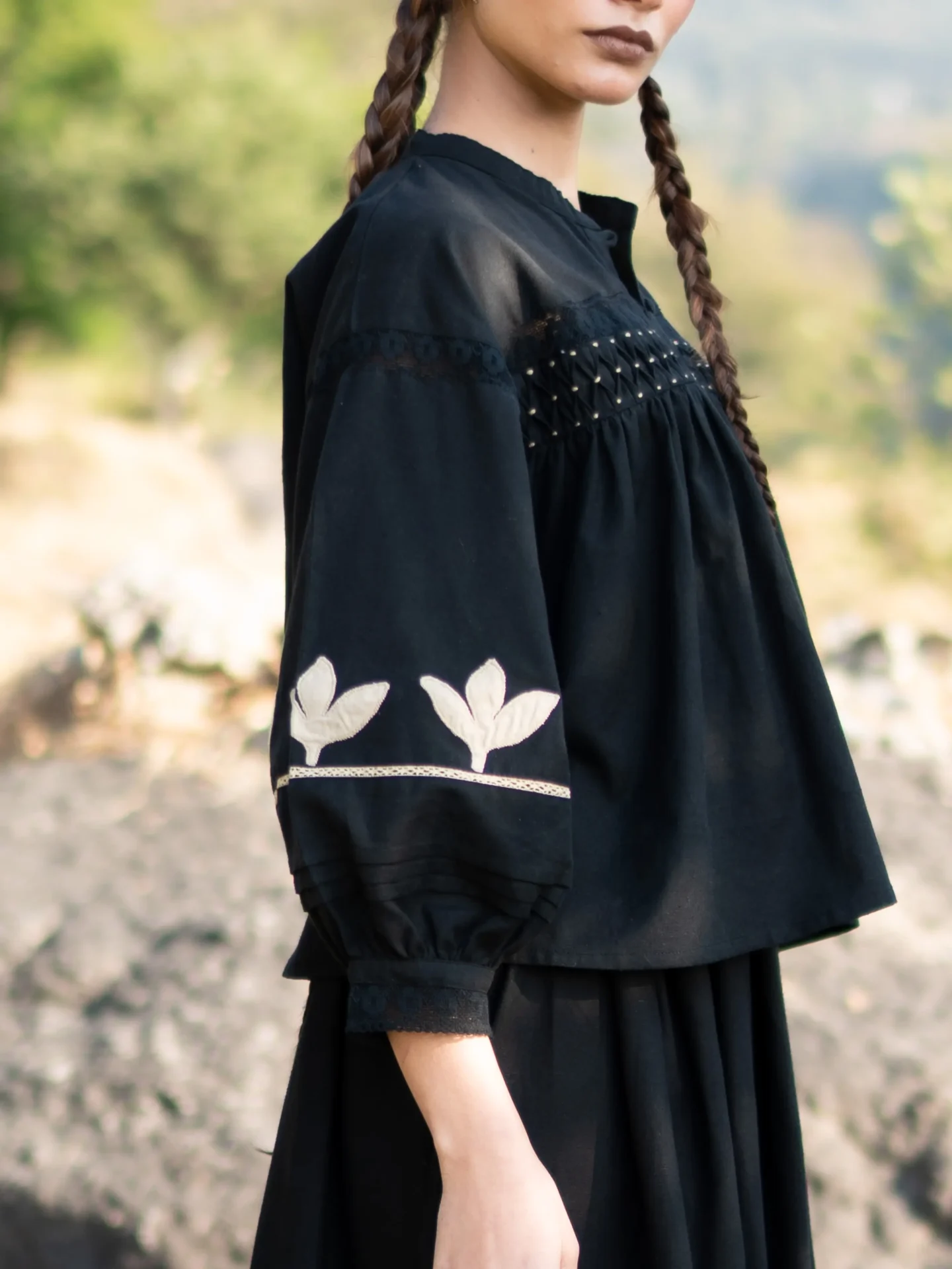 Crafted in breathable cotton, this black blousy top features a fully hand-smocked front yoke, created through hundreds of precise stitches. The lace trims at the front and cuffs bring softness, while the sleeves are adorned with hand-appliqué details—making every piece unique and rich in human touch