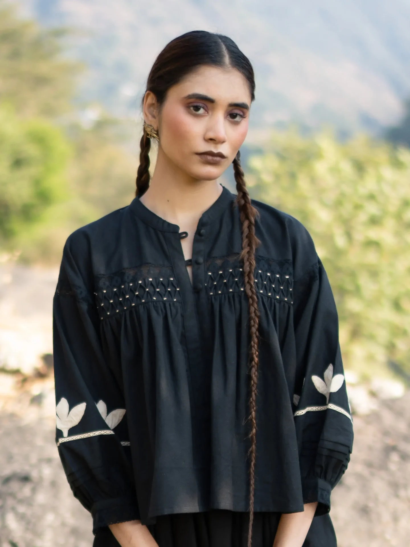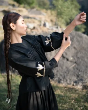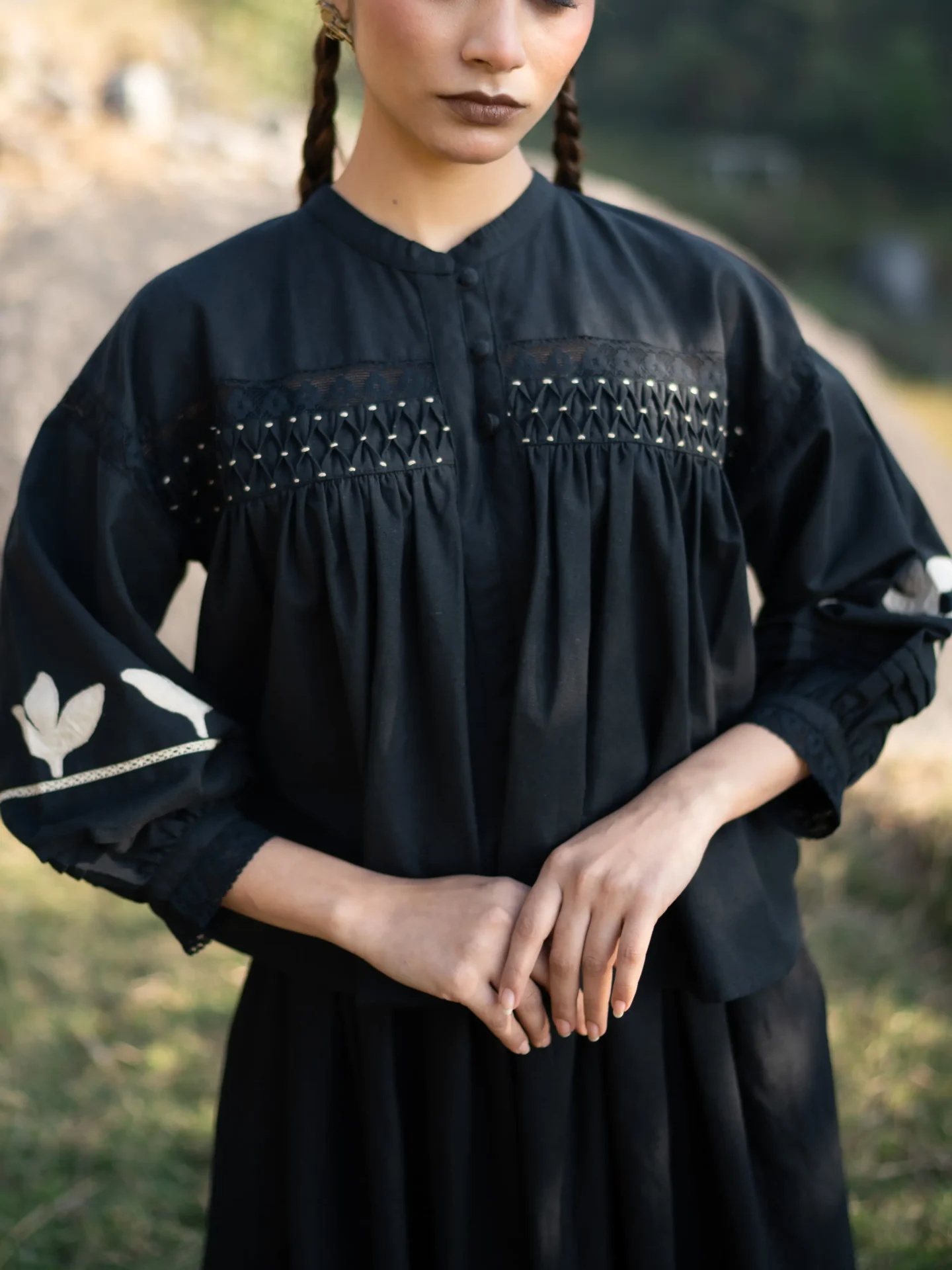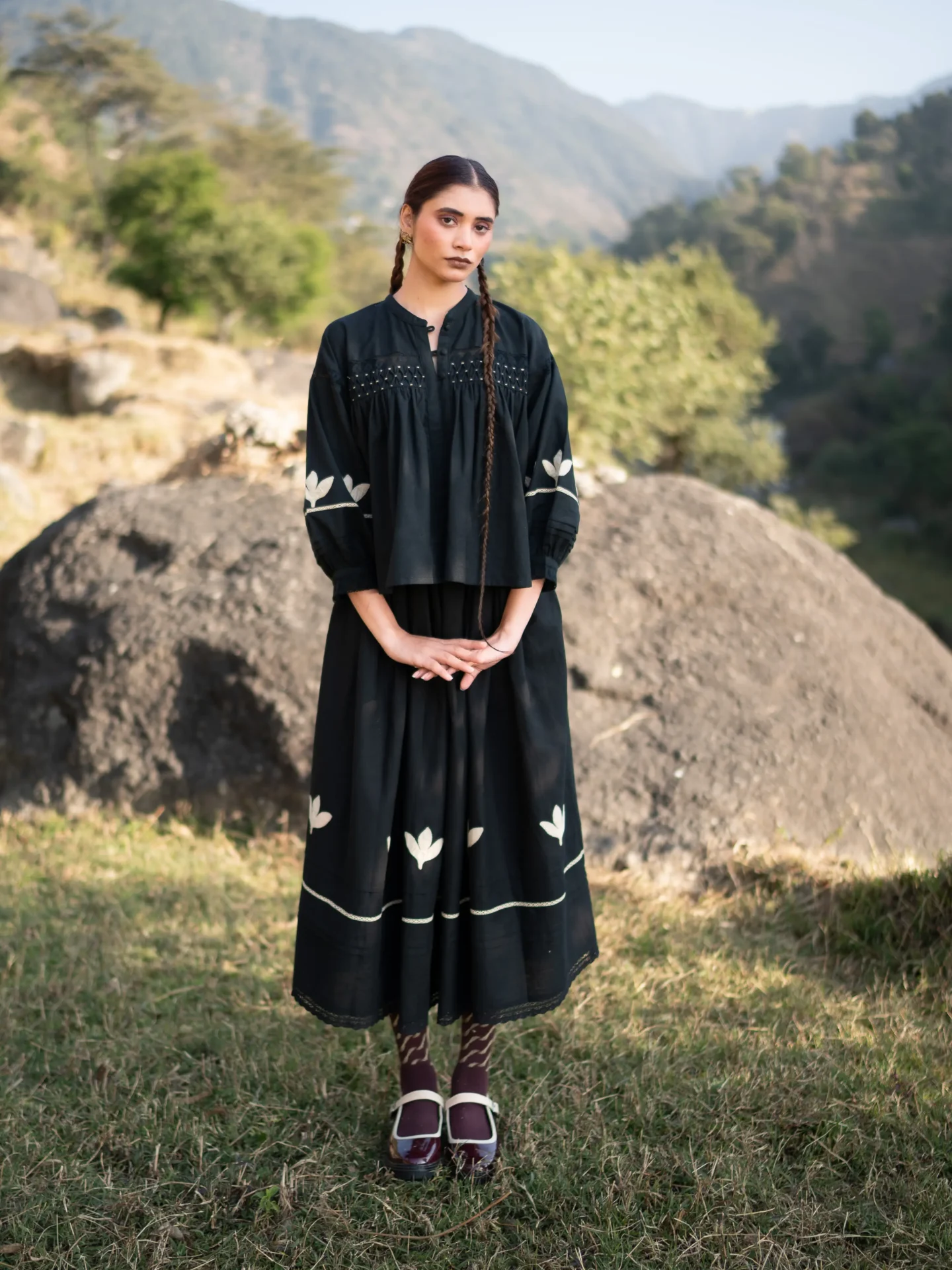 Crafted in breathable cotton, this black blousy top features a fully hand-smocked front yoke, created through hundreds of precise stitches. The lace trims at the front and cuffs bring softness, while the sleeves are adorned with hand-appliqué details—making every piece unique and rich in human touch