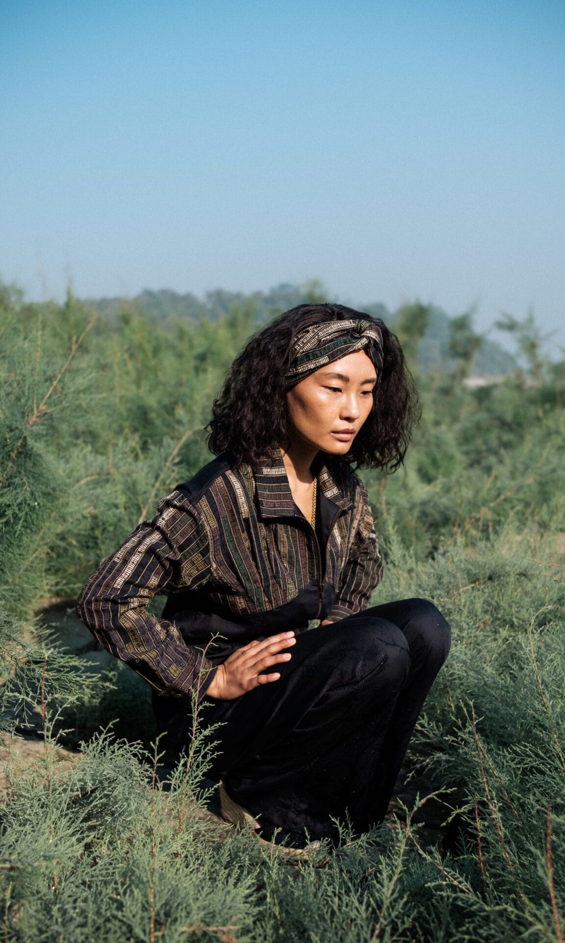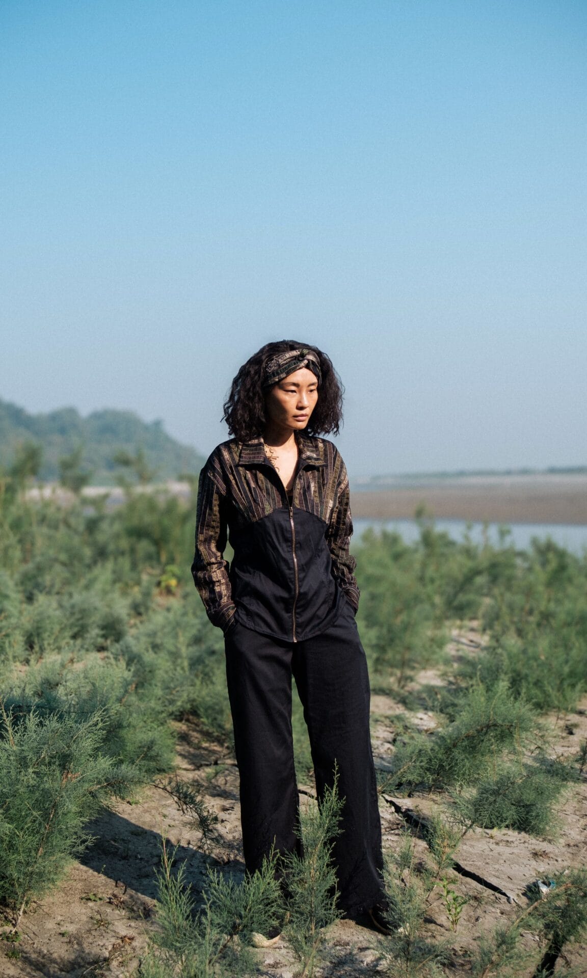 The garment is made from hand woven upcycled fabric and so the color might vary slightly for each batch.