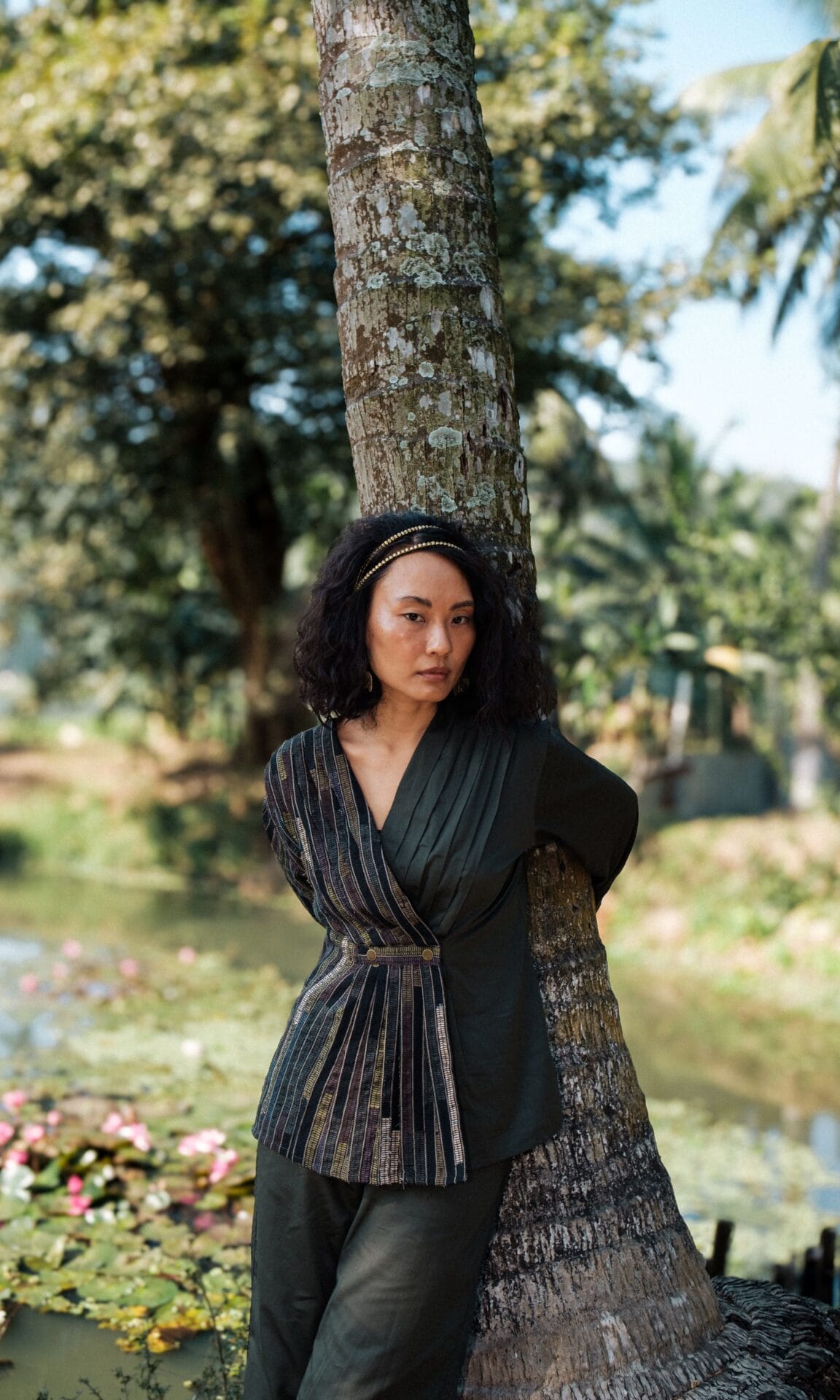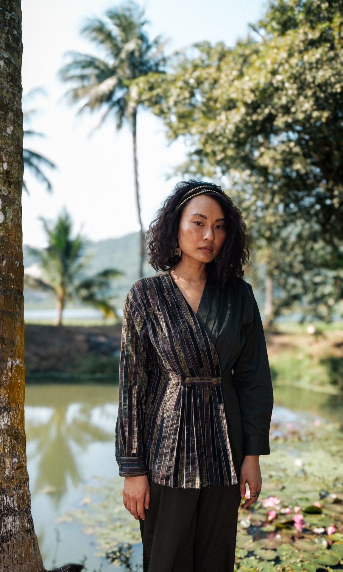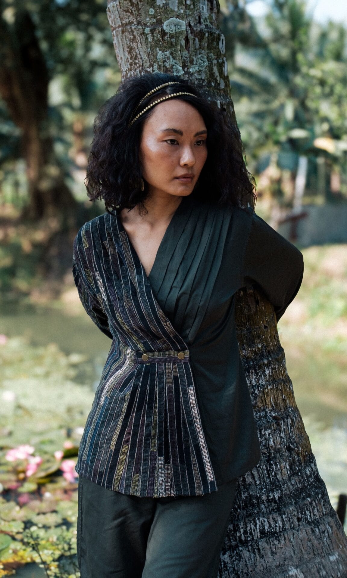 This top featuring pleats designed from upcycled fabric, made using post production waste, pairs perfectly with our flared pants.