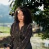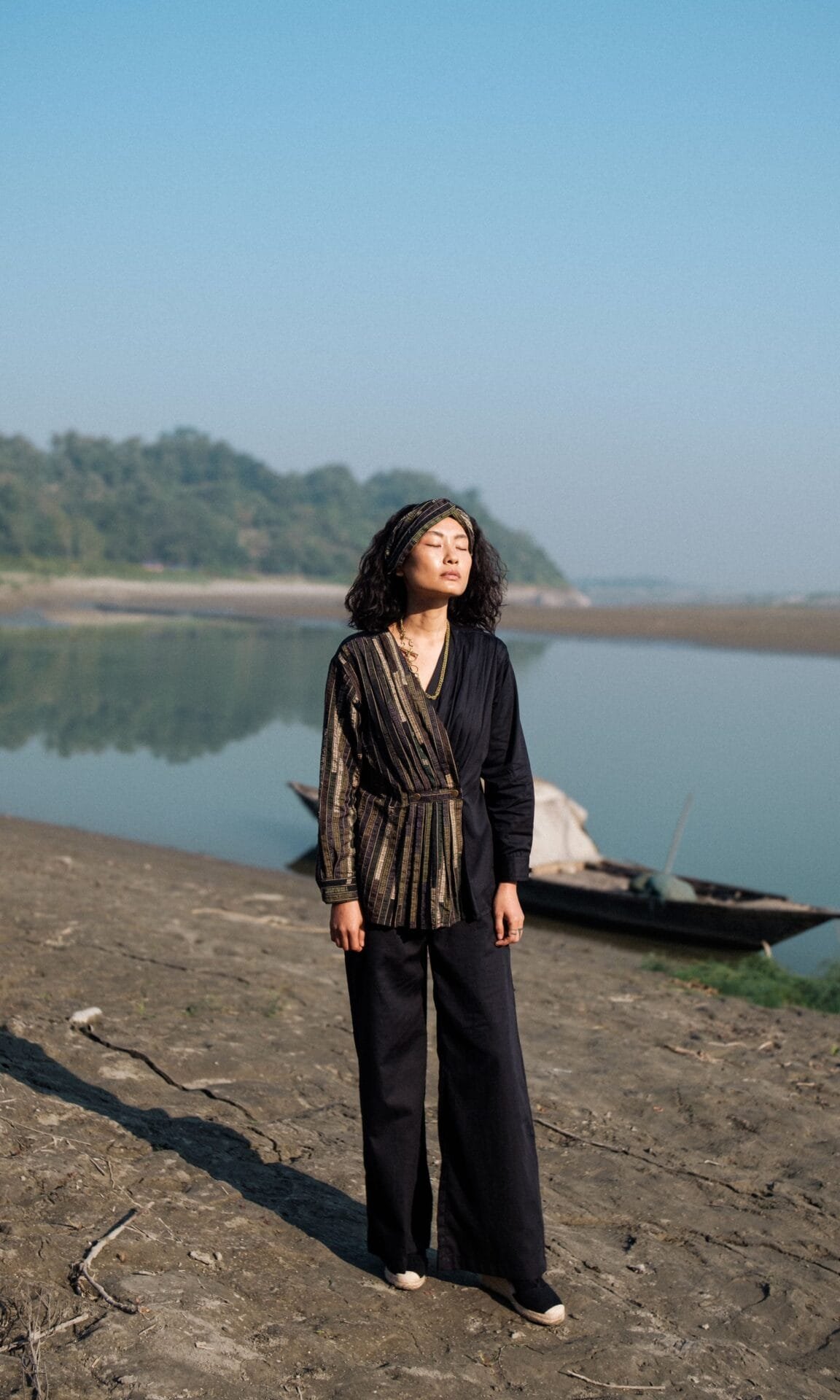 The garment is made from hand woven upcycled fabric and so the color might vary slightly for each batch.